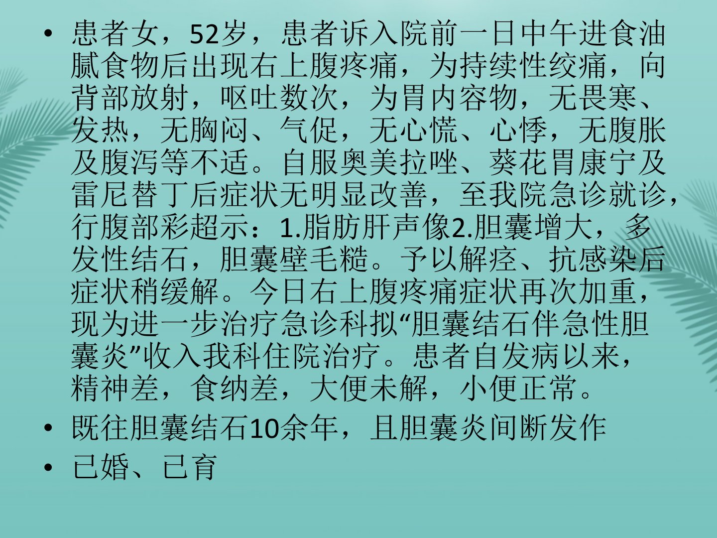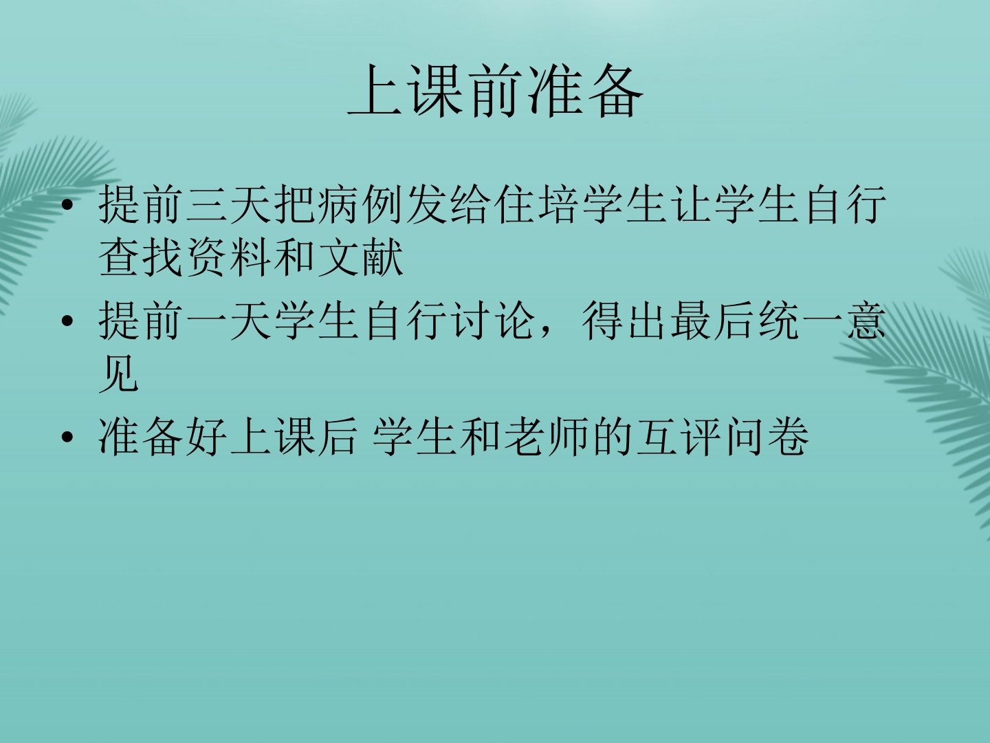 作为医生我组织了一次病例教学课。课前三天将病例发给住培学生要求其自行查资料并在前一天讨论得出统一意见同时准备好课后师生互评问卷。此次病例为52岁女性因进食油腻后右上腹绞痛入院有胆囊结石病史彩超示脂肪肝、胆囊增大多发性结石。查体见急性面容右上腹压痛墨菲氏征阳性。辅助检查示白细胞计数及中性细胞百分率升高上腹部CT检查示胆囊多发结石并急性胆囊炎等。课上要求学员分组讨论总结出诊断依据与鉴别诊断初步诊断为胆囊结石并急性胆囊炎。鉴别诊断包括急性胰腺炎、胃或十二指肠球部溃疡并穿孔等。此外课上还讨论了入院处理及诊疗计划、急性结石性胆囊炎的处理原则以及术中操作的技巧或注意事项。