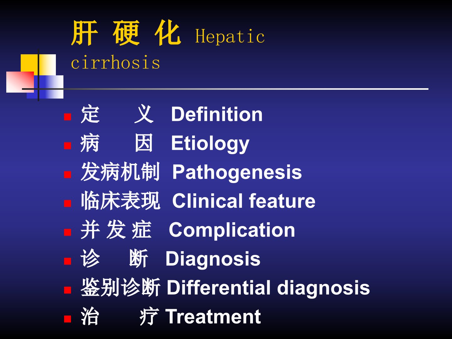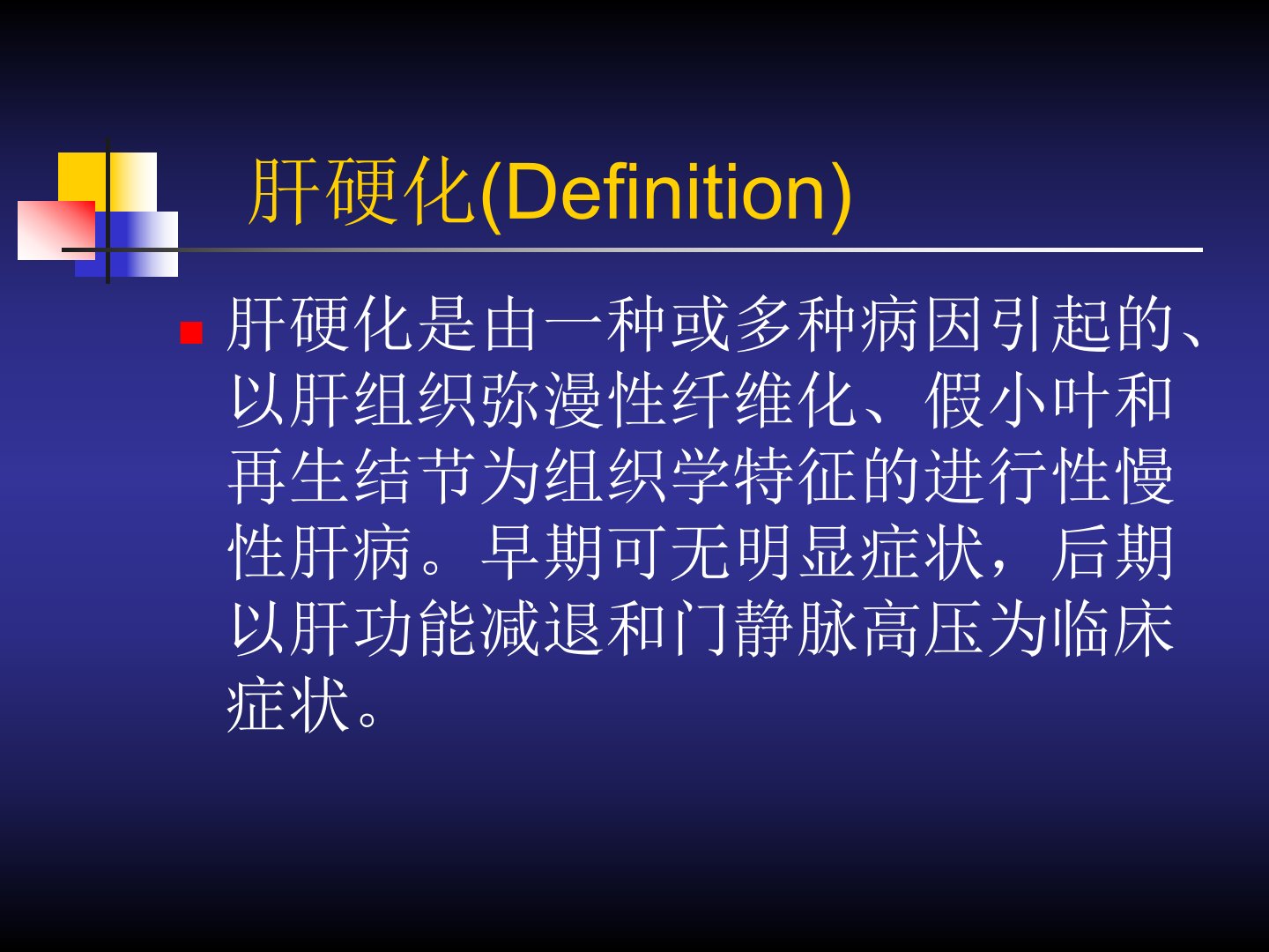 肝硬化是由一种或多种病因引起的慢性肝病特征为肝组织弥漫性纤维化、假小叶和再生结节形成。我国是常见疾病和主要死亡病因之一发病高峰年龄在3548岁。病因多样病毒性肝炎(尤其HBV)占6080酒精中毒、胆汁淤积、循环障碍、药物或化学毒物、寄生虫感染、遗传代谢疾病等也是重要原因。肝硬化分小结节性、大结节性、大小结节混合性及不完全分隔性。其发病机制涉及肝细胞变性坏死、纤维结缔组织增生导致门静脉高压和肝功能减退。临床表现分代偿期和失代偿期后者包括肝功能减退和门脉高压症如腹水、脾大、食管胃底静脉曲张等。并发症包括上消化道出血、胆石症、感染、门静脉血栓形成、电解质紊乱、肝肾综合征、肝肺综合征和原发性肝癌等。诊断依赖实验室检查、影像学检查和肝活组织检查。治疗原则为去除或减轻病因、保护或改善肝功能、治疗并发症。代偿期力求稳定病情失代偿期则改善肝功能、治疗并发症、延缓或减少对肝移植的需求。