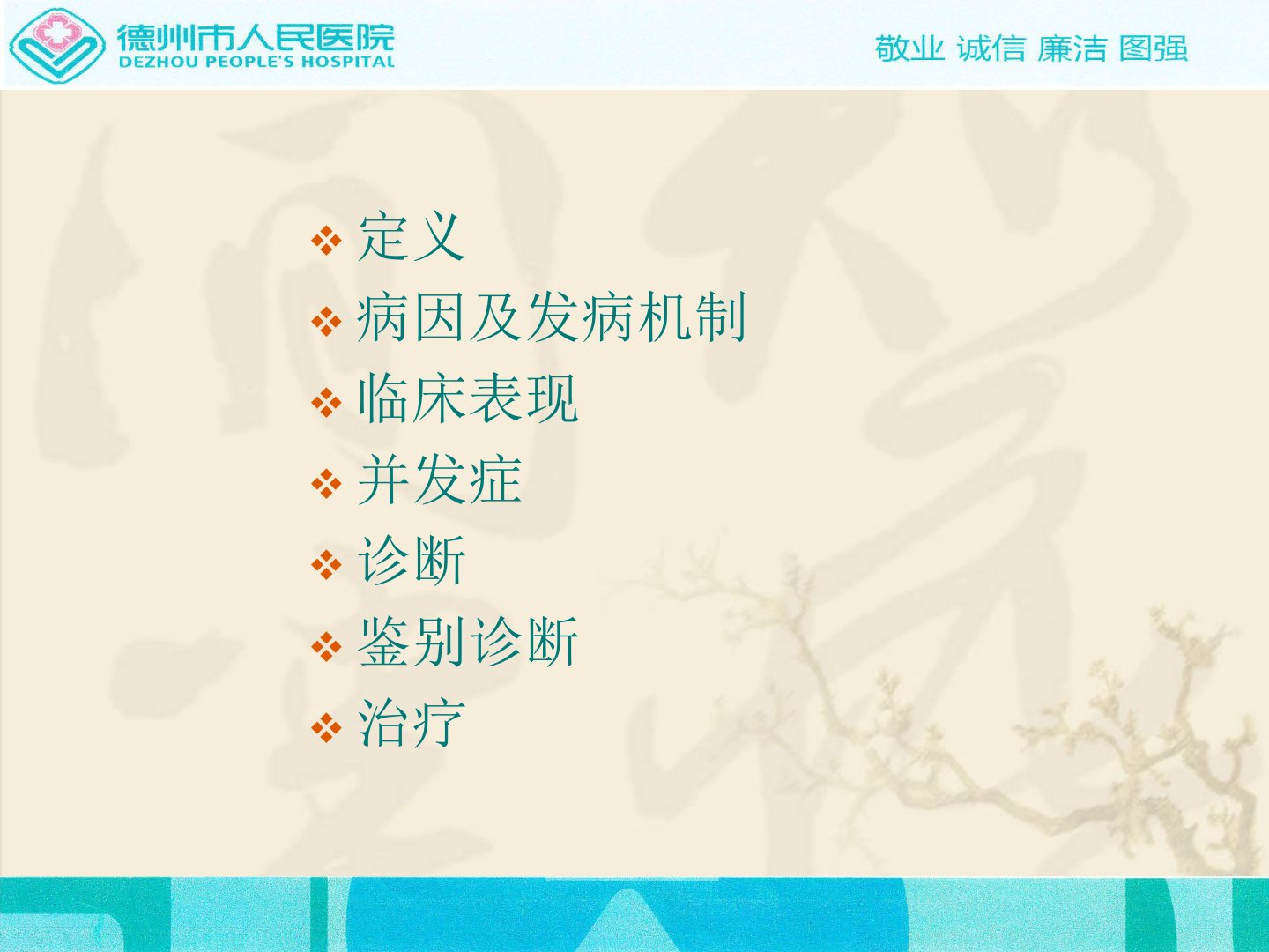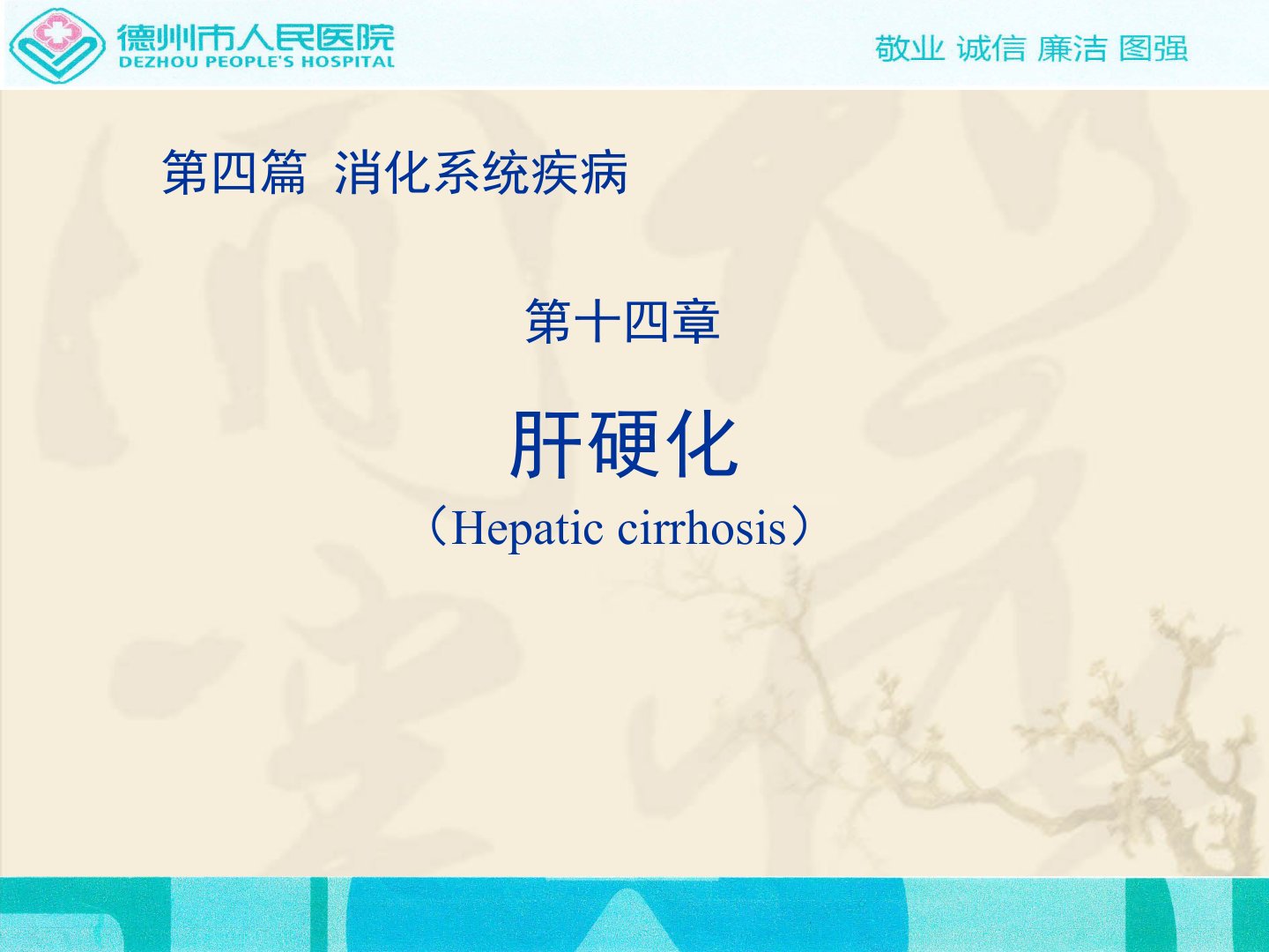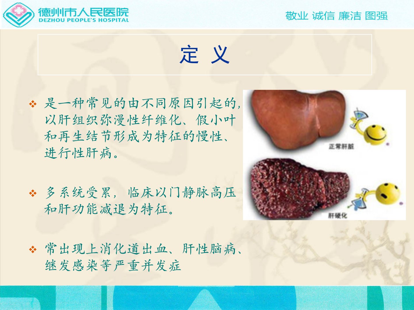 肝硬化摘要肝硬化是常见的慢性、进行性肝病以肝组织弥漫性纤维化、假小叶和再生结节形成为特征多系统受累临床以门静脉高压和肝功能减退为特征常伴上消化道出血、肝性脑病等严重并发症。病因包括病毒性肝炎、酒精中毒、胆汁淤积、循环障碍、药物或化学毒物、免疫紊乱、寄生虫感染、遗传和代谢障碍等十大类。病理网状支架塌陷、再生结节形成、假小叶形成导致肝内血循环紊乱形成门脉高压。临床表现起病隐匿进展缓慢分代偿期和失代偿期。代偿期症状轻失代偿期则有肝功能减退、门静脉高压等全身多系统表现。并发症包括上消化道出血、胆石症、肝性脑病、感染、门静脉血栓形成等。治疗无特效治疗代偿期旨在延缓肝功能失代偿失代偿期以改善肝功能、预防并发症为目标包括保护或改善肝功能、治疗门静脉高压症状及其并发症等。手术治疗包括分流术、断流术、脾切除术。患者需严格禁酒、禁用损害肝脏的药物保持低盐饮食避免感染。