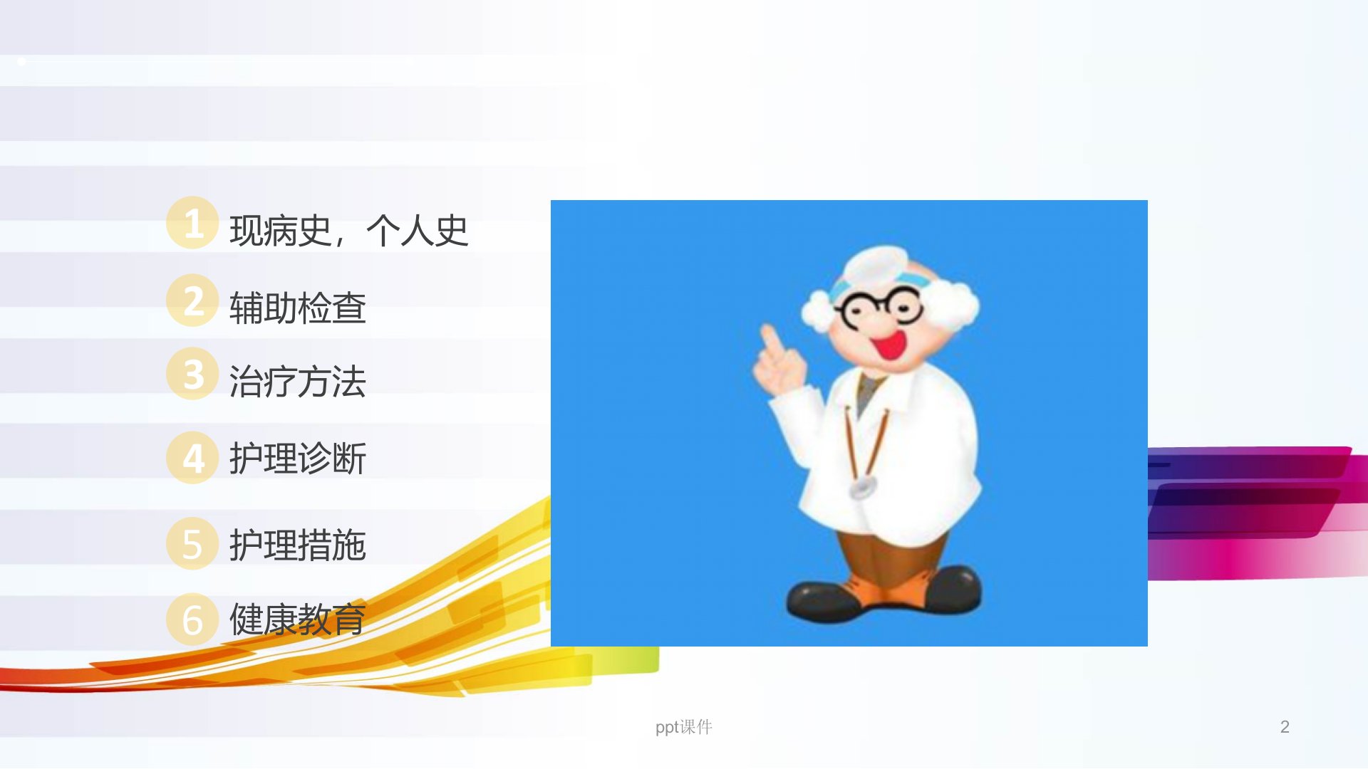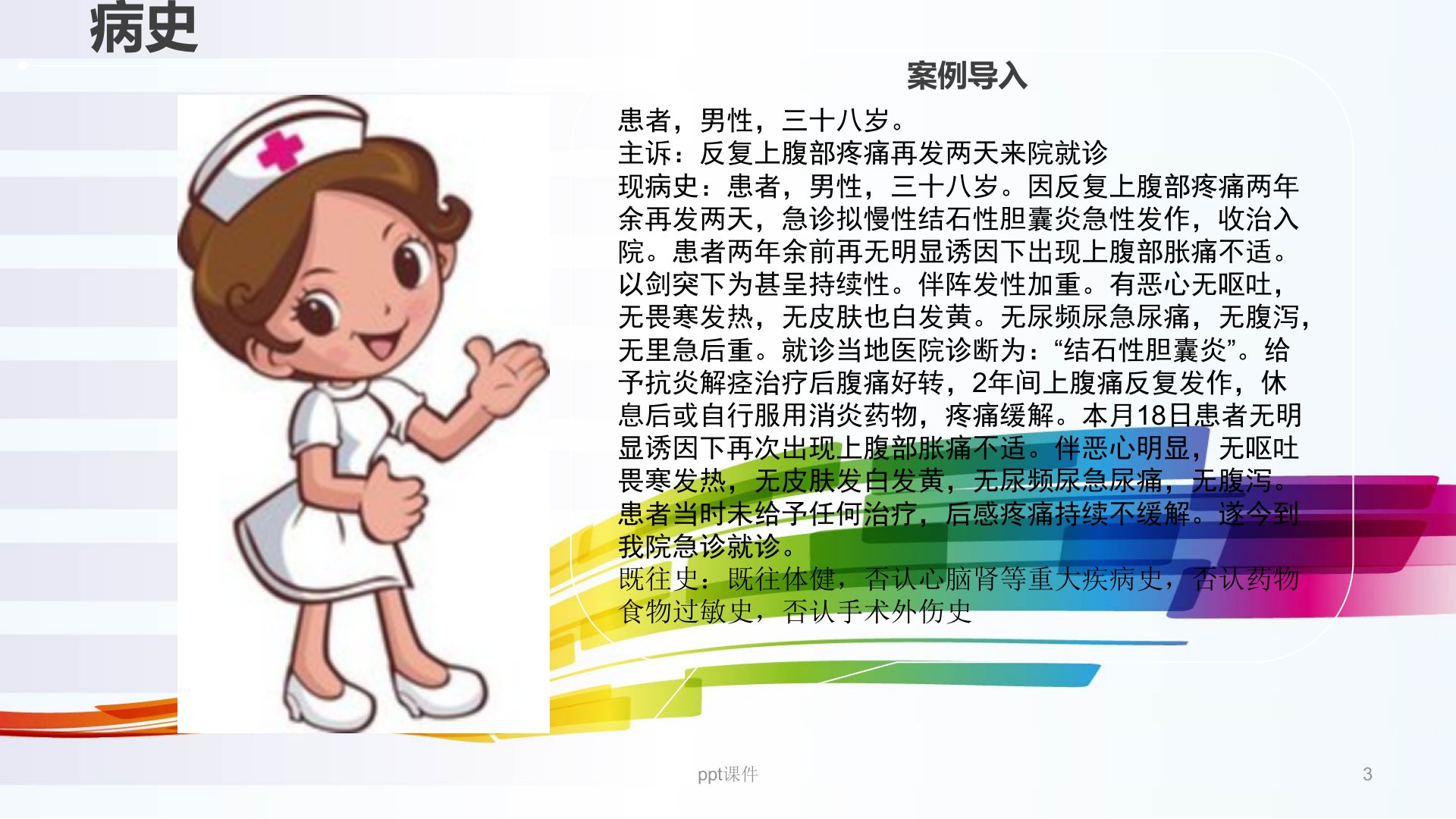 慢性结石性胆囊炎PPT课件摘要案例导入患者男性38岁反复上腹部疼痛两年余再发两天急诊拟慢性结石性胆囊炎急性发作收治入院。患者两年前无明显诱因出现上腹部胀痛诊断为“结石性胆囊炎”抗炎解痉治疗后好转但两年间上腹痛反复发作。本月18日症状再发疼痛持续不缓解遂来院就诊。患者既往体健否认重大疾病史、过敏史、手术外伤史。临床表现与辅助检查慢性结石性胆囊炎表现为右上腹阵发性绞痛或胀痛可放射至右肩等部位常伴有恶心呕吐等消化道反应及轻度或中度发热。B超、CT提示胆囊结石、胆囊炎实验室检查白细胞计数上升血尿淀粉酶上升提示炎症。治疗方法非手术治疗包括禁食、解痉、输液、抗感染、营养支持、纠正水及电解质和酸碱代谢失衡。手术治疗采用腹腔镜微创保胆取石术创伤小、恢复快、并发症少。护理诊断与措施护理诊断包括疼痛、导管滑脱风险、跌倒危险、潜在并发症等。护理措施有控制疼痛、妥善固定导管、防止患者跌倒、密切观察病情变化、提供饮食护理等。健康教育包括出院指导、饮食指导、起居规律、按医嘱用药及定期复查等内容。