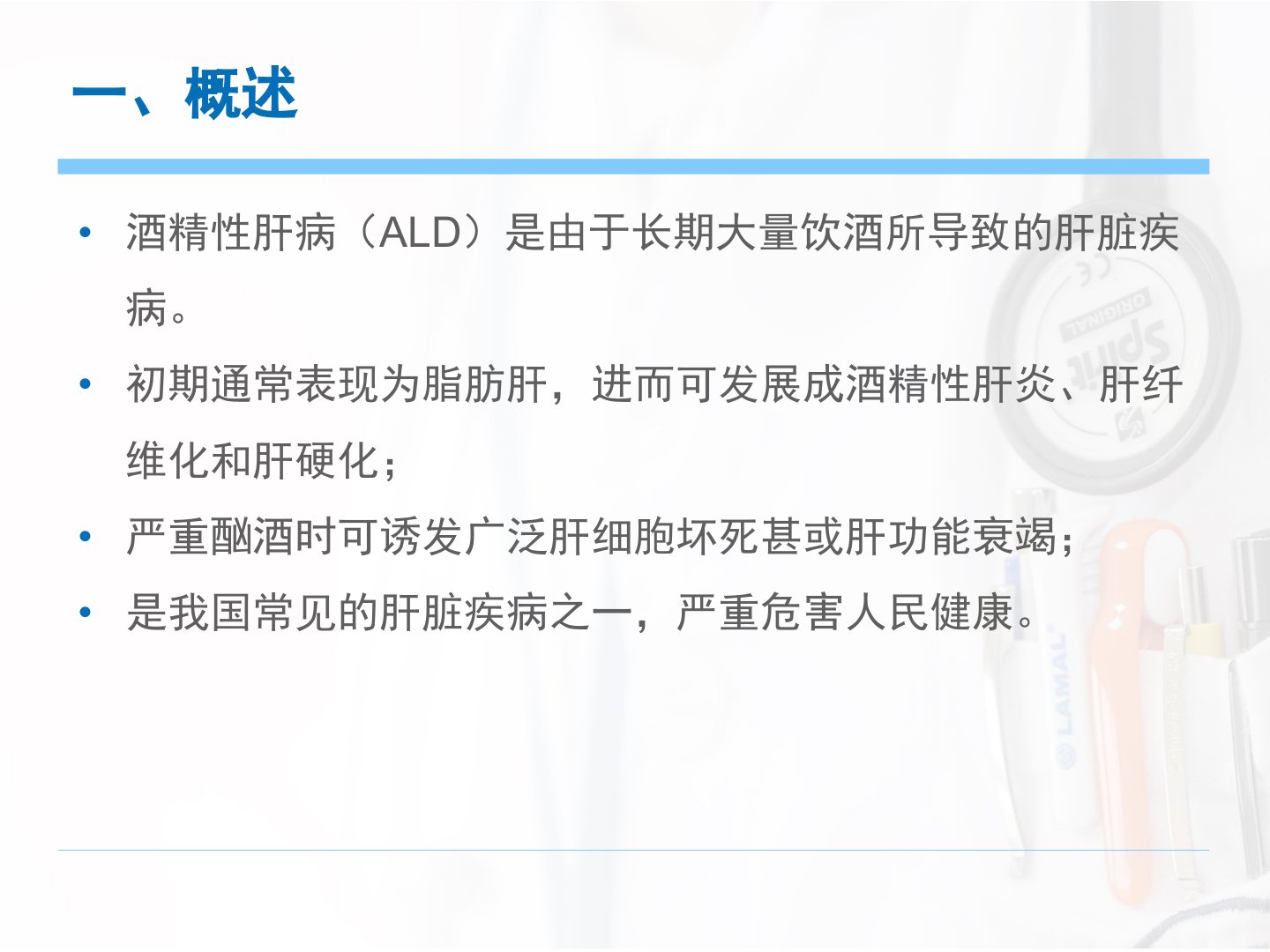 王医生20201119酒精性肝病相关知识摘要王医生介绍了酒精性肝病(ALD)的相关知识。ALD由长期大量饮酒导致初期多为脂肪肝可发展为肝炎、肝纤维化、肝硬化甚至肝功能衰竭严重危害健康。中国酒文化源远流长但缺乏全国性流行病学调查资料不过90年代以来嗜酒者比例和ALD患病率不断上升。ALD的危险因素包括长期大量饮酒、饮酒方式、性别、种族遗传等。临床表现上轻至重度患者均有肝脏肿大可能还有黄疸、腹水、食欲不振等症状还有酒精中毒性脑病等肝外器官损害表现。诊断标准包括长期饮酒史、非特异性临床症状、血清指标升高、肝脏超声或CT检查典型表现以及排除其他肝病等。临床分型有轻症酒精性肝病、酒精性脂肪肝、酒精性肝炎、酒精性肝硬化。治疗上以戒酒和营养支持为主可减轻病情、改善营养不良同时进行对症治疗。药物治疗包括糖皮质类固醇、美他多辛等。此外应重视抗肝纤维化治疗积极处理酒精性肝硬化并发症严重者可考虑肝移植。中医药可分期分型论治还有电生理疗法等新进展。预后方面戒酒、营养、药物治疗均可影响酒精性肝病的预后。