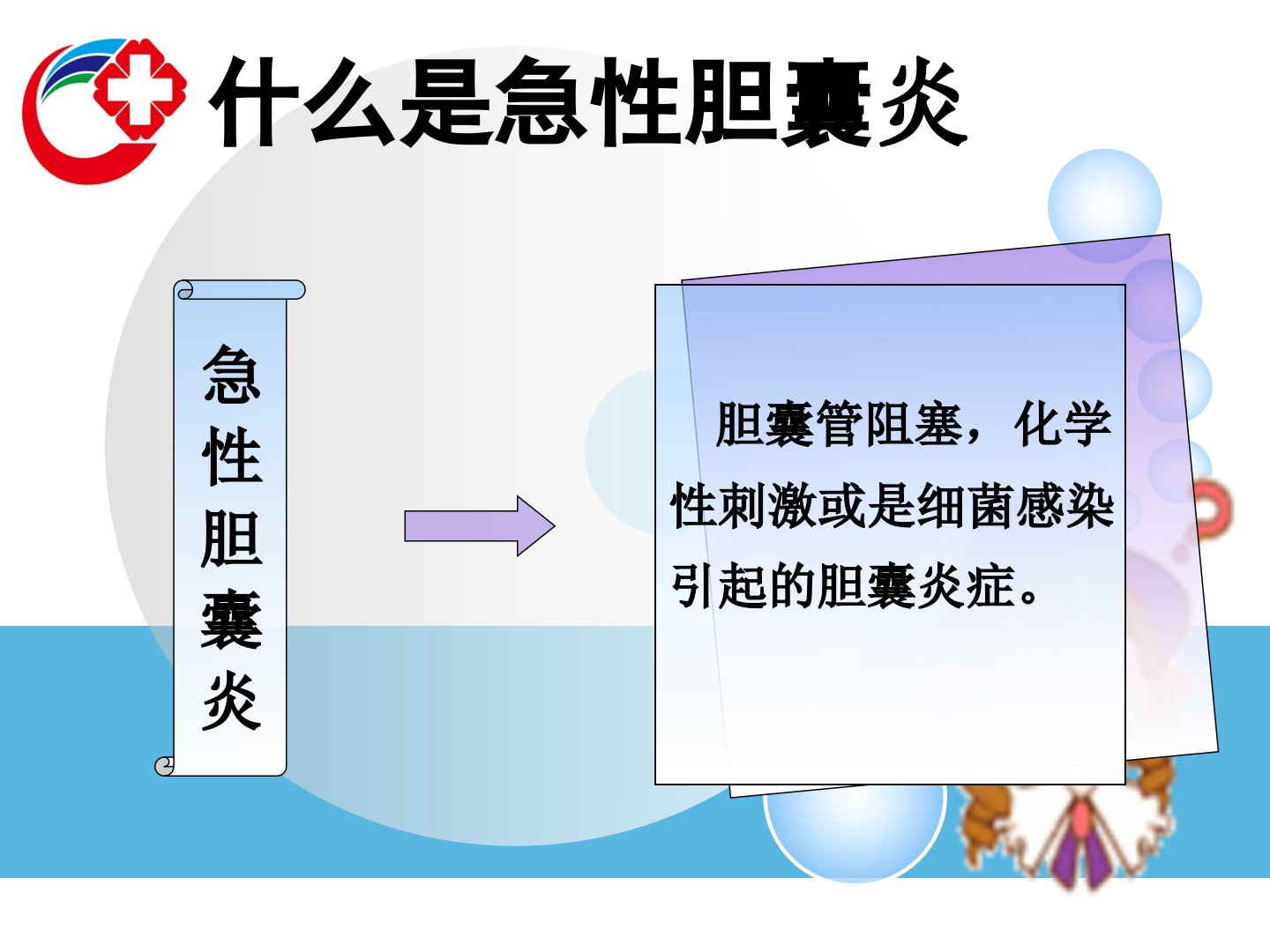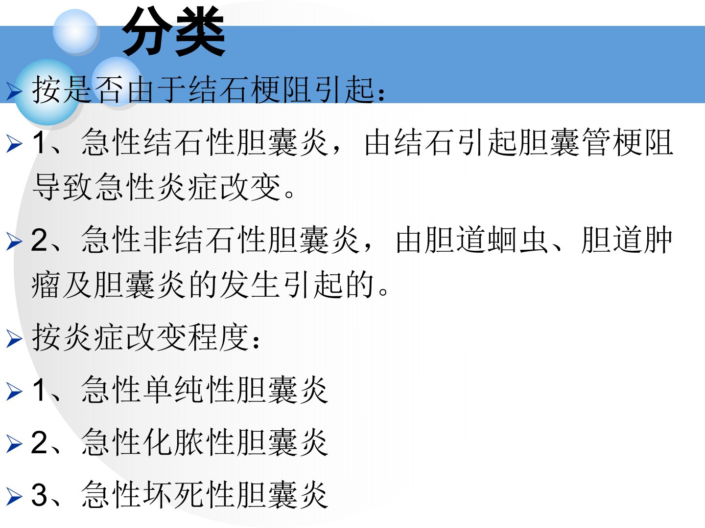 急性胆囊炎是由于胆囊管梗阻和细菌感染引起的胆囊急性炎症分类包括急性结石性胆囊炎(由结石梗阻胆囊管引起)和急性非结石性胆囊炎(由胆道蛔虫、胆道肿瘤等引起)还可按炎症程度分为急性单纯性、化脓性和坏死性胆囊炎。病因包括胆囊管梗阻、细菌感染、创伤及理化刺激。临床表现主要为右上腹持续性绞痛向右肩胛下区放射伴恶心、呕吐、发热等症状。实验室检查可见白细胞计数及中性粒细胞比例升高。影像学检查如B超、CT、MRI可协助诊断。治疗原则包括病情观察、缓解疼痛、控制感染、改善营养等术前护理以及术后生命体征监测、保持呼吸道通畅、妥善固定引流管、皮肤护理、基础护理、心理护理和T管护理等。注意事项包括并发症的预防及护理如加强观察、减轻胆囊压力、及时处理胆囊穿孔等。同时对患者进行健康教育包括合理安排作息、低脂饮食、定期检查等。