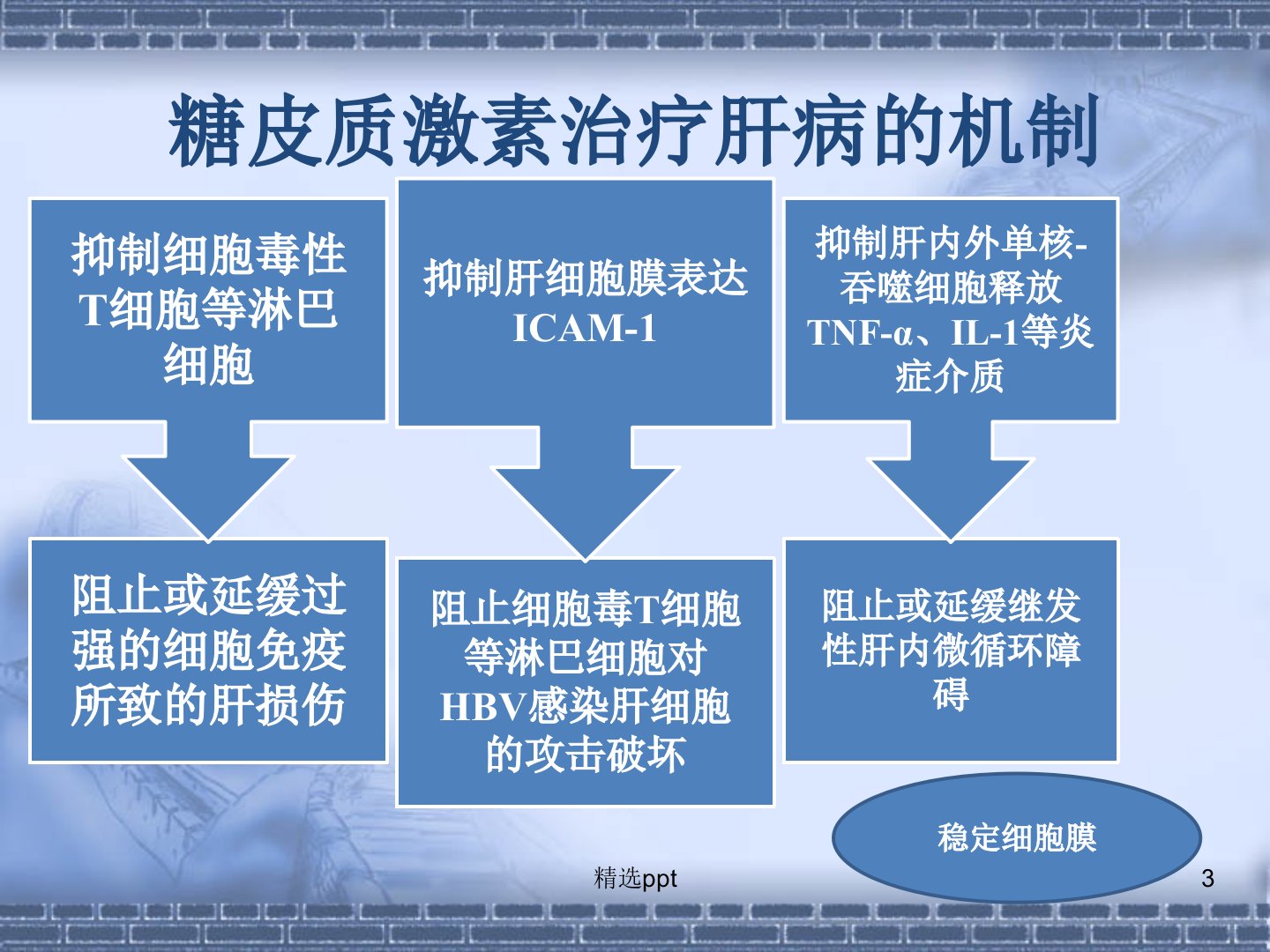 糖皮质激素在肝病中的应用摘要糖皮质激素在肝病治疗中发挥重要作用其机制包括稳定细胞膜。在重症肝炎中适用于恶心、呕吐等消化道症状重、血清胆红素快速升高且无腹水、出血、感染、消化性溃疡、肝肾综合征等致死性并发症、糖尿病合并症、肝硬化及其他糖皮质激素禁忌者。治疗方法包括:强的松或强的松龙4060mgd顿服待症状及胆红素下降后逐渐减量总疗程46个月;氢化可的松150300mg静滴逐渐减量疗程12月;地塞米松静推或静滴症状改善后换用强的松并减量。酒精性肝病中MDF32死亡风险高重度AH无禁忌证时考虑泼尼松治疗4周。自身免疫性肝病中AIH治疗指征包括ALT和AST显著升高肝组织学检查示桥接坏死或多小叶坏死常用联合方案。糖皮质激素需长期渐进减量典型维持量为510mgd。常见副作用包括继发性柯兴氏综合征、上消化道出血等需相应处理。