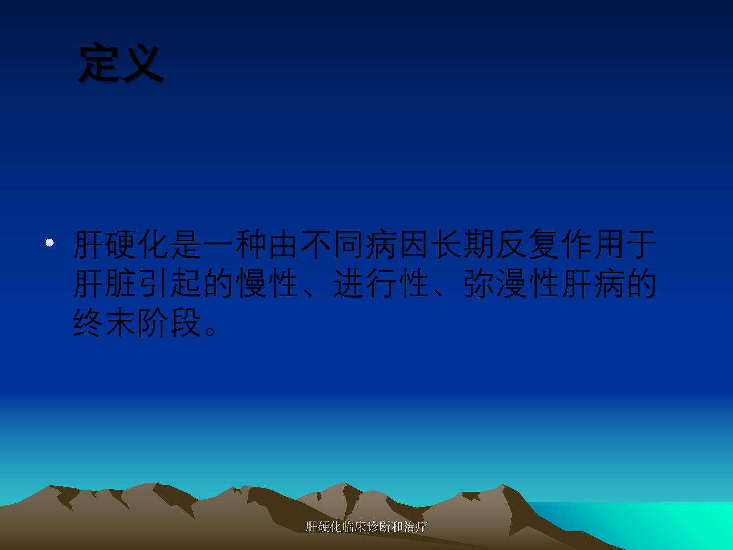 肝硬化临床诊断和治疗摘要肝硬化是慢性、进行性、弥漫性肝病的终末阶段以肝组织纤维化、再生结节和假小叶形成为特征临床上多系统受累主要表现为肝功能损害和门静脉高压晚期会出现多种严重并发症。我国肝硬化以2050岁男性为主要累及人群城市5060岁男性患者病死率高病因包括病毒性肝炎、慢性酒精中毒等。肝硬化代偿期症状不重易忽视失代偿期则有肝功能减退、门静脉高压症等表现。并发症包括上消化道出血、肝性脑病、感染、肝肾综合征等。辅助检查包括血、尿、粪常规肝功能试验影像学检查等。诊断依据病史、临床表现和辅助检查。治疗方面肝硬化无特效治疗代偿期主要对因治疗失代偿期则对症治疗。一般治疗包括休息、饮食调整等药物治疗目前无有效逆转肝硬化的药物。并发症治疗包括上消化道出血的护理、止血等自发性腹膜炎的抗生素治疗肝性脑病的治疗原则等。门脉高压可通过分流术、断流术等手术治疗。预后与病因及肝功代偿程度有关常据Childpugh分级判断。