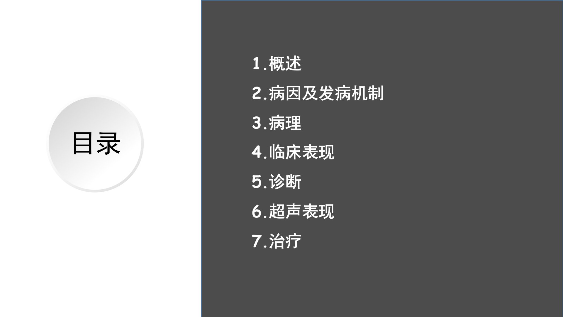 肝硬化摘要一、概述肝硬化是临床常见的慢性进行性肝病由一种或多种病因长期或反复作用形成的弥漫性肝损害。病理特征为肝脏弥漫性纤维化、再生结节和假小叶形成。临床起病隐匿病程缓慢晚期以肝功能减退和门静脉高压为主要表现常出现多种并发症。发病率高发病高峰年龄在3550岁男性多见出现并发症时死亡率高。二、病因及发病机制病因包括病毒性肝炎(主要为乙型、丙型和丁型)、慢性酒精中毒、非酒精性脂肪性肝炎、胆汁淤积、肝静脉回流受阻、遗传代谢疾病、工业毒物或药物、自免肝、血吸虫病及隐源性肝硬化。三、病理大体形态早期肿大晚期缩小质地硬表面弥漫大小不等结节。光镜下正常肝小叶结构被假小叶替代。四、临床表现1代偿期:偶有乏力、食欲减退、腹胀不适。2失代偿期:出现腹水及并发症包括全身症状、消化道症状、出血倾向、内分泌紊乱相关症状、门脉高压相关症状。3并发症:包括食管胃底静脉曲张破裂出血、感染、肝性脑病、电解质和酸碱平衡紊乱、原发性肝细胞癌、肝肾综合征、肝肺综合征、门静脉血栓形成。五、诊断依据相关病史、临床表现、实验室检查(血清白蛋白、血清胆红素、凝血酶原时间等)及影像学检查(B超、CT、MRI)。六、超声表现1正常肝脏:
