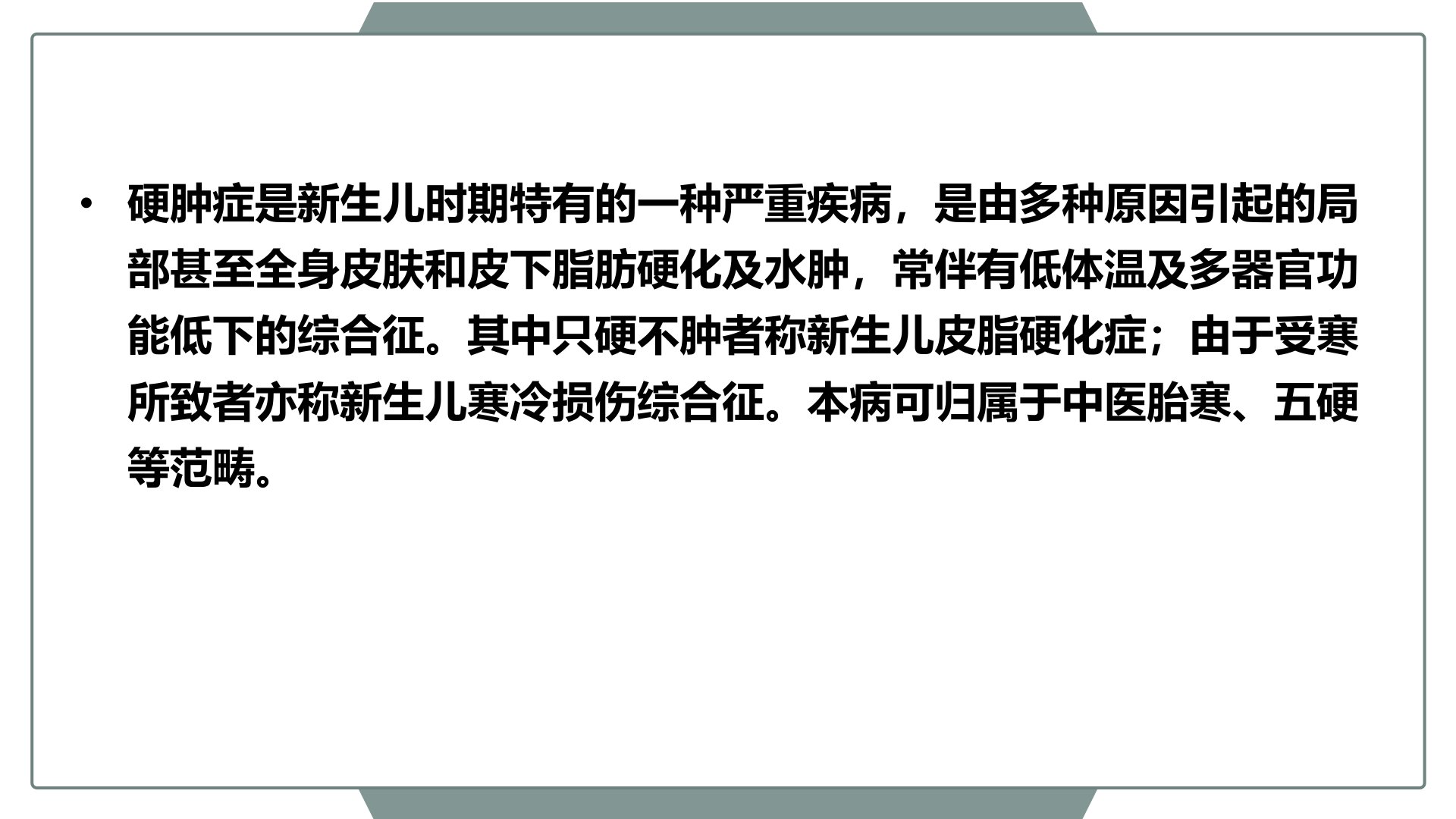 第二节硬肿症【病因病机】【临床诊断】【分证论治】【其他疗法】【预防调护】【案例分析】【古籍选录】硬肿症是新生儿时期特有的一种严重疾病,是由多种原因引起的局部甚至全身皮肤和皮下脂肪硬化及水肿,常伴有低体温及多器官功能低下的综合征。其中只硬不肿者称新生儿皮脂硬化症;由于受寒所致者亦称新生儿寒冷损伤综合征。本病可归属于中医胎寒、五硬等范畴。该病多发生于寒冷地区和寒冬季节,以生后7~10天的新生儿尤其胎怯患儿多见,受寒、早产、感染、窒息等原因都可引起发病。本病重症预后较差,病变过程中可并发肺炎、败血症等疾病,严重者常合并肺出血等引起死亡。【病因病机】硬肿症的发生有内因和外因之分,内因多为先天禀赋不足,...