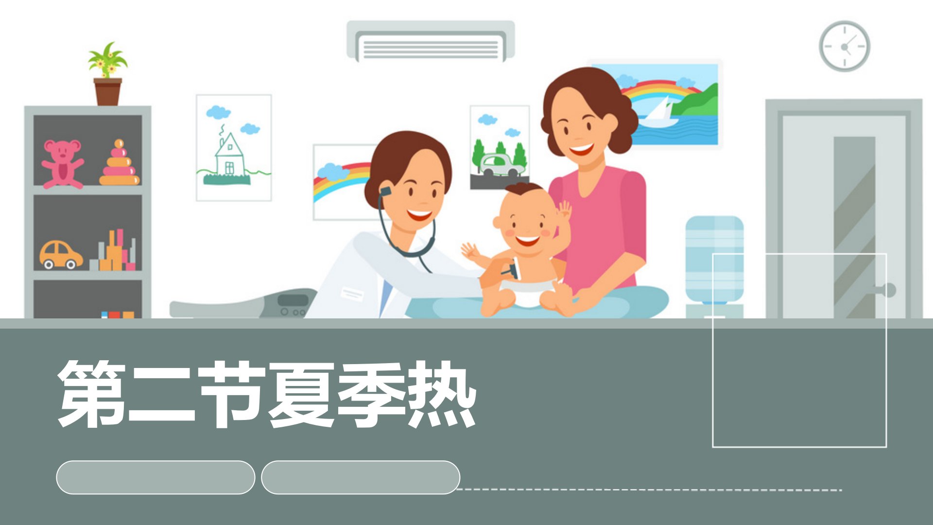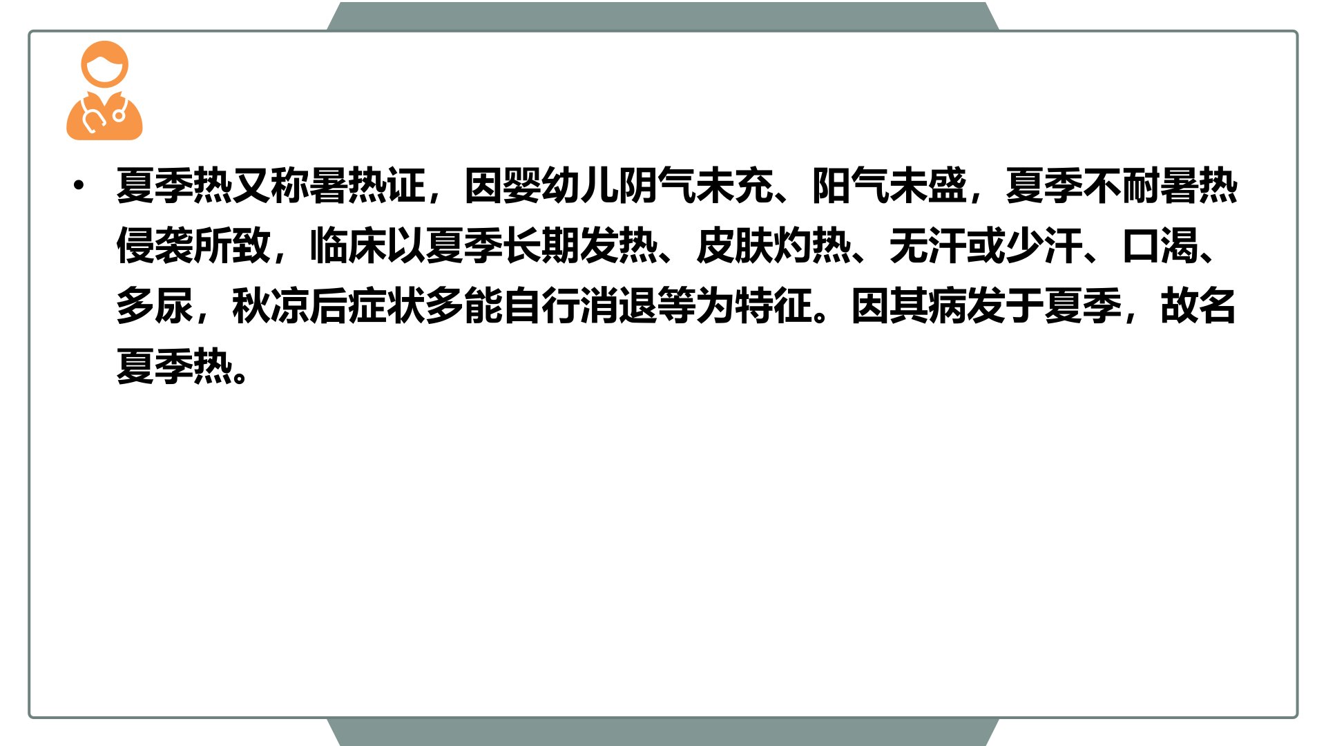 第二节夏季热【病因病机】【临床诊断】【分证论治】【其他疗法】【预防调护】【案例分析】【古籍选录】夏季热又称暑热证,因婴幼儿阴气未充、阳气未盛,夏季不耐暑热侵袭所致,临床以夏季长期发热、皮肤灼热、无汗或少汗、口渴、多尿,秋凉后症状多能自行消退等为特征。因其病发于夏季,故名夏季热。本病多见于3岁以内的婴幼儿,6个月以内或5岁以上少见。发病集中在6、7、8三个月,我国南方如华东、中南、西南等气候炎热地区多见。气温愈高,发病愈多,病情愈重,秋凉以后,症状多自行缓解。部分患儿可连续发病数年,但次年发病,其症状较上一年为轻,病程也较短。本病若无其他合并症,预后良好。【病因病机】本病为季节相关性疾病,外因在...