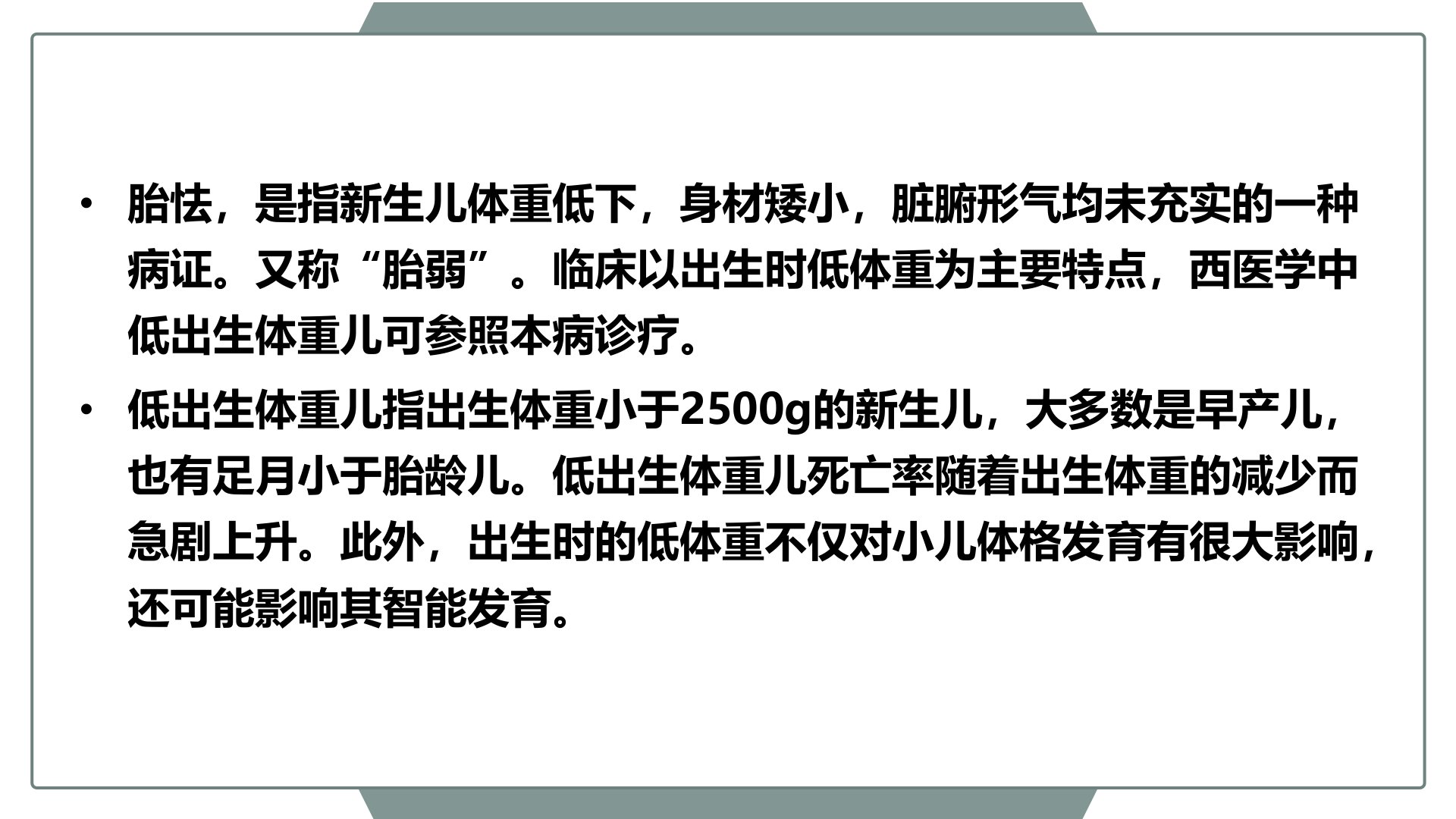 第一节胎怯【病因病机】【临床诊断】【分证论治】【其他疗法】【预防调护】【案例分析】【古籍选录】胎怯,是指新生儿体重低下,身材矮小,脏腑形气均未充实的一种病证。又称“胎弱”。临床以出生时低体重为主要特点,西医学中低出生体重儿可参照本病诊疗。低出生体重儿指出生体重小于2500g的新生儿,大多数是早产儿,也有足月小于胎龄儿。低出生体重儿死亡率随着出生体重的减少而急剧上升。此外,出生时的低体重不仅对小儿体格发育有很大影响,还可能影响其智能发育。【病因病机】胎怯的病因为各种原因导致的先天禀赋不足,病变脏腑主要在肾与脾,其病机为化源未充,濡养不足,肾脾两虚。因肾藏精,为生长发育之本,而先天之精又需赖后天之...