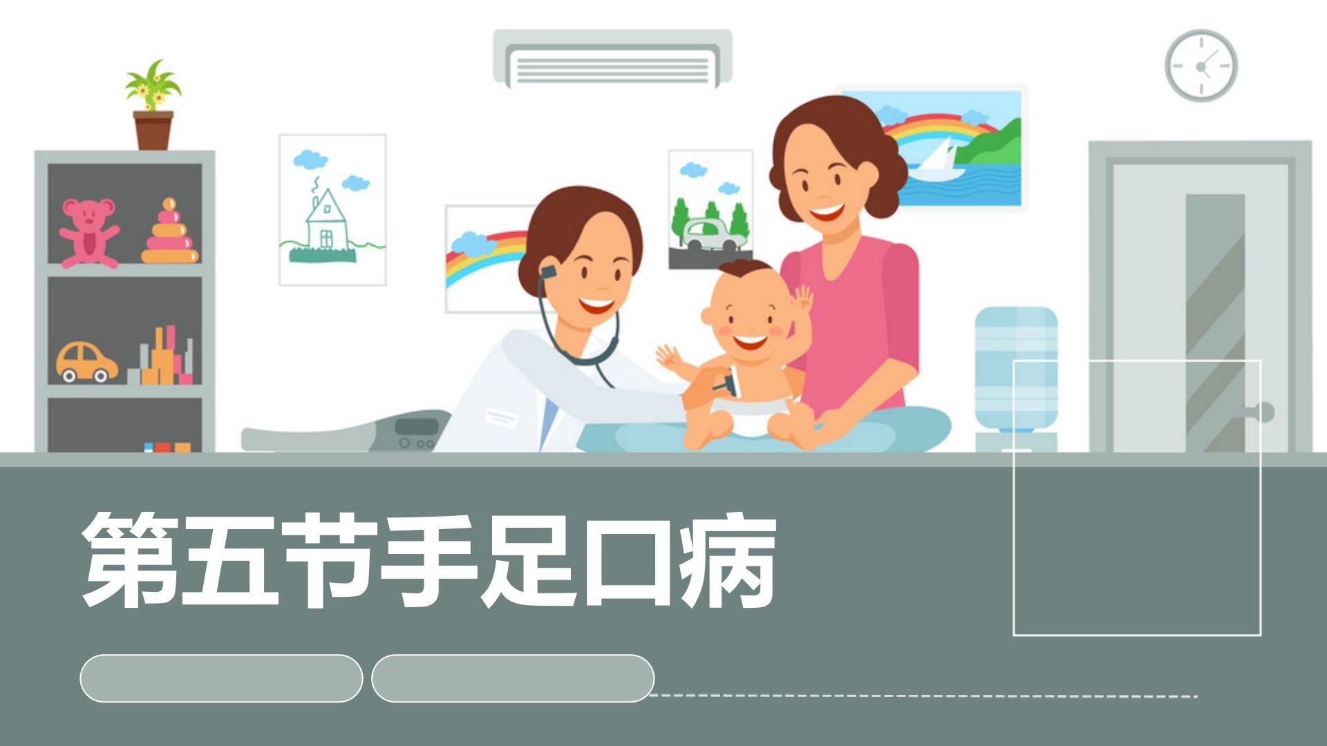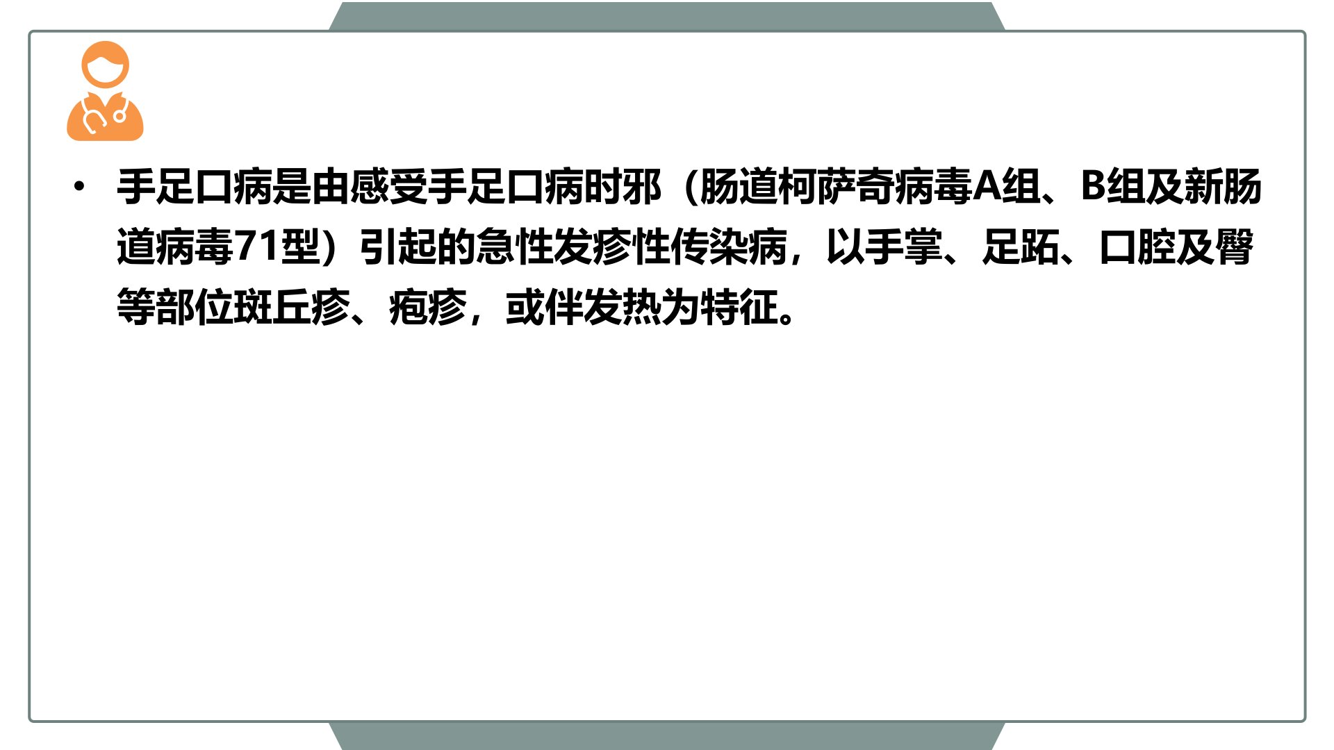 第五节手足口病【病因病机】【临床诊断】【分证论治】【其他疗法】【预防调护】【案例分析】【古籍选录】手足口病是由感受手足口病时邪(肠道柯萨奇病毒A组、B组及新肠道病毒71型)引起的急性发疹性传染病,以手掌、足跖、口腔及臀等部位斑丘疹、疱疹,或伴发热为特征。本病一年四季可发病,夏秋季多见。好发于学龄儿童,以3岁以下发病率最高。本病传染性强,易暴发流行。患者和隐性感染者主要经呼吸道、消化道和密切接触等途径传播病毒。预后一般良好,多在一周内痊愈,少数重证可出现脑炎、脑膜炎、肺水肿、心肌炎、呼吸和循环障碍等疾病,甚至危及生命。【病因病机】本病为感受手足口病时邪,病位在肺脾两经。病机为时邪蕴郁肺脾,外透肌...
