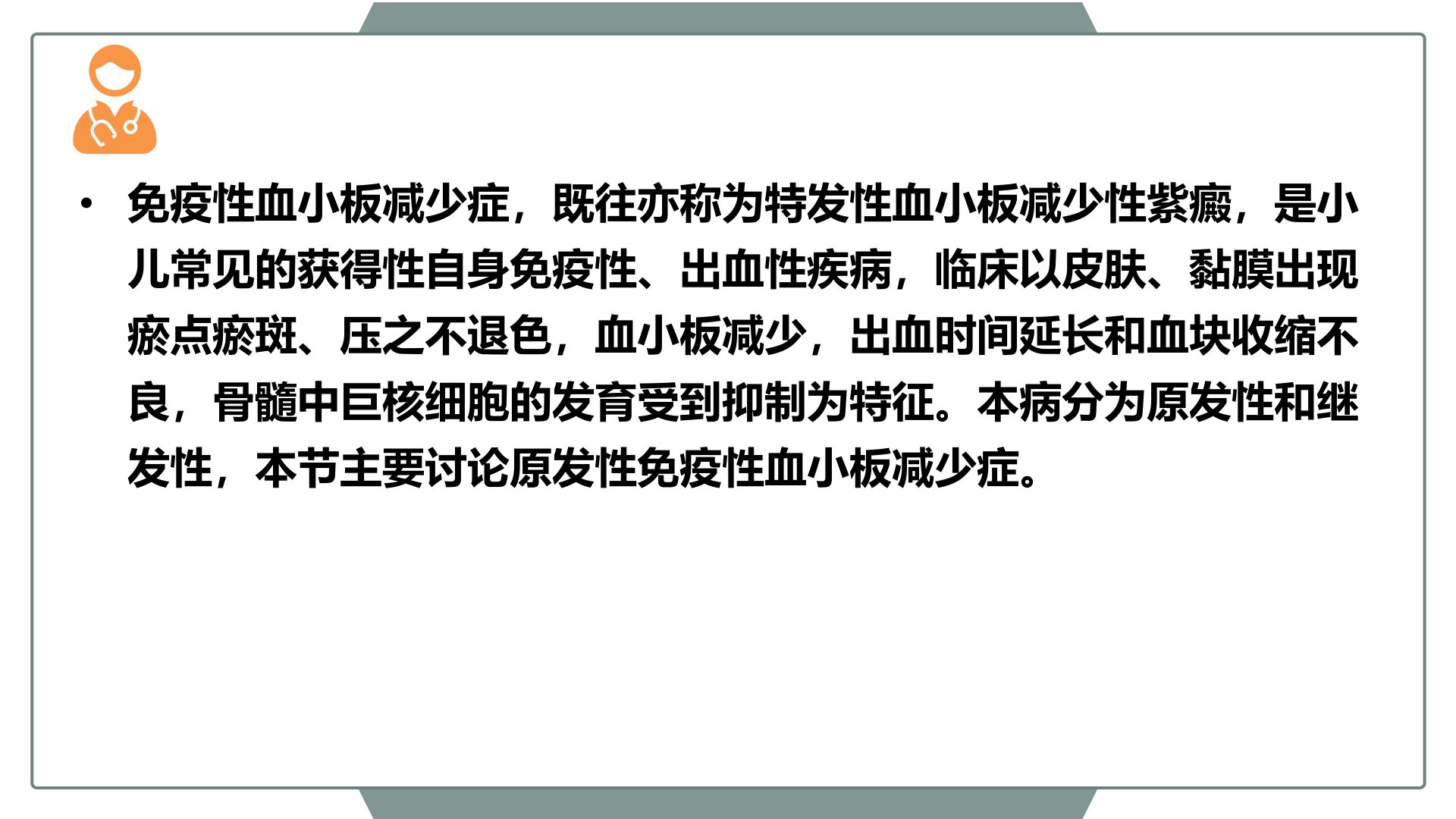 免疫性血小板减少症曾称特发性血小板减少性紫癜是小儿常见的出血性疾病以皮肤、黏膜瘀点瘀斑、血小板减少等为特征本病分原发性和继发性本文主要讨论原发性。中医认为其发病内因为正气亏虚外因为外感风热等病位主要在心、肝、脾、肾主要病机为热、虚、瘀。临床诊断包括病史、临床表现、体征、辅助检查等主要依据病程长短分三型。治疗以止血为要分证论治风热伤络证用银翘散加减血热妄行证用犀角地黄汤加减阴虚火旺证用知柏地黄丸加减气不摄血证用归脾汤加减脾肾阳虚证用右归丸加减。其他疗法有中成药、艾灸、西医治疗等。预防调护要注意预防病毒感染避免使用抑制血小板药物急性期卧床休息密切观察病情饮食宜消化。