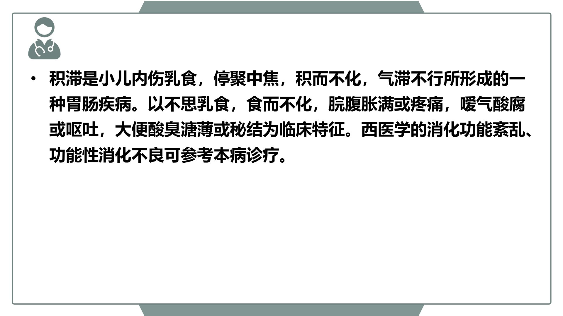 摘要积滞是小儿因内伤乳食停聚中焦积而不化、气滞不行所致的胃肠疾病以不思乳食、食而不化、脘腹胀满或疼痛等为特征西医学的消化功能紊乱等可参考诊疗。该病各年龄段均可发但婴幼儿最为多见禀赋不足、脾胃素虚等更易患病可单独出现或兼夹于其他疾病一般预后良好少数可转化为疳证。病因病机喂养不当、乳食不节损伤脾胃或脾胃虚弱致运化失调乳食停滞不化。病位在脾胃基本病机为乳食停聚不消、气滞不行。临床诊断诊断要点包括伤乳、伤食史特征性临床表现上腹部及脐周部压痛大便常规可见不消化食物残渣、脂肪滴需与厌食、疳证鉴别。辨证论治治疗以消食化积、理气行滞为基本法则实证消食导滞虚实夹杂者消补兼施。分证论治包括乳食内积、食积化热、脾虚夹积分别采用消乳化食和中导滞、清热导滞消积和中、健脾助运消食化滞之法。其他疗法包括中成药、药物外治、推拿疗法、针灸疗法等。预防调护合理喂养根据需要添加辅食积滞患儿控制乳食饮食起居规律少吃肥甘厚腻勿乱服滋补品。案例分析刘某5岁诊断为积滞辨证属脾虚夹积证经治疗好转。古籍选录《幼幼集成》等古籍对积滞的成因、治疗有相关记载。