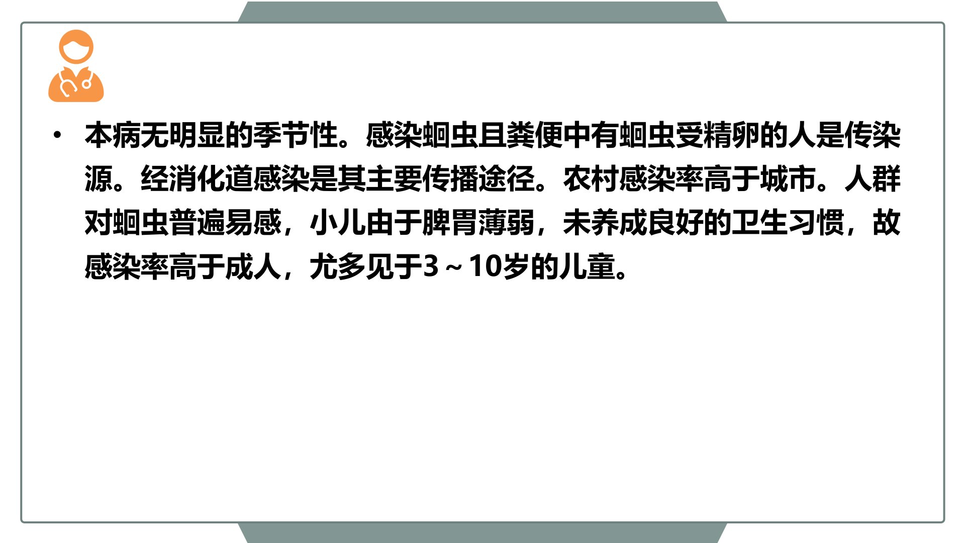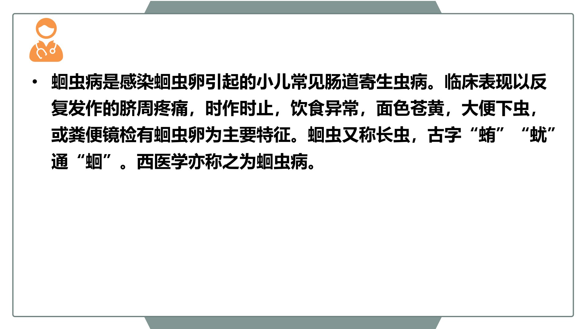 第一节蛔虫病蛔虫病是感染蛔虫卵引起的小儿常见肠道寄生虫病。临床表现以反复发作的脐周疼痛,时作时止,饮食异常,面色苍黄,大便下虫,或粪便镜检有蛔虫卵为主要特征。蛔虫又称长虫,古字“蛕”“蚘”通“蛔”。西医学亦称之为蛔虫病。本病无明显的季节性。感染蛔虫且粪便中有蛔虫受精卵的人是传染源。经消化道感染是其主要传播途径。农村感染率高于城市。人群对蛔虫普遍易感,小儿由于脾胃薄弱,未养成良好的卫生习惯,故感染率高于成人,尤多见于3~10岁的儿童。蛔虫成虫寄生小肠,劫夺水谷精微,妨碍正常的消化吸收,轻者可无症状,或仅见脐周时有疼痛;病较重者可引起疳证,影响儿童生长发育;严重者或出现并发症,其中以蛔厥证、虫瘕证...