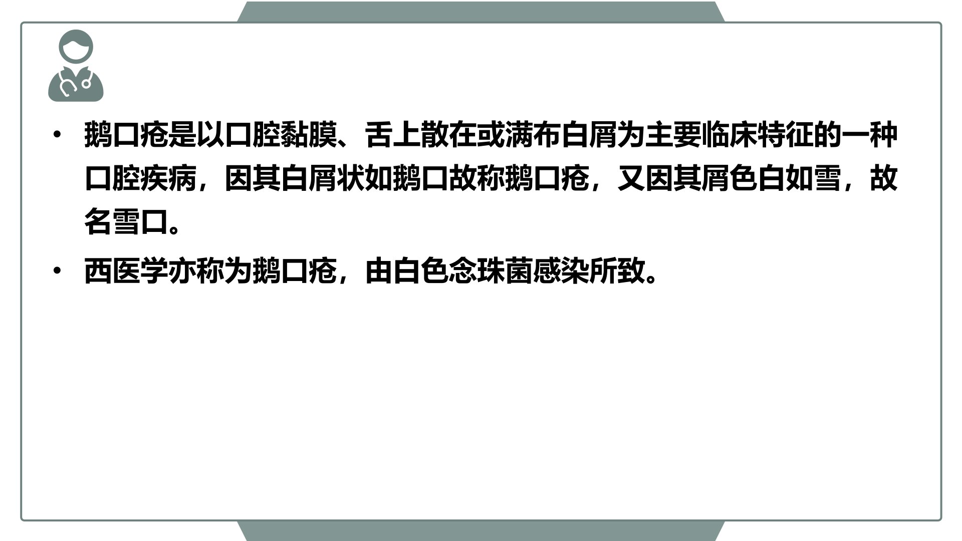 鹅口疮是以口腔黏膜、舌上散在或满布白屑为特征的口腔疾病西医学亦称鹅口疮由白色念珠菌感染所致常见于新生儿及体质虚弱的小儿轻证预后良好重证可危及生命。其病因病机主要有二:一是胎热内蕴、调护不当等致心脾积热火热循经上炎熏灼口舌;二是胎禀不足、久病体虚等致肾阴亏虚虚火上浮熏蒸口腔。临床诊断依据病史、临床表现及辅助检查需与白喉、口疮、残留奶块鉴别。辨证论治分虚实与轻重实证宜清泻心脾积热用清热泻脾散加减;虚证宜滋肾养阴降火用知柏地黄丸加减。其他疗法包括中成药、药物外治及西医治疗。预防调护需加强孕期保健、注意口腔清洁、避免刺激性食物、积极治疗原发病等。案例分析显示清心泻脾法治疗心脾积热型鹅口疮效果显著。古籍中也有关于鹅口疮的论述。