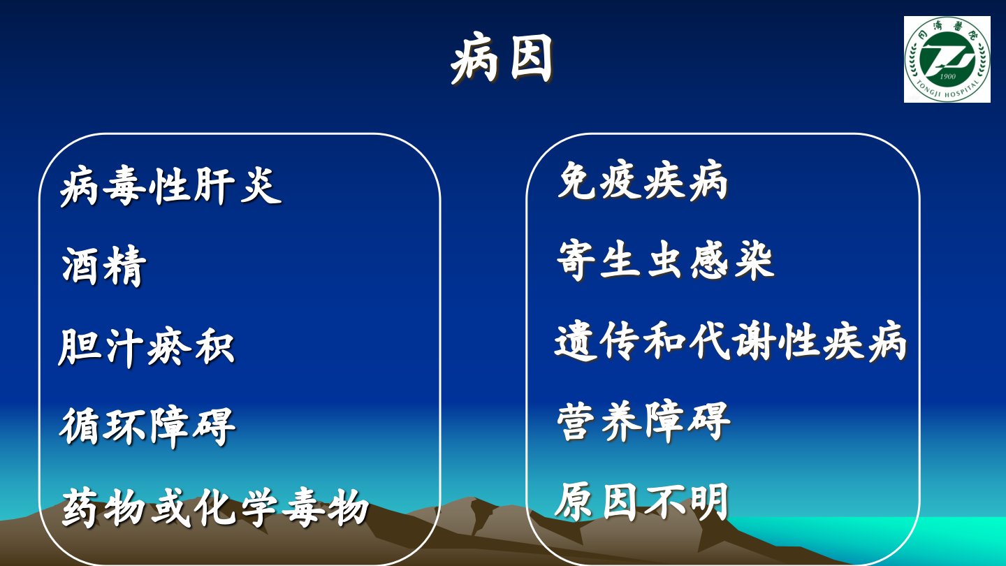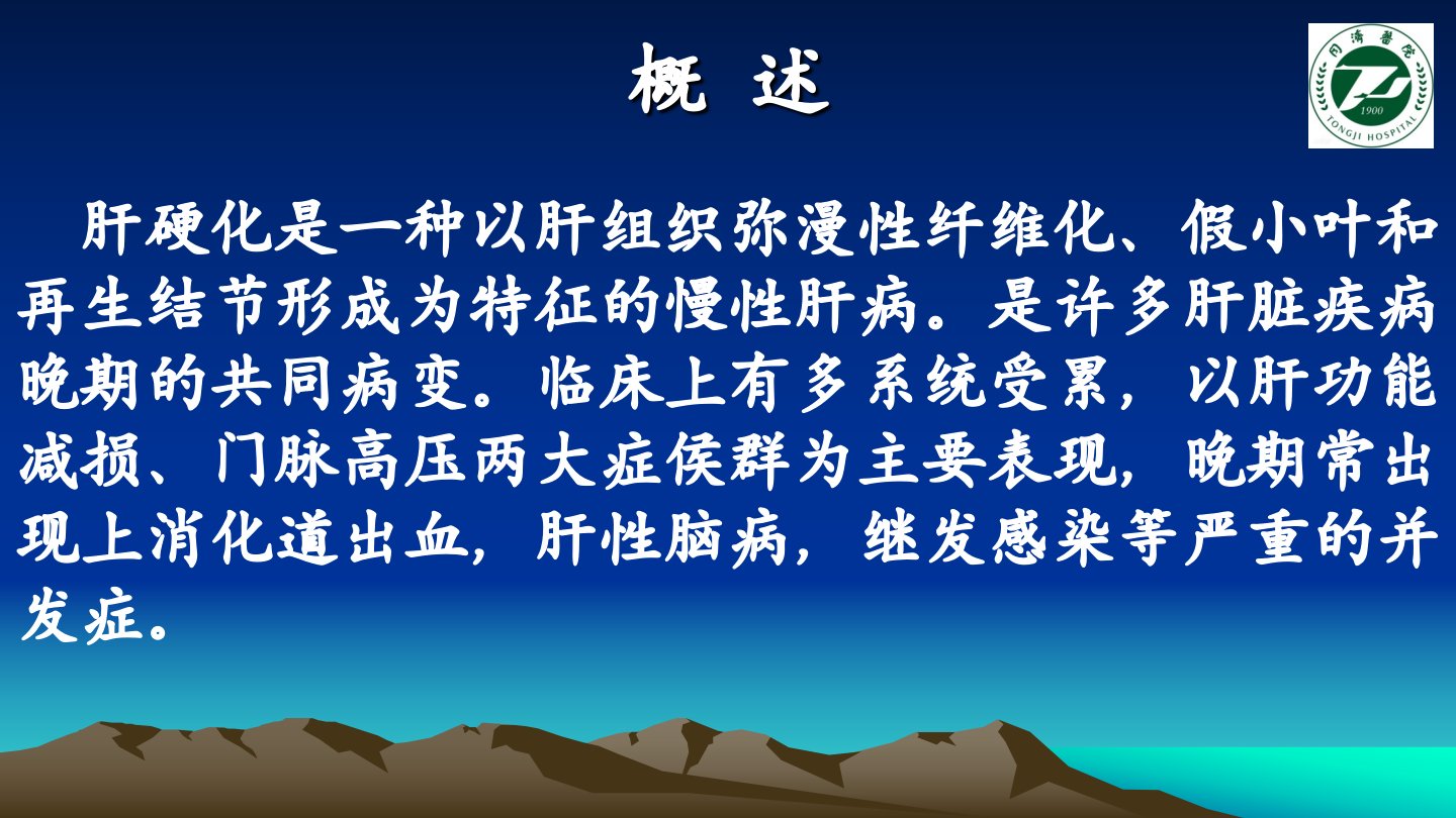 肝硬化Cirrhosisofliver同济医院消化内科黄焕军概述肝硬化是一种以肝组织弥漫性纤维化、假小叶和再生结节形成为特征的慢性肝病。是许多肝脏疾病晚期的共同病变。临床上有多系统受累,以肝功能减损、门脉高压两大症侯群为主要表现,晚期常出现上消化道出血,肝性脑病,继发感染等严重的并发症。病毒性肝炎酒精胆汁瘀积循环障碍药物或化学毒物免疫疾病寄生虫感染遗传和代谢性疾病营养障碍原因不明病因一、病毒性肝炎(肝炎后肝硬化)我国肝炎发病率达137/10万以上,仅乙肝病毒携带者就有1亿2千万人口。成人期感染HBV,10%左右演变为慢性肝炎,约3%发展为肝硬化。丙肝的发病率远远低于乙肝,但感染HCV后约8~3...