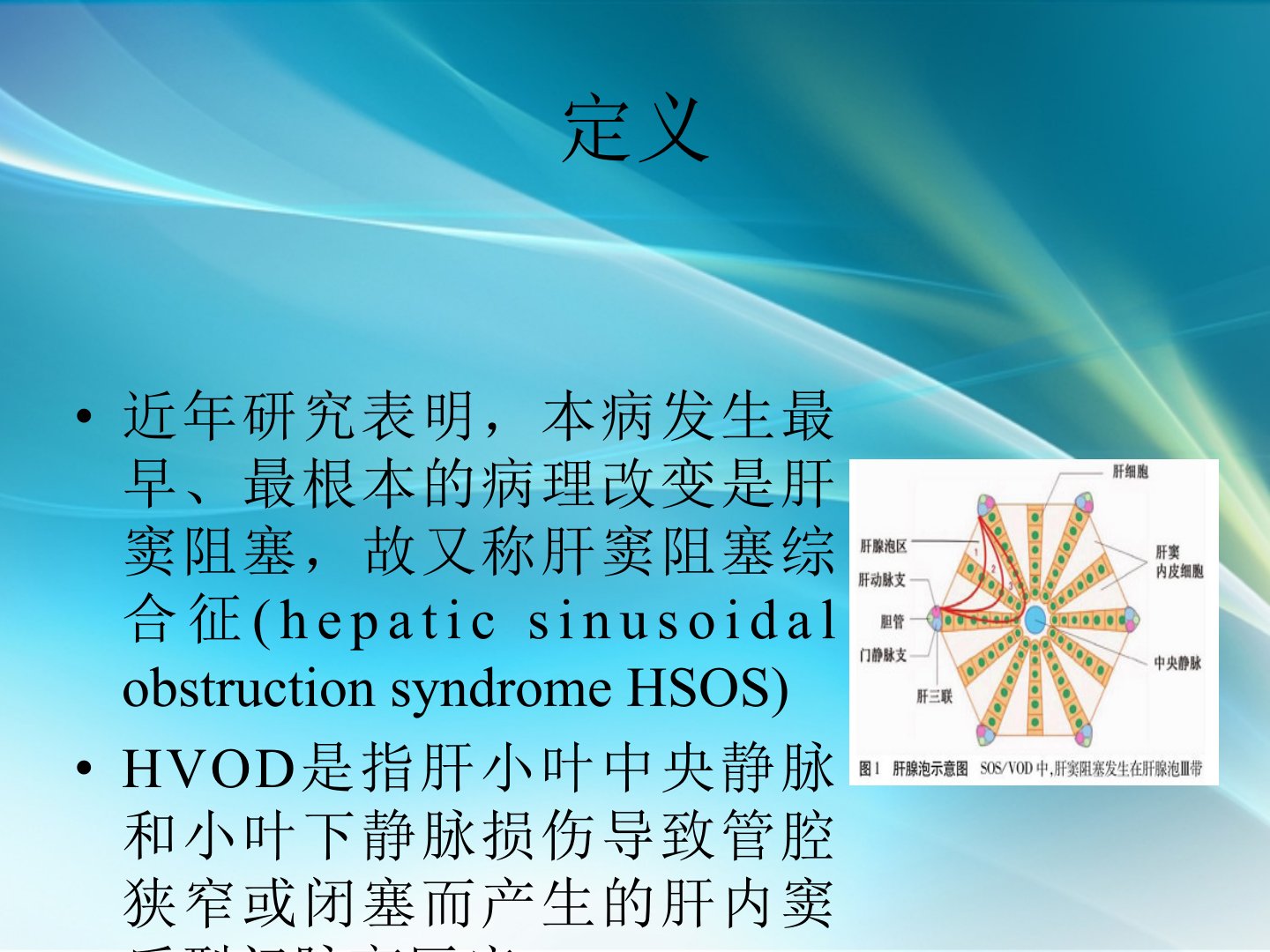肝小静脉闭塞症(HVOD)又称肝窦阻塞综合征主要由肝小叶中央静脉和小叶下静脉损伤导致管腔狭窄或闭塞产生肝内窦后型门脉高压症以肝大、腹水、体重增加和黄疸为特点。其病因多样包括食用含吡咯烷生物碱的野生植物(如土三七)、酒精、口服避孕药、放射性损伤及造血干细胞移植等。临床表现分为急性期、亚急性期和慢性期各有不同症状。实验室检查以血清透明质酸等为早期标志影像学检查如超声、CT、MRI可辅助诊断但病理组织学检查是诊断金标准。HVOD需与布加氏综合征、急性肝炎等相鉴别。治疗以支持治疗和对症处理为主特异性治疗包括抗纤维蛋白溶解剂等肝移植是最有效治疗手段。HVOD预后较差重症死亡率可达98预防尤为重要需加强宣教识别高危患者药物预防可用肝素、前列腺素E1等。