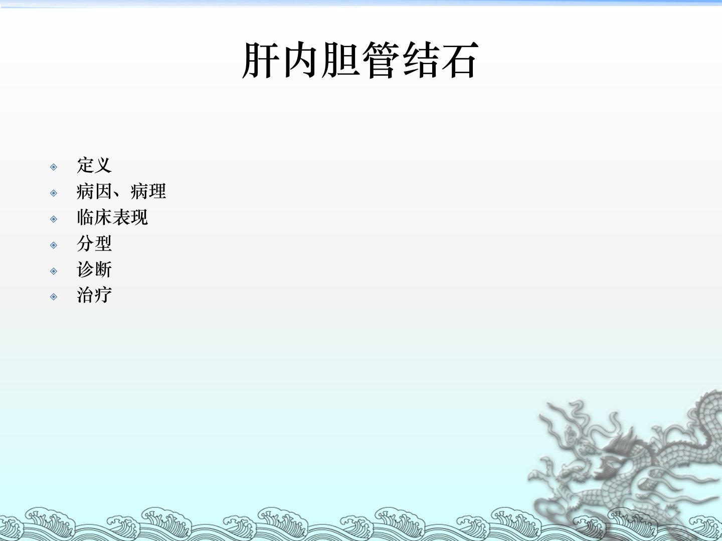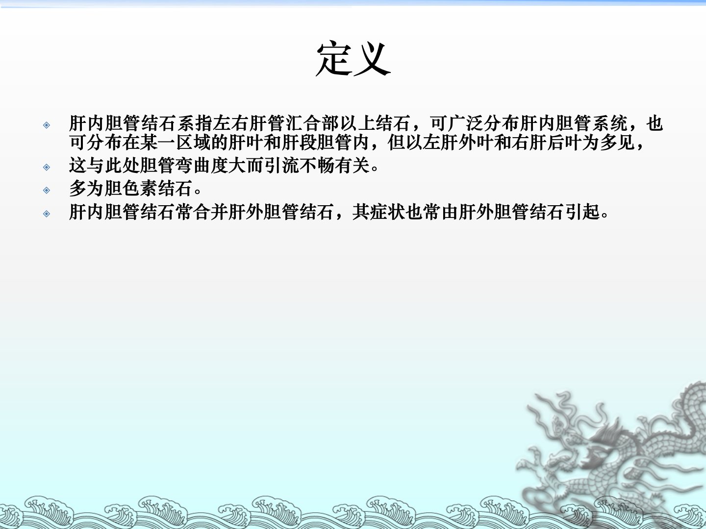 肝内胆管结石摘要肝内胆管结石多指左右肝管汇合部以上结石左肝外叶和右肝后叶多见多为胆色素结石常合并肝外胆管结石。其形成与胆道慢性炎症、细菌感染、胆道蛔虫、胆汁淤滞、营养不良等因素有关胆管内慢性炎症是重要因素胆汁淤滞是必要条件狭窄处胆管不典型增生是癌前病变。临床表现分三型:静止型症状轻微;梗阻型有黄疸、疼痛、消化功能减退等症状;胆管炎型表现为反复发作的急性化脓性胆管炎。诊断上B超是首选但不能作为手术依据术前需结合CT、MRIMRCP明确情况ERCP和PTC等侵入性检查已非必须。其分型包括局限型、区域型、弥漫型(又分三个亚型)及附加型。治疗遵循去除病灶、取尽结石等原则手术方法多样常需多术式联用选择手术方法应遵循个体化及根治性清除病灶原则对于不同类型结石应选择相应手术方式。