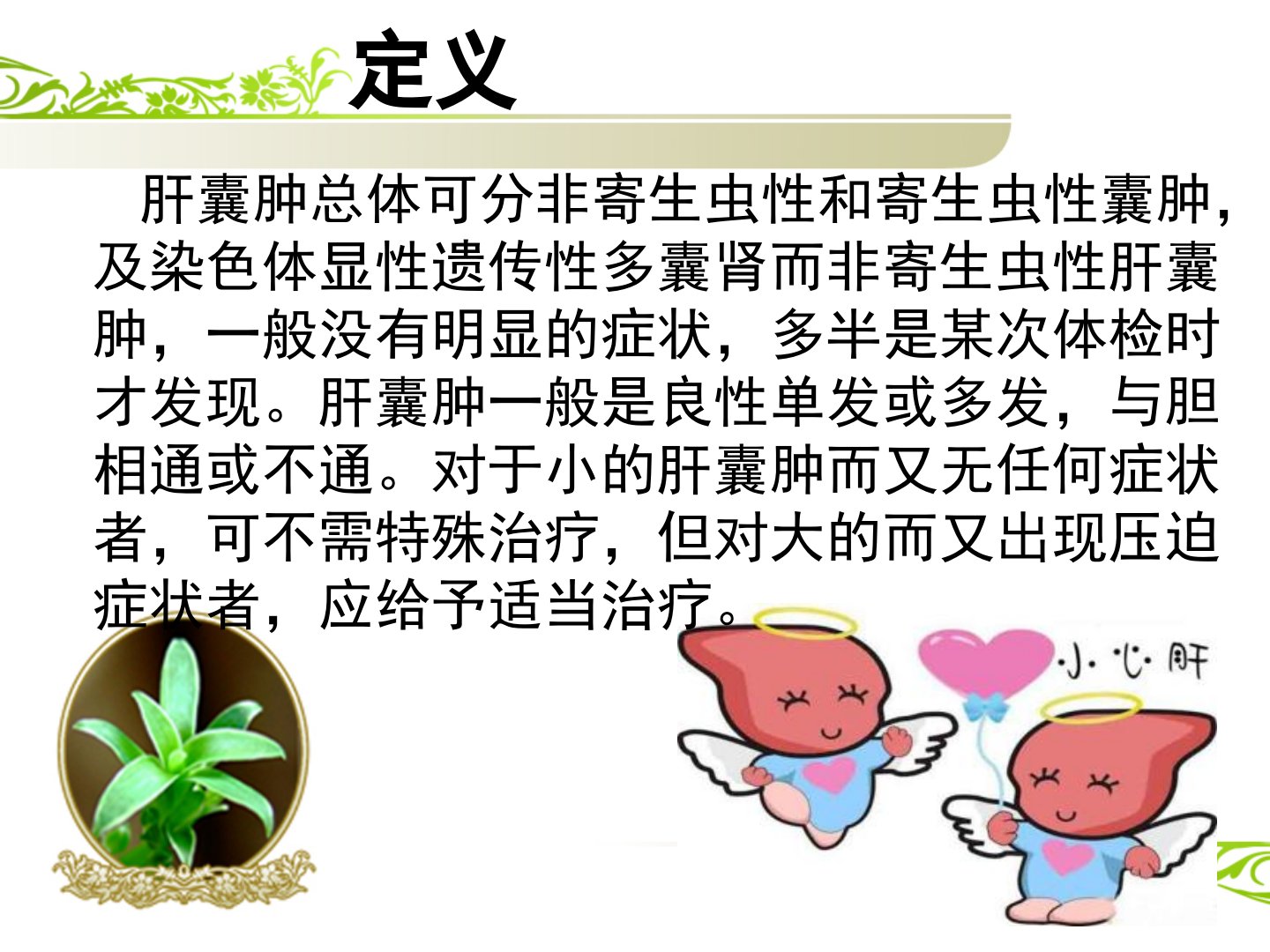 肝囊肿总体分为非寄生虫性和寄生虫性两类多为良性单发或多发一般无明显症状常在体检时发现。非寄生虫性肝囊肿与胆相通或不通小且无症状者无需特殊治疗大且出现压迫症状者需适当治疗。其发病原因包括潴留性和先天性两种临床表现上小囊肿多无症状增大到一定程度可因压迫邻近脏器而出现症状少数可因囊肿破裂或囊内出血出现急腹症。近年来B超成为首选检查方法。护理方面需关注疼痛、知识缺乏、潜在并发症等问题做好病情观察如监测生命体征观察有无休克征象等。术后护理包括保持引流管通畅、监测生命体征、饮食指导、心理安慰、保持呼吸道通畅、预防感染等。同时提出预防肝囊肿的建议如防治胆系感染及结石、定期B超复查、避免外伤、改变饮食习惯、注意休息、适当锻炼及服用维生素等。