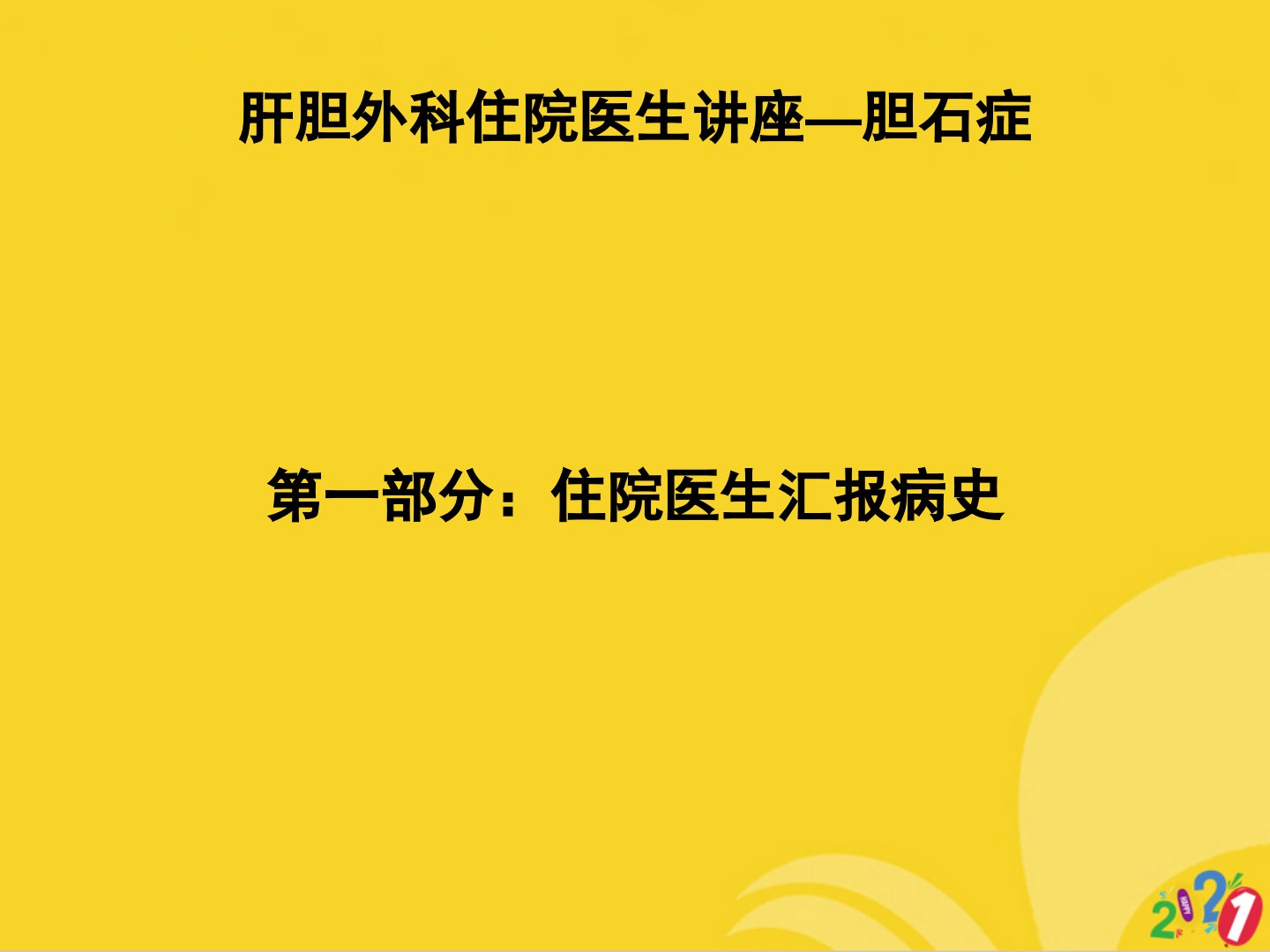 肝胆外科住院医生讲座—胆石症摘要本次肝胆外科讲座聚焦胆石症分五部分展开。第一部分住院医生汇报病史患者杜XX53岁男性因进食油腻后右上腹持续疼痛3天入院伴恶心、呕吐、发热5年前有胆囊结石病史。查体见巩膜轻度黄染右上腹压痛Murphy征阳性。彩超示胆囊结石、胆总管扩张。初步诊断为胆囊结石、急性胆囊炎、梗阻性黄疸。第二部分主治医师查房详细询问病史、查体并安排急检患者保守治疗3天无效出现Charcot三联征及腹膜炎具急诊手术指征。第三部分主任医师查房确定诊断为胆囊结石、急性胆囊炎、梗阻性黄疸、胆总管结石、急性梗阻性化脓性胆管炎决定急诊手术。第四部分术中见胆囊水肿、粘连内有多枚结石胆道镜探查取石留置T管。术后患者病情好转。第五部分总结了胆囊结石合并胆囊炎、胆总管结石合并胆管炎的诊断依据与治疗原则。