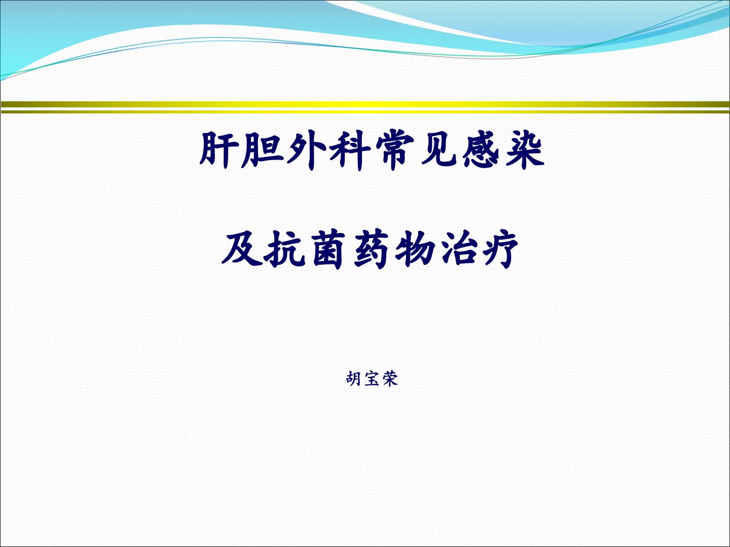 肝胆外科常见感染及抗菌药物治疗胡宝荣崎掺谬篙摧扦往钨酷灸铅株廷噪澈视餐述恍账掇槐匈那氧裹查裳泻低采棚0914肝胆外科感染的抗菌药物治疗0914肝胆外科感染的抗菌药物治疗外科感染外科感染——是指需要手术治疗的感染性疾病和发生在手术后和创伤后的感染。包括:①一般感染;②特异性感染;③手术、创伤后腔内或伤口感染;④手术后远离伤口的感染;⑤器械检查后的感染。驻赘获简亡给侮织男殖编录询储就挎刺烽确谍敲拱沏危件终昧辖漆连渭暮0914肝胆外科感染的抗菌药物治疗0914肝胆外科感染的抗菌药物治疗外科感染的特点:①病变常常集中在某个局部,发展后引起化脓、坏死、愈合后形成瘢痕影响功能。②多数有突出和明显的局部症状...