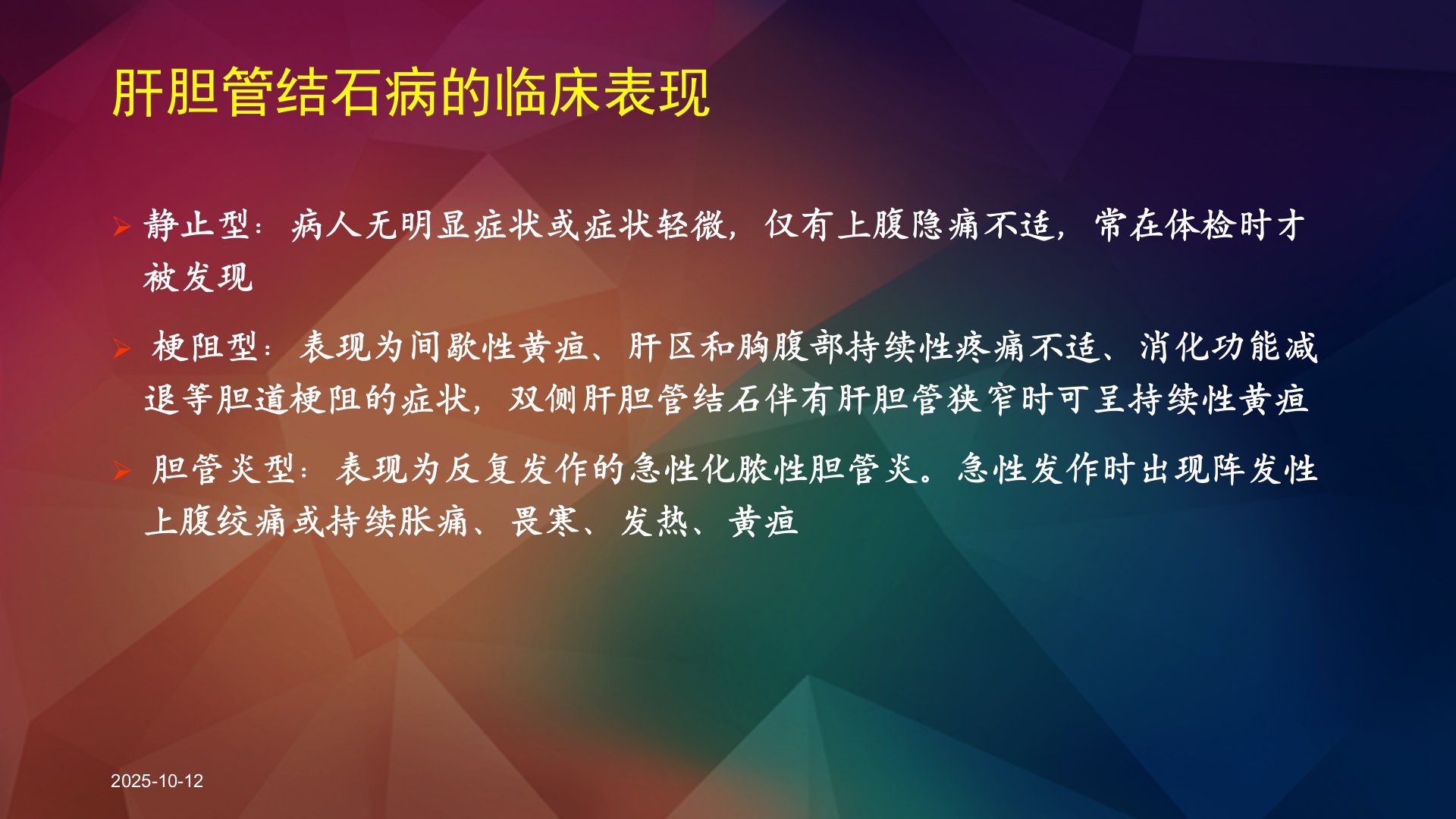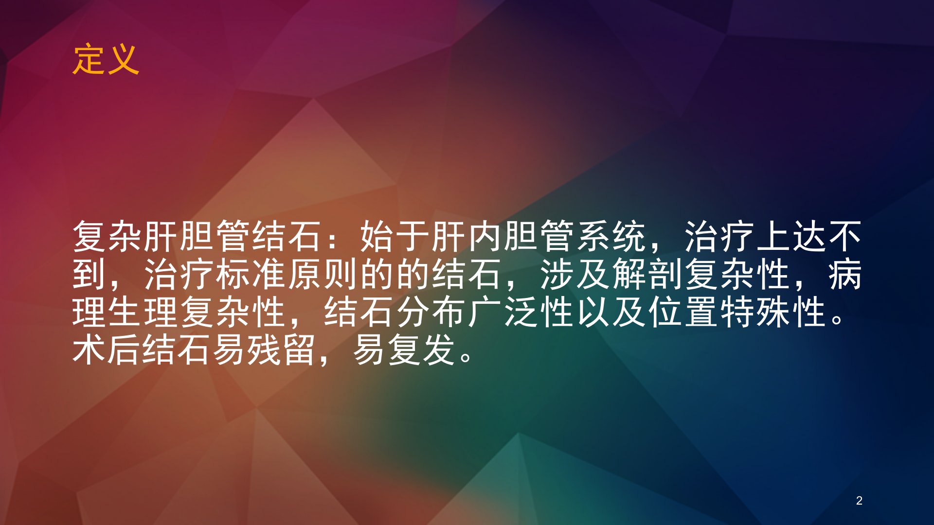 外一科杨凌彬医生介绍了肝胆管结石相关知识。复杂肝胆管结石始于肝内胆管系统涉及解剖、病理生理复杂性等术后结石易残留复发。其临床表现分静止型、梗阻型、胆管炎型。病因与胆道慢性炎症、细菌感染等因素有关是世界性疾病术后残余结石率、复发率等较高。分型上有日本nakayama分型、Tsunoda分型及2011年《中国肝胆管结石病诊断治疗指南》分型后者根据结石分布等分三型及附加型。外科治疗原则为去除病灶、取尽结石等。治疗方法上手术方法有肝胆管切开取石术等多种常需多术式联用肝部分切除术依结石分布选术式肝门部胆管狭窄修复重建术有不同术式c型肝胆管结石适合肝移植术。微创治疗选方法应遵循准则以根治性清除病灶为目标。