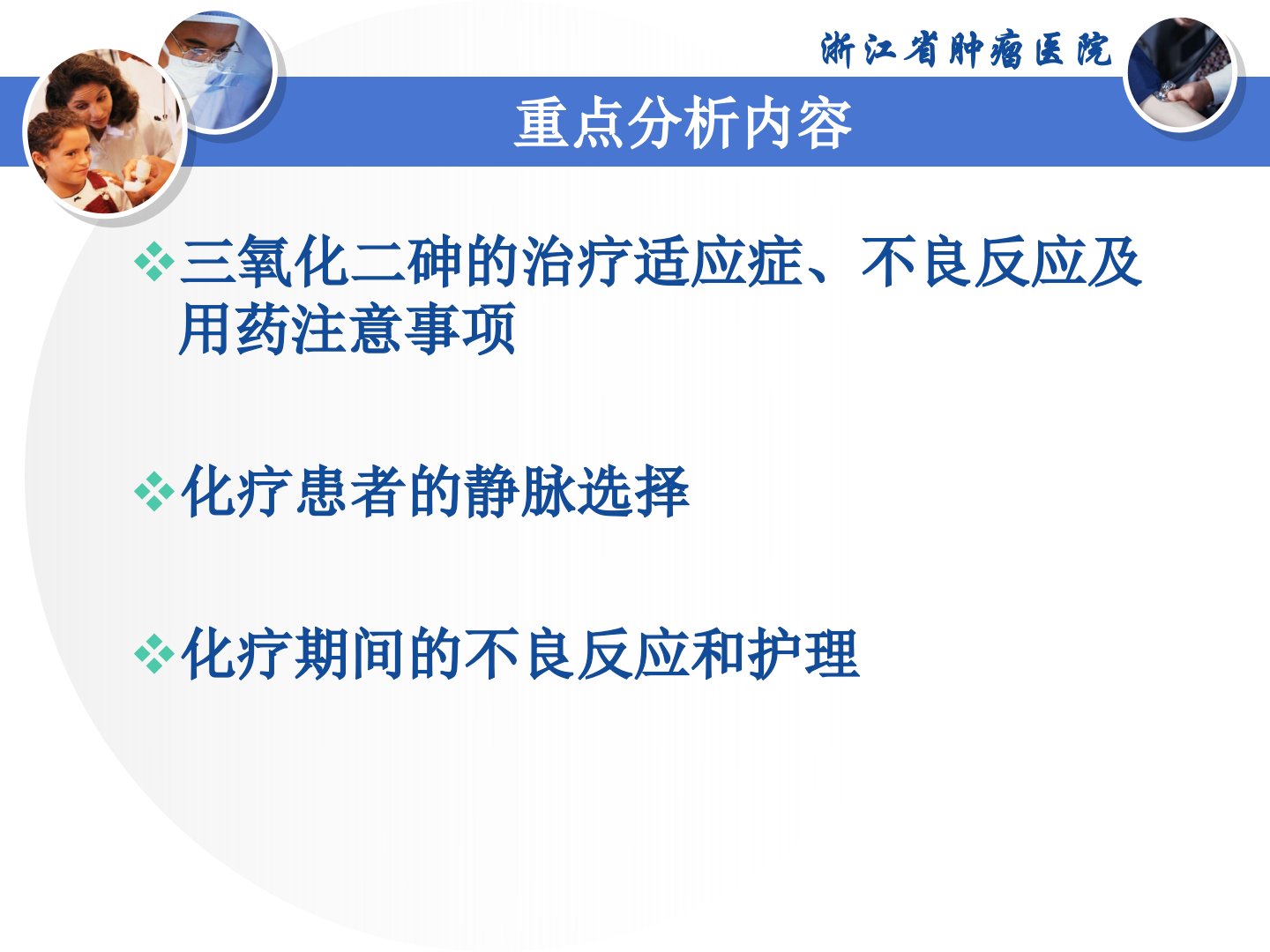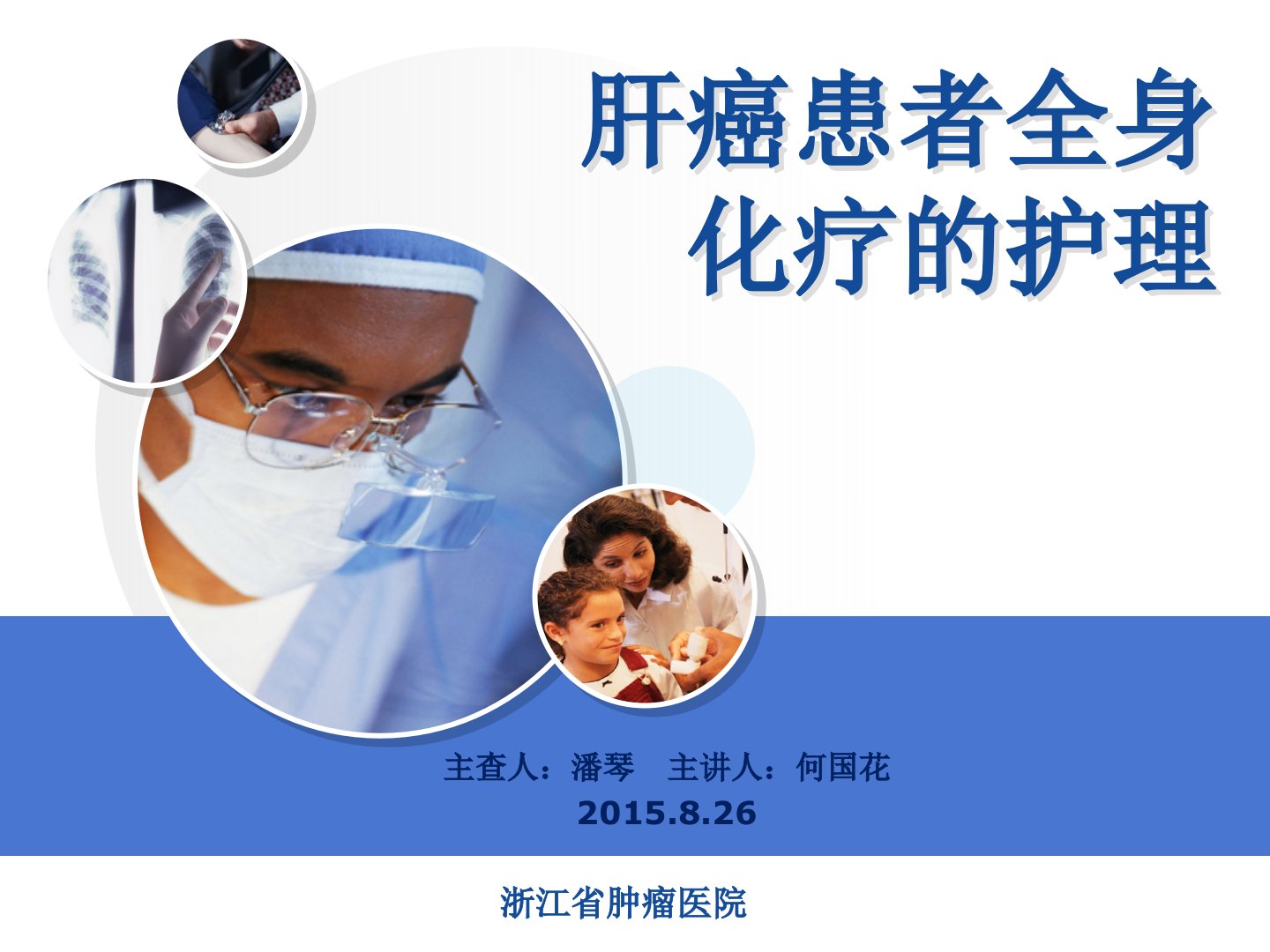 2015年8月26日由潘琴主查、何国花主讲的查房重点分析了肝癌患者全身化疗的护理包括三氧化二砷的治疗适应症、不良反应、用药注意事项化疗患者的静脉选择以及化疗期间的不良反应和护理。54岁男性肝癌患者有肝炎病史经过多次手术和治疗包括射频消融、肝癌切除术、TACE和射频治疗2015年复查发现两肺多发转移肝内病灶部分存活遂采用三氧化二砷化疗。患者化疗期间出现乏力、恶心呕吐等症状经护理后好转。护理问题包括恶心呕吐、焦虑、潜在并发症骨髓抑制、潜在并发症肝肾功能衰竭肝肾综合征。化疗药物分为烷化剂、抗代谢药、抗肿瘤抗生素、植物类抗癌药。静脉化疗病人的不良反应包括静脉炎、化疗药物外渗等。三氧化二砷适用于急性早幼粒细胞白血病和原发性肝癌晚期但有一定不良反应。化疗患者的静脉选择应避免在肘窝处、手足背小血管等部位注射最佳部位是前臂静脉。化疗期间的不良反应包括胃肠道反应、局部毒副反应、骨髓抑制等需采取相应的护理措施。