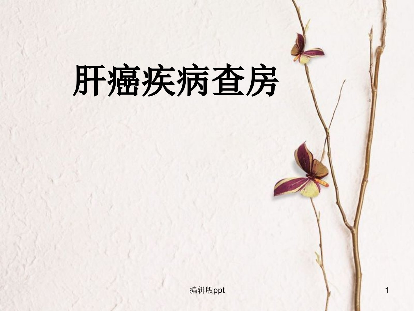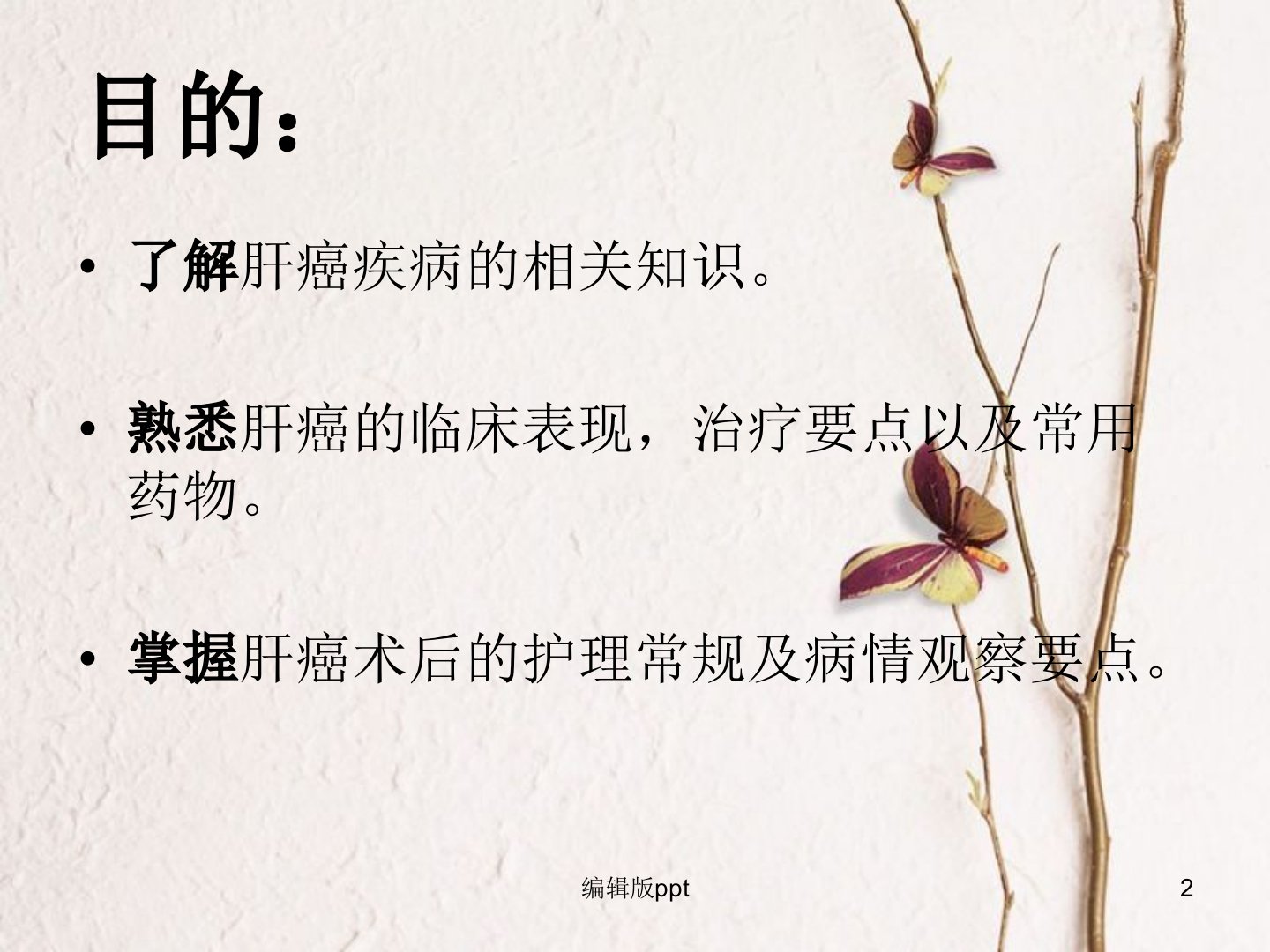 肝癌疾病查房编辑版ppt目的:了解肝癌疾病的相关知识。熟悉肝癌的临床表现,治疗要点以及常用药物。掌握肝癌术后的护理常规及病情观察要点。编辑版ppt疾病概述编辑版ppt概念:肝癌即肝脏恶性肿瘤,是外科疾病中的常见病和多发病,肝脏恶性肿瘤可分为原发性和继发性两大类。原发性肝脏恶性肿瘤起源于肝脏的上皮或间叶组织,前者称为原发性肝癌,是我国高发的,危害极大的恶性肿瘤;后者称为肉瘤,与原发性肝癌相比较较为少见。继发性或称转移性肝癌系指全身多个器官起源的恶性肿瘤侵犯至肝脏。编辑版ppt转移途径:血行转移、淋巴转移、种植转移。肝内血行转移最早、最常见是肝癌早期复发的主因。肝外转移以肺最常见一般多见于胃、胆道...