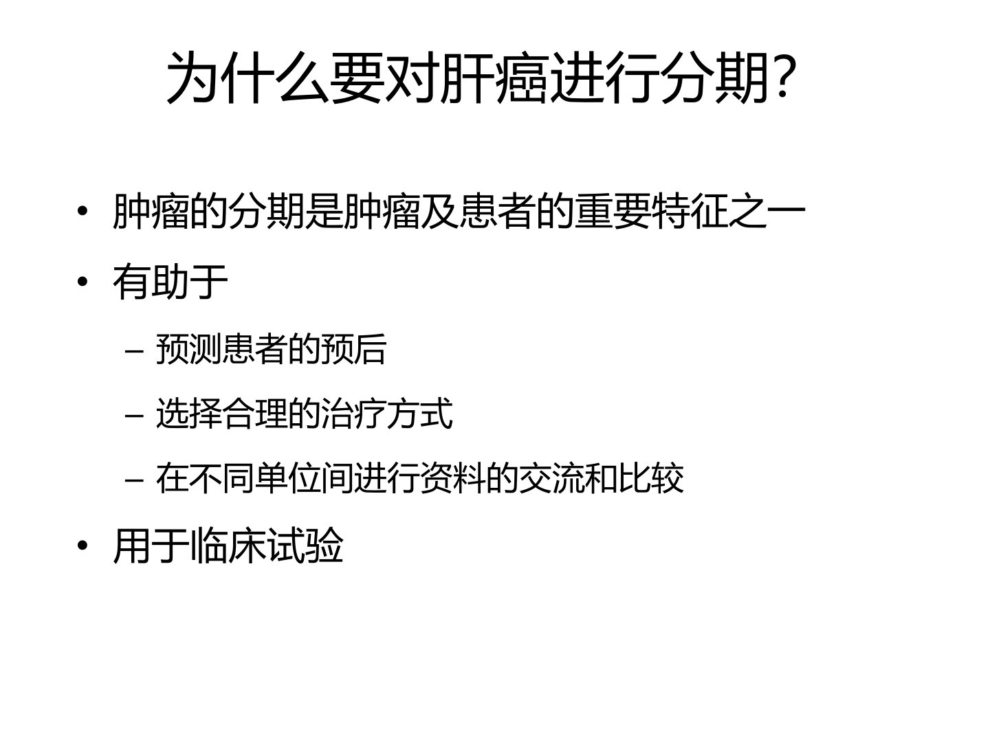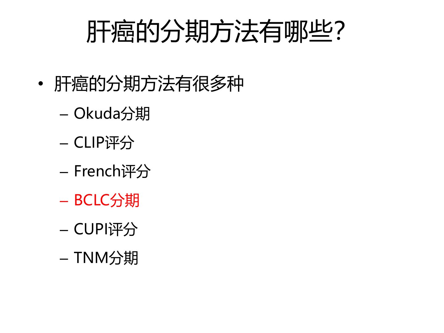 肝癌分期是评估肿瘤及患者特征的重要手段有助于预测预后、选择合理治疗方式、促进资料交流及临床试验。肝癌分期方法多样包括Okuda分期、CLIP评分、French评分、BCLC分期、CUPI评分、TNM分期等其中BCLC分期由巴塞罗那肝癌小组于1999年提出全面考虑了肿瘤、肝功能和全身情况对治疗有指导作用尤其能鉴别早期患者具有循证医学高级别证据支持已被全球广泛采用。ChildPugh分级用于量化评估肝脏功能分数越高肝脏功能越差。实体瘤疗效评价对治疗决策至关重要WHO在1980年确定了评价标准2000年Therasse等发表了RECIST标准2009年更新为RECIST11和mRECIST。mRECIST采用单径测量法以“存活肿瘤”为评估对象排除坏死肿瘤干扰评价更精确、简便且重复性好。