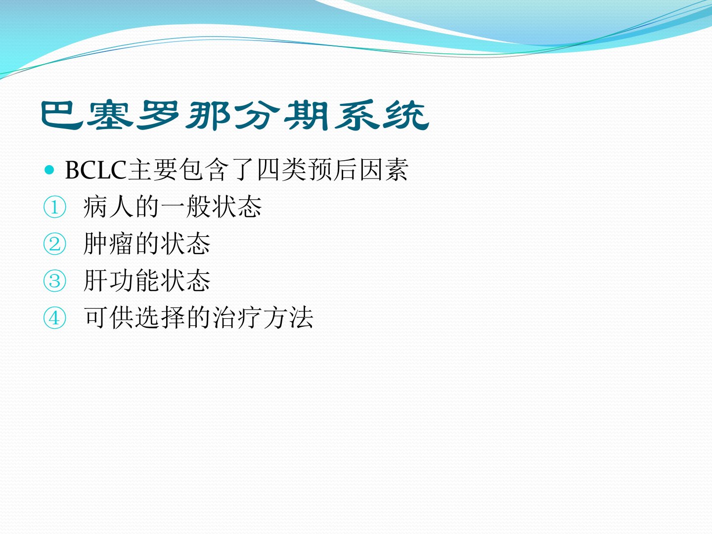 肝癌分期标准中巴塞罗那分期系统(BCLC)由Llovet于1999年提出用于评估病情、制定治疗方案及预测预后。该系统包含病人一般状态、肿瘤状态、肝功能及可供选择的治疗方法四类预后因素并通过病情评分系统(PST)对病人状态进行评分。BCLC将肝癌分为最早期、早期、中期、晚期和终末期五类早期再分四个亚组分类和预测预后能力强且提出针对不同病人采取不同治疗方法的理念。米兰标准由Mazzaferro等于1996年推荐用于衡量和定义早期肝癌符合此标准者肝移植疗效肯定但过于严格且对肿瘤生物学特征考虑不足。杭州标准由浙江大学医学院附属第一医院提出可有效扩大低危肝癌患者实施肝移植的安全遴选范围更适合我国肝癌人群。