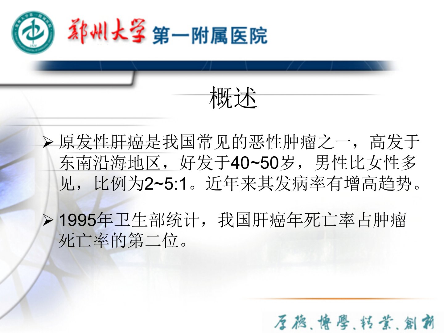 肝癌是肝胆外科常见病分原发性和继发性两类原发性高发于我国东南沿海4050岁男性多见近年发病率增高。发病原因主要有肝炎病毒、黄曲霉毒素、饮水污染等在我国HBV感染是主要致癌因素。肝癌发病隐匿侵袭性高生长快速治疗困难临床表现包括肝区疼痛、全身和消化道症状、肝肿大等常见转移途径为血性转移。诊断方法包括血清AFP检测、超声、CT、MRI等肝穿刺活检是金标准。治疗首选手术也可采用肝移植5年生存率3040微小肝癌可达90;非手术治疗方法首选TACE还有射频消融、微波等;药物治疗包括免疫治疗和中医中药治疗。护理包括术前改善营养、防治肝癌破裂、心理护理等术后注意监测生命体征、饮食护理、预防感染等TACE术后需特殊护理。健康指导包括积极治疗肝炎和肝硬化、定期检查、合理饮食等。肝癌预后差但全面护理可降低并发症提高生活质量。