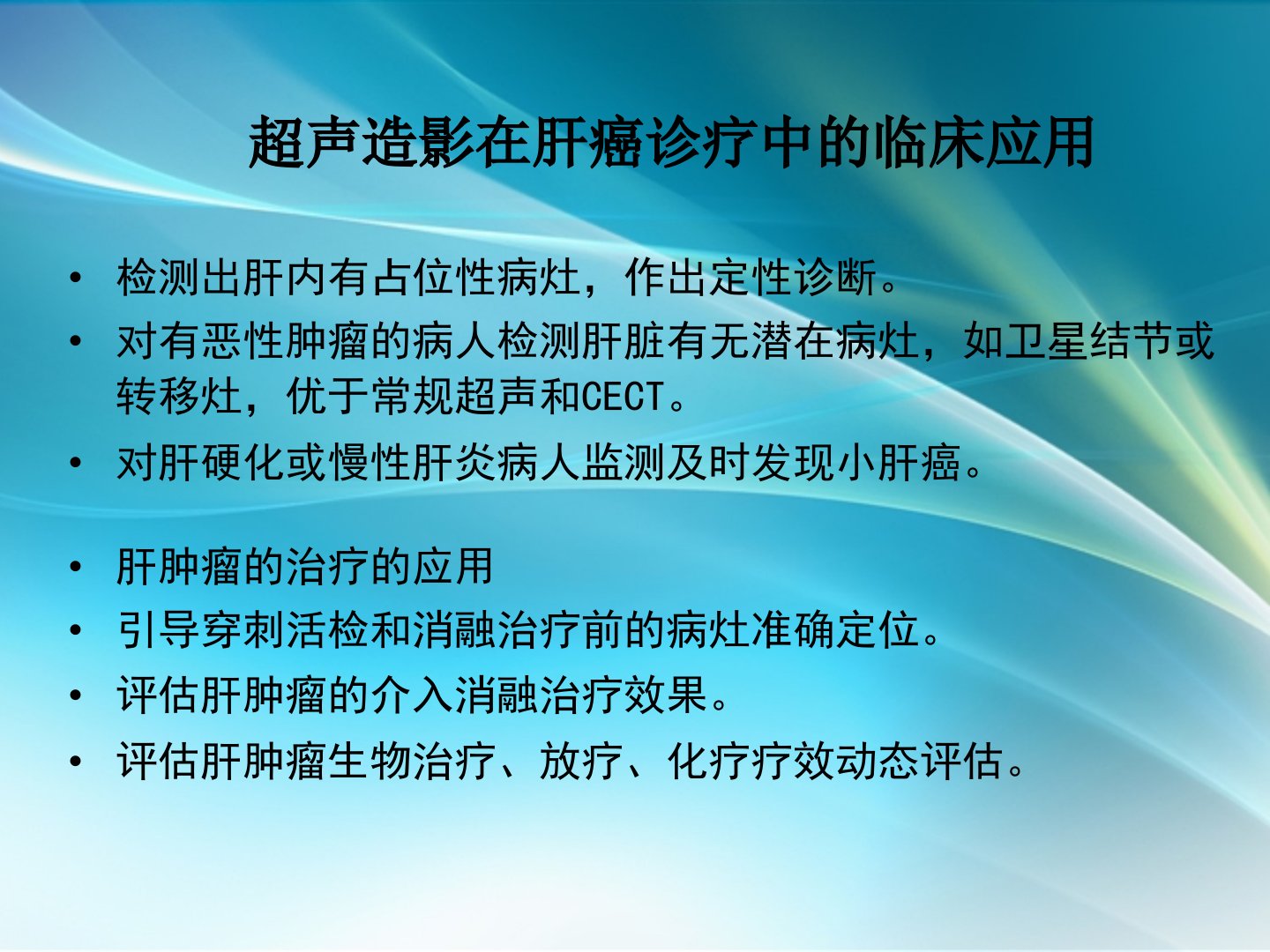 广西医科大学黄健源教授介绍了超声造影在肝癌诊疗中的临床应用:可检测出肝内占位性病灶并定性诊断对检测恶性肿瘤潜在病灶、监测肝硬化或慢性肝炎病人小肝癌有优势;在治疗中可引导穿刺活检和消融治疗前定位评估介入消融、生物治疗、放疗、化疗疗效。不同肝脏疾病的超声造影增强方式不同:肝细胞性肝癌动脉相快速增强后快速消退实质相低回声;富血供性转移灶动脉相快速增强门脉相早期等回声晚期低回声;少血管性转移灶动脉相边缘增强门脉相和实质相消退;血管瘤造影剂渐进向心性填充;局灶性结节增生动脉相快速离心性增强可见中央疤痕。此外超声造影还可解决肝肿瘤经皮穿刺治疗前、中、后的问题明确有无残存肿瘤组织。