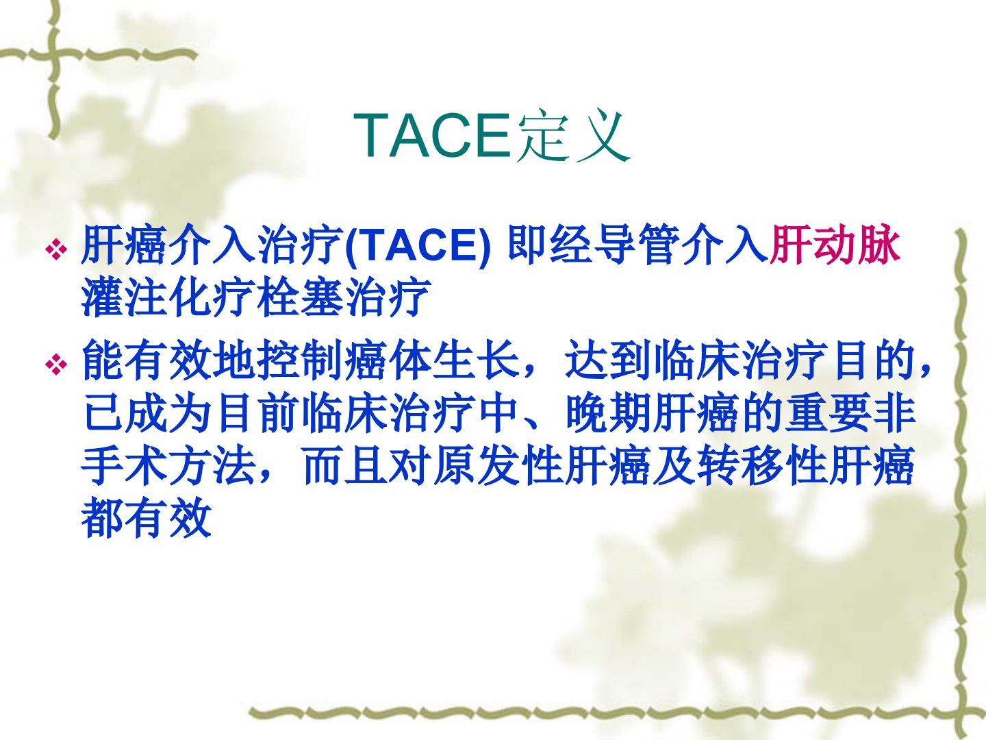 TACE(经导管介入肝动脉灌注化疗栓塞治疗)是治疗中、晚期肝癌的重要非手术方法对原发性及转移性肝癌均有效。其发展历经多个阶段现已实现超选择性血管内灌注化疗栓塞。TACE特点包括微创、定位准确、疗效明显、重复性好、副作用少等是原发性肝癌非手术治疗的首选方案。适应症涵盖不能耐受手术或不愿手术的肝癌、中晚期肝癌等。禁忌症分为相对禁忌症(如肿瘤过大、肝功能较差等)和绝对禁忌症(如肝功能childc级、严重心肺疾病等)。术前需禁食、碘过敏试验、备药备皮等并选择合适的栓塞剂和化疗药物。操作过程采用Seldinger技术术后需增加输液、使用抗生素等常规护理要求绝对卧床、穿刺侧肢体制动等并密切观察生命体征和穿刺局部情况及时处理异常。同时针对可能出现的肾功能损害、发热、腹痛、胃肠道反应等情况也需采取相应护理措施。