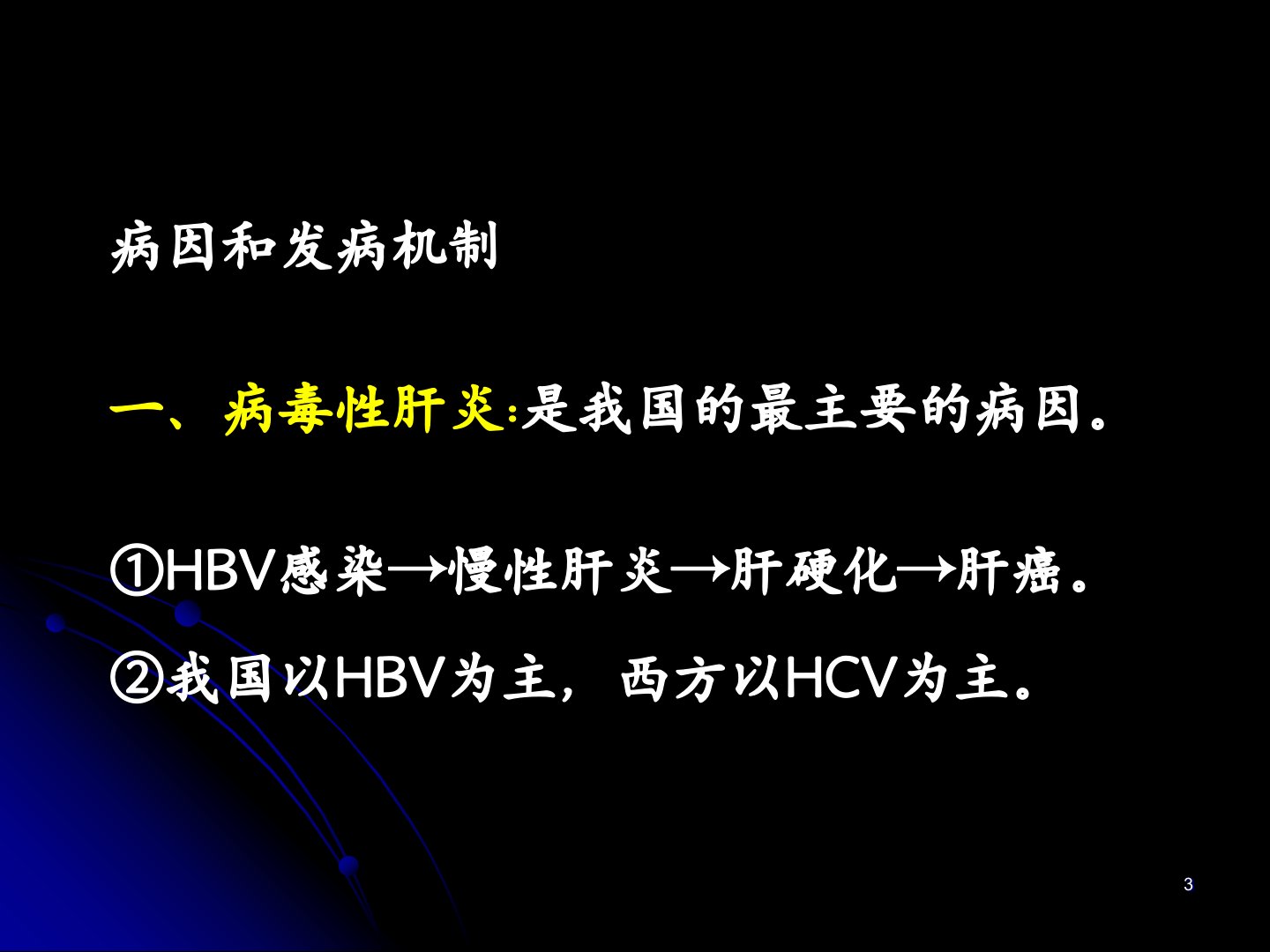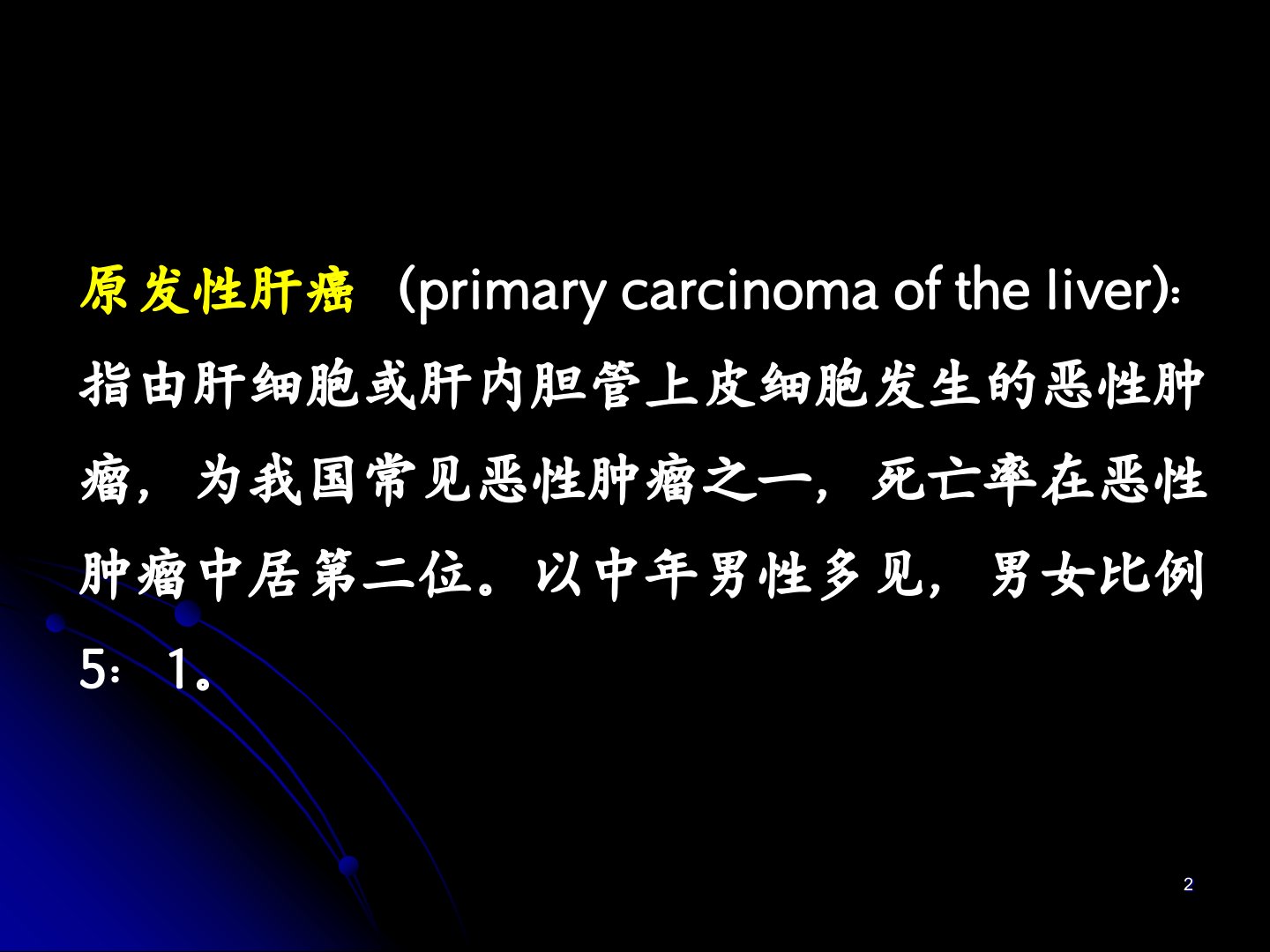 原发性肝癌(primarycarcinomaoftheliver)指由肝细胞或肝内胆管上皮细胞发生的恶性肿瘤为我国常见恶性肿瘤之一死亡率居第二位以中年男性多见。其病因和发病机制多样包括病毒性肝炎(我国以HBV为主西方以HCV为主)、食物与饮水(长期大量饮酒、黄曲霉毒素污染等)、毒物与寄生虫(亚硝胺类、血吸虫等)以及遗传因素。病理上原发性肝癌大体形态分型以块状型最多见结节型较多见弥漫型少见;组织学类型以肝细胞肝癌最多见约90。其转移途径包括肝内转移(最早出现多为血行转移)和肝外转移(血行转移最常见的是肺转移淋巴转移最多到肝门淋巴结种植转移少见)。临床表现上原发性肝癌起病隐匿中晚期主要表现包括肝区疼痛、肝大、黄疸等还可能出现肝硬化征象、恶性肿瘤的全身表现、转移灶症状及伴癌综合征。并发症包括肝性脑病、上消化道出血等。实验室检查方面肝癌标记物检测中甲胎蛋白(AFP)应用于普查、诊断等其他肝癌标志物有助于AFP阴性肝癌的诊断。影像学检查兼有定位与定性功能超声检查是首选增强CT、MRI及选择性肝动脉造影等也有重要价值。肝穿刺活体组织检查是确诊肝癌的最可靠方法。诊断精髓在于早期诊断高危人群需定期检查