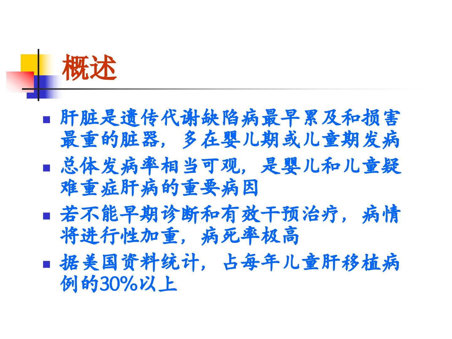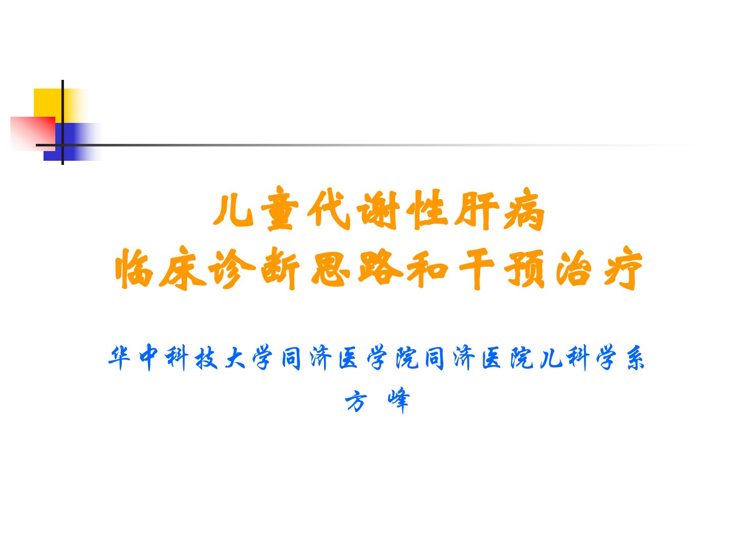 儿童代谢性肝病多在婴儿期或儿童期发病是疑难重症肝病的重要病因若未及时诊治病情将进行性加重病死率高。病因多为单基因突变导致的蛋白质结构、功能异常分为碳水化合物、氨基酸、脂类、胆汁酸等代谢障碍。临床特点包括代酸、低血糖、生长障碍等。诊断思路包括确定高危征象、生化初筛实验、血清铜兰蛋白筛查等并通过异常代谢产物检测、酶活性测定、基因分析等确诊。常见代谢性肝病检查包括空腹低血糖、代谢性酸中毒等检测及肝活检病理诊断。干预治疗包括饮食疗法如去乳糖、去果糖和蔗糖;酶及代谢产物替代疗法;纠正代谢产物异常;单基因转移治疗;PFIC的手术治疗;肝移植可纠正部分缺陷的代谢性肝病如Wilson病、1AT缺乏症等。