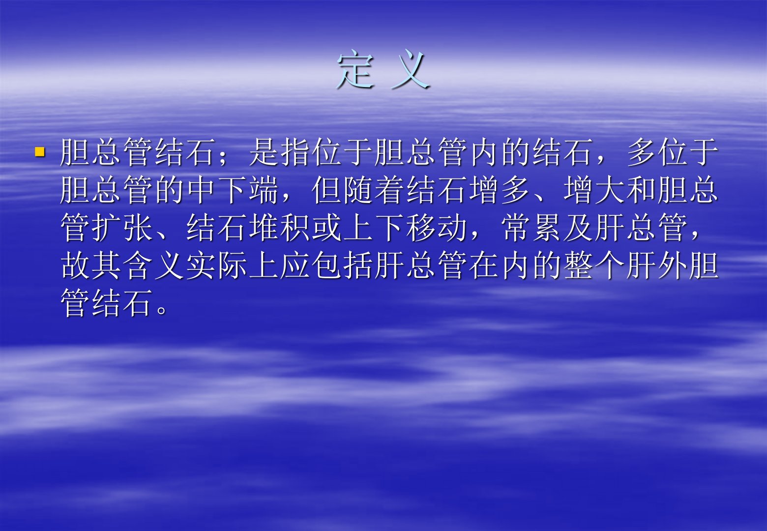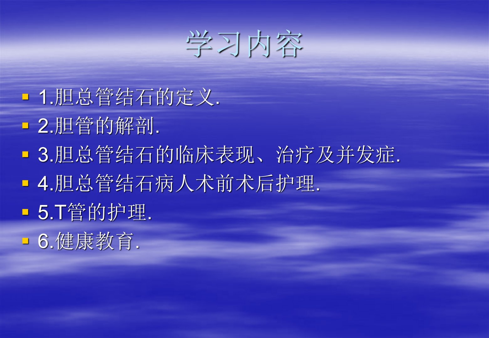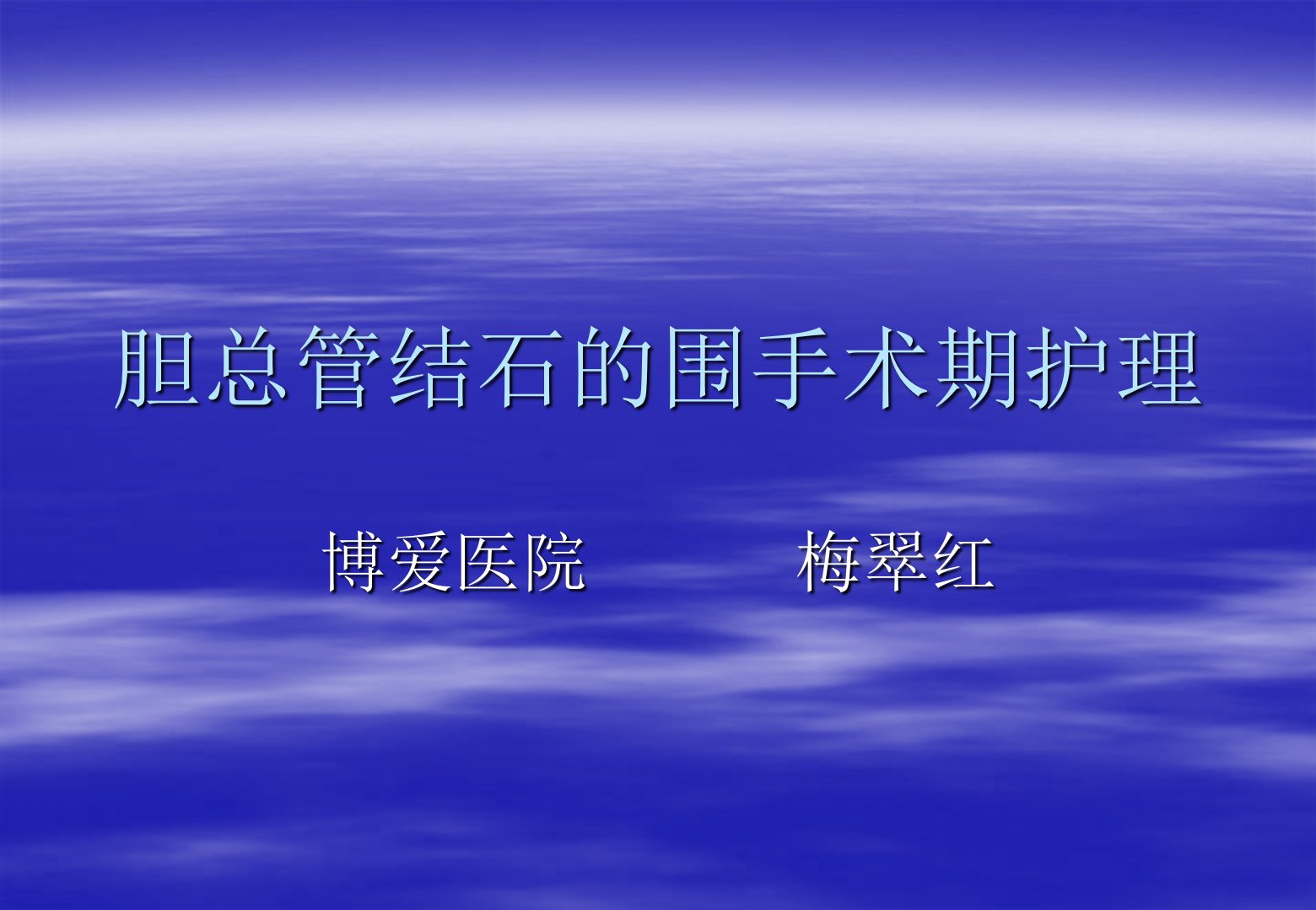 胆总管结石的围手术期护理博爱医院梅翠红学习内容1、长期饮食无规律者,不吃早餐的人群注意预防胆总管结石。2、偏食容易导致胆总管结石,比如爱吃肉类,动物内脏等,爱吃辛辣,多盐、糖的食物。3、年龄30-50岁之间的人群和老年人容易患胆总管结石,女性多于男性,比例为2:1,农村发病率高。4、有长期的胆道病史、或伴有寒战发热、黄疸的急性胆管炎史比较易患肝内胆管结石,注意饮食预防。.黄疸:结石堵塞胆管后,胆红素逆流入血,病人出现黄疸。由于黄疸的程度与梗阻的程度,是否继发感染及阻塞的解释是否松动有关,故临床上,黄疸多呈间歇性和波动性。4.严重者还会出现休克、意识障碍等。本病较胆囊结石发病急,症状严重,治疗困...