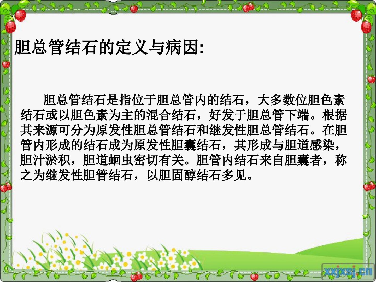 胆总管结石胆总管结石的定义与病因:胆总管结石是指位于胆总管内的结石,大多数位胆色素结石或以胆色素为主的混合结石,好发于胆总管下端。根据其来源可分为原发性胆总管结石和继发性胆总管结石。在胆管内形成的结石成为原发性胆囊结石,其形成与胆道感染,胆汁淤积,胆道蛔虫密切有关。胆管内结石来自胆囊者,称之为继发性胆管结石,以胆固醇结石多见。临床表现:胆总管结石的临床表现及病情的轻、重、危,完全取决于结石阻塞时的程度和有无胆道感染。病人常伴非特异性消化道症状,如上腹部不适,呃逆,嗳气。胆管未被全部阻塞前也可以无明显症状,但由于饮食等因素导致结石阻塞胆总管,病人会突然出现下述一系列症状,主要表现为:(1)上腹痛...