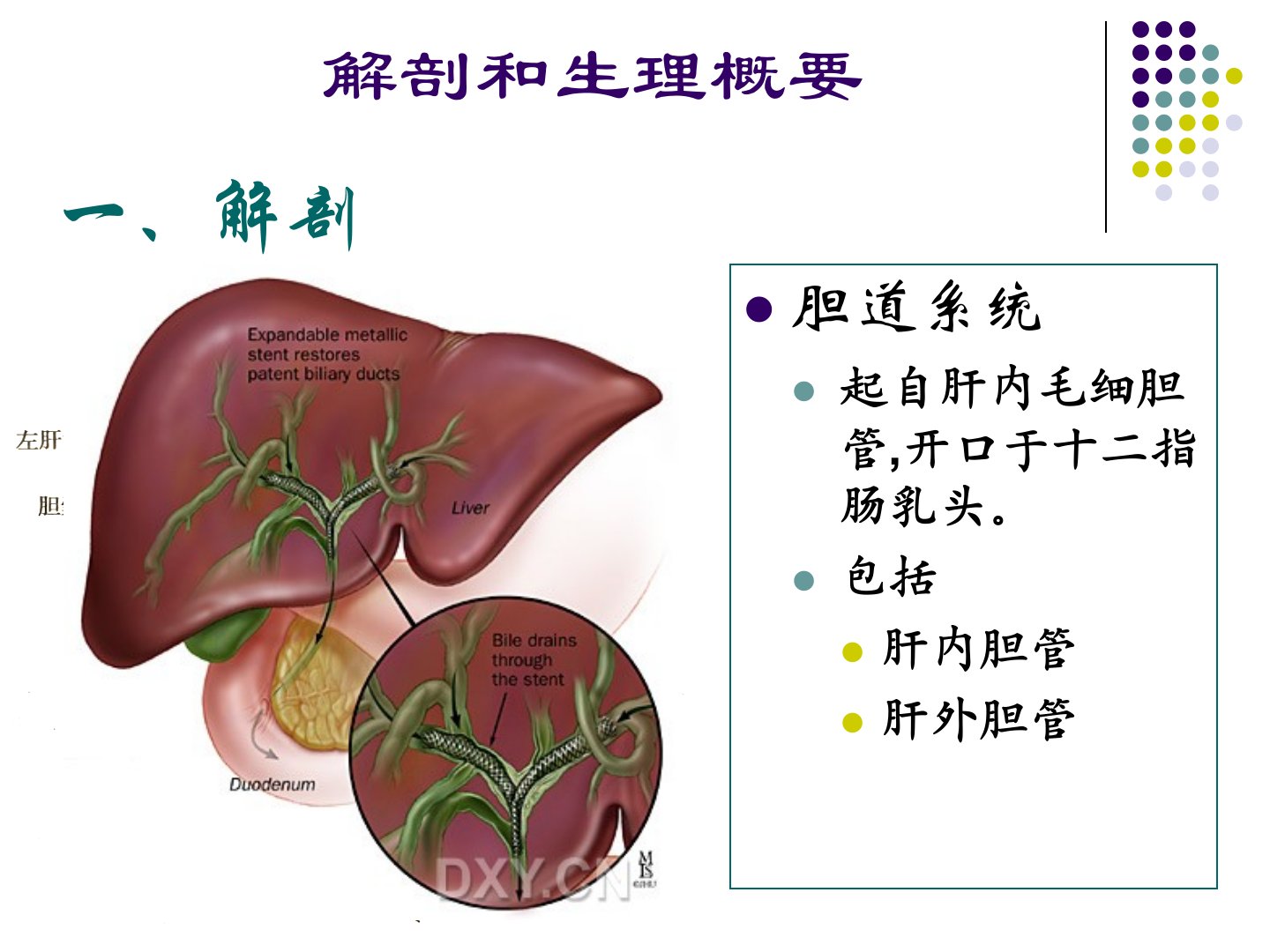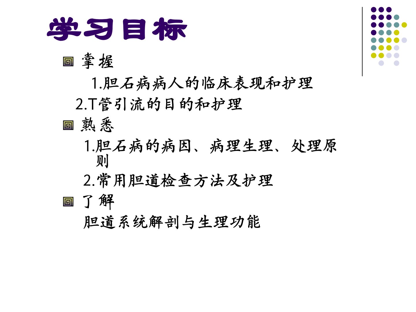 胆石症学习目标包括掌握胆石病临床表现、护理及T管引流目的与护理;熟悉胆石病病因、病理生理、处理原则及胆道检查方法;了解胆道解剖生理。胆道系统起自肝内毛细胆管开口于十二指肠乳头包括肝内、外胆管生理功能包括分泌、贮存、浓缩、输送胆汁等。胆石病指发生在胆囊和胆管的结石分为胆固醇、胆色素、混合型结石成因复杂与胆道感染、梗阻、异物、代谢异常等因素有关。胆囊结石主要为胆固醇结石常与急性胆囊炎并存病因与脂类代谢异常、细菌感染等有关表现为胆绞痛、上腹隐痛等处理原则首选胆囊切除术。胆管结石分原发性和继发性肝内、肝外病因与胆道感染、胆汁淤滞等有关临床表现取决于胆道有无梗阻及感染处理原则以手术治疗为主。常见护理诊断包括疼痛、体温过高、营养失调、皮肤受损危险、潜在并发症。护理措施包括减轻疼痛、控制体温、加强营养、防止皮肤受损、预防并发症。健康教育包括指导低脂饮食、T管自我护理、遵医嘱复查等。T管引流术目的为引流胆汁减压、引流残余结石、支撑胆道等护理包括妥善固定、保持通畅、观察记录、预防感染等。