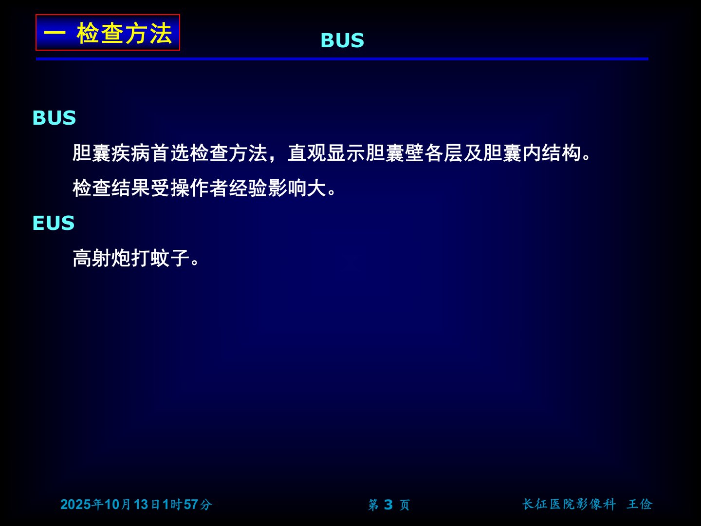 胆囊炎影像诊断一检查方法BUS胆囊疾病首选检查方法,直观显示胆囊壁各层及胆囊内结构。检查结果受操作者经验影响大。EUS高射炮打蚊子。一检查方法BUS第页优点:操作简便,费用低廉,无创,无明确禁忌证,对高密度病变价值高。缺点:对等/低密度病变价值低(胆系结石多为阴性结石),定位价值有限。一检查方法平片第页优点:1、对阴性结石价值高2、可显示胆囊浓缩功能3、可显示胆囊收缩功能4、有利于胆结石、肾结石鉴别缺点:1、肝内外胆管显示能力差2、肝功能差者,显示不佳3、对息肉等小病变,价值有限4、造影剂难求,已淘汰一检查方法口服胆囊造影第页无创性胆管显影。胆管显影浓度较低,尤其是胆红素浓度较高时可不显影。胆...