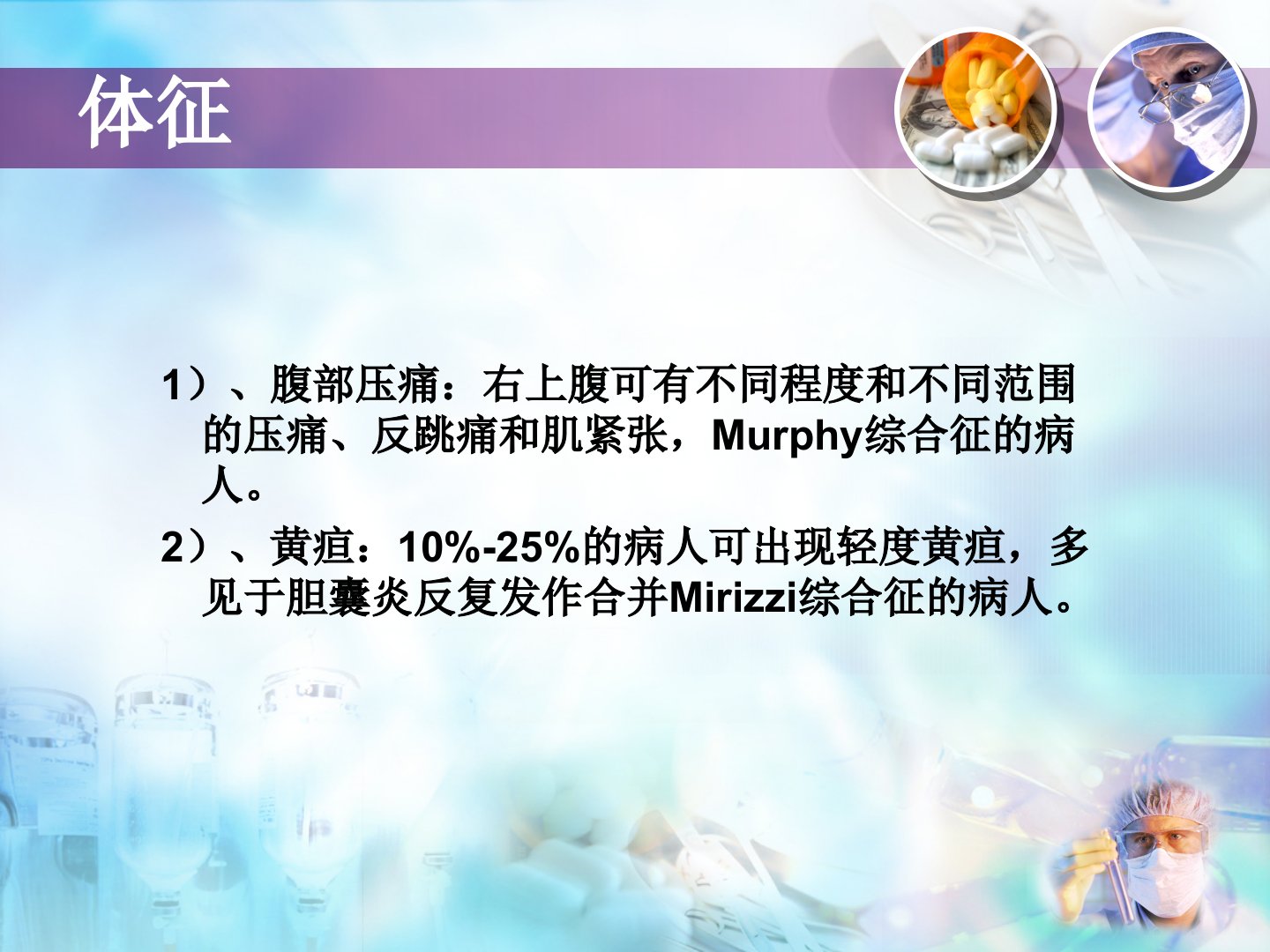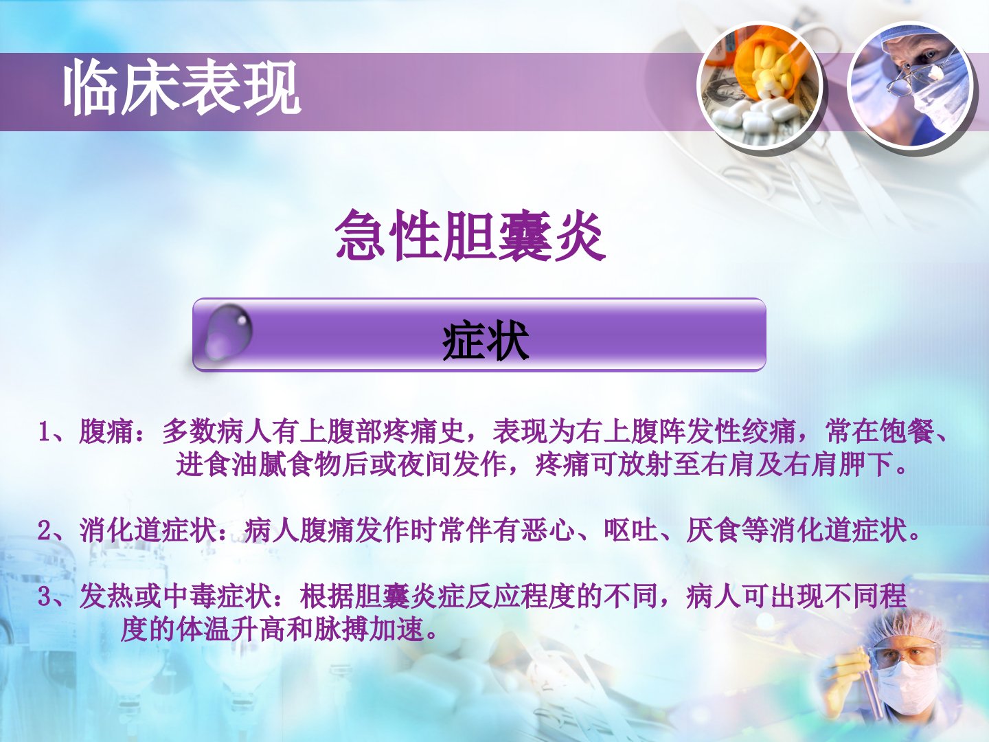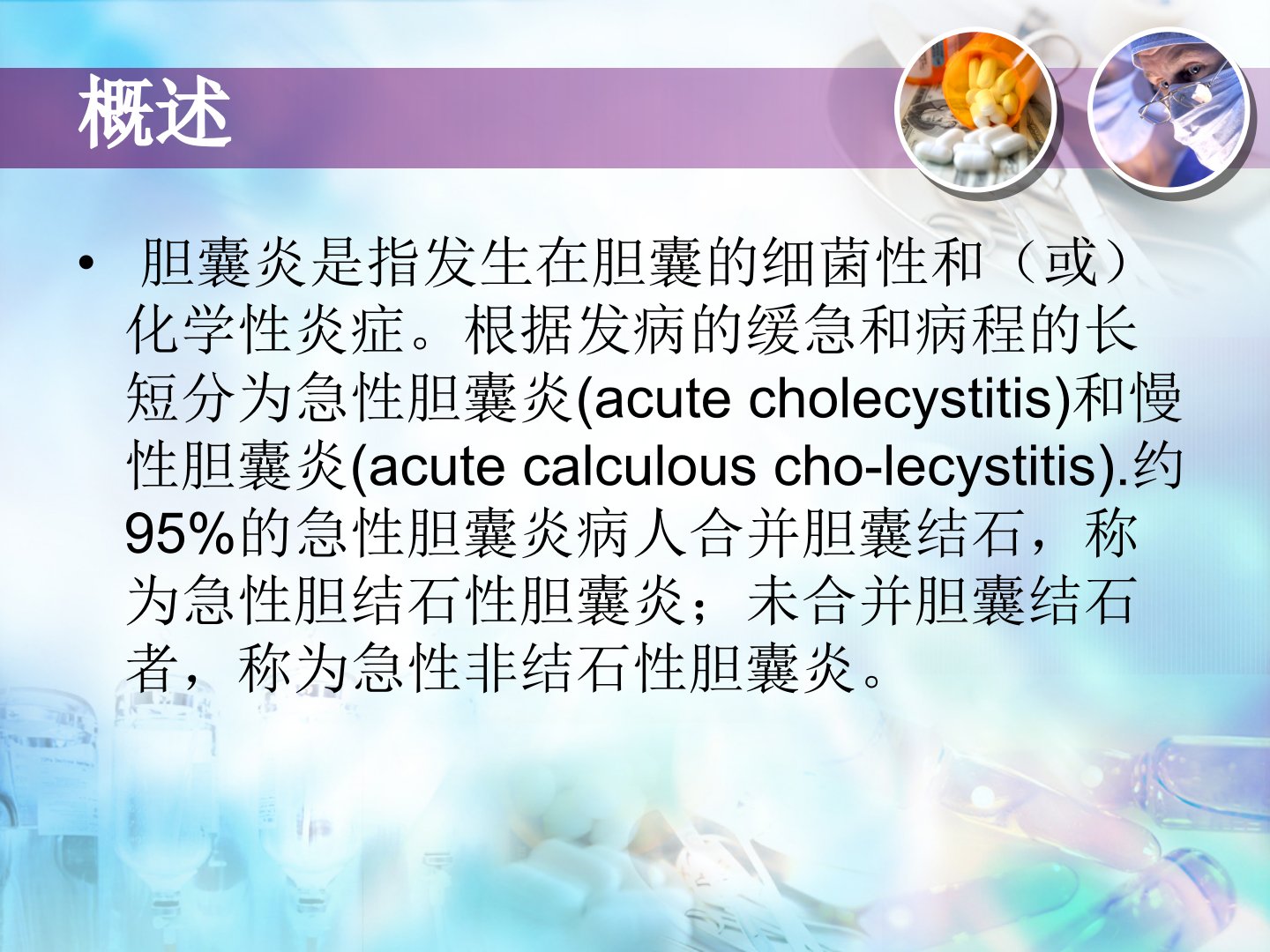 胆囊炎指发生在胆囊的细菌性和(或)化学性炎症分为急性和慢性两类其中约95的急性胆囊炎病人合并胆囊结石。急性胆囊炎主要表现为右上腹阵发性绞痛常在饱餐后或夜间发作伴有恶心、呕吐等消化道症状以及不同程度的发热。体征包括腹部压痛、反跳痛、肌紧张部分病人有轻度黄疸。慢性胆囊炎症状不典型多为上腹部饱胀不适、厌食油腻等消化不良症状。处理原则主要为手术治疗手术时机和方式取决于病情。非手术治疗适用于病情较轻或不能耐受手术的病人包括禁食、胃肠减压、纠正水、电解质紊乱等。常见护理诊断问题包括疼痛、体液不足危险及潜在并发症胆囊穿孔护理措施包括减轻疼痛、维持体液平衡及预防并发症。健康教育方面建议病人合理安排作息低脂饮食非手术治疗及胆囊造口术病人应遵医嘱出现腹痛、发热等症状及时就诊。