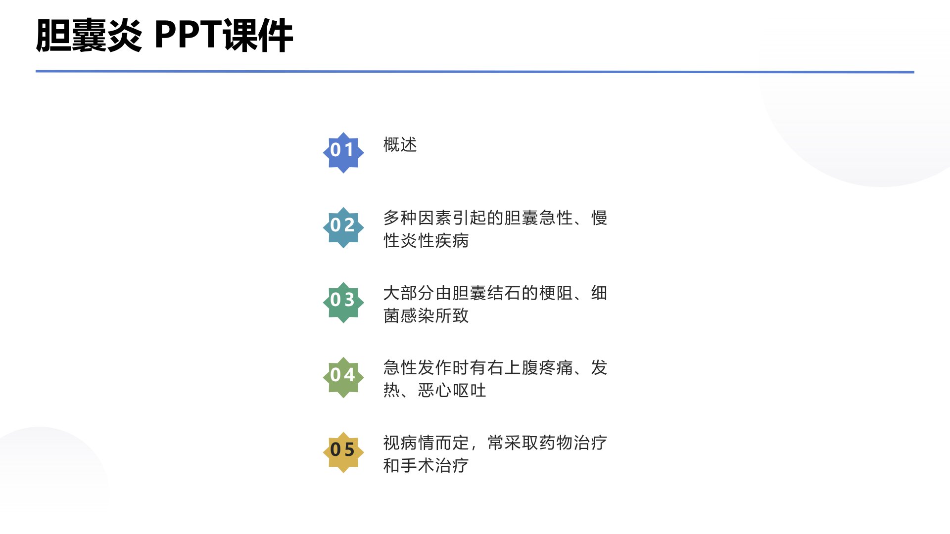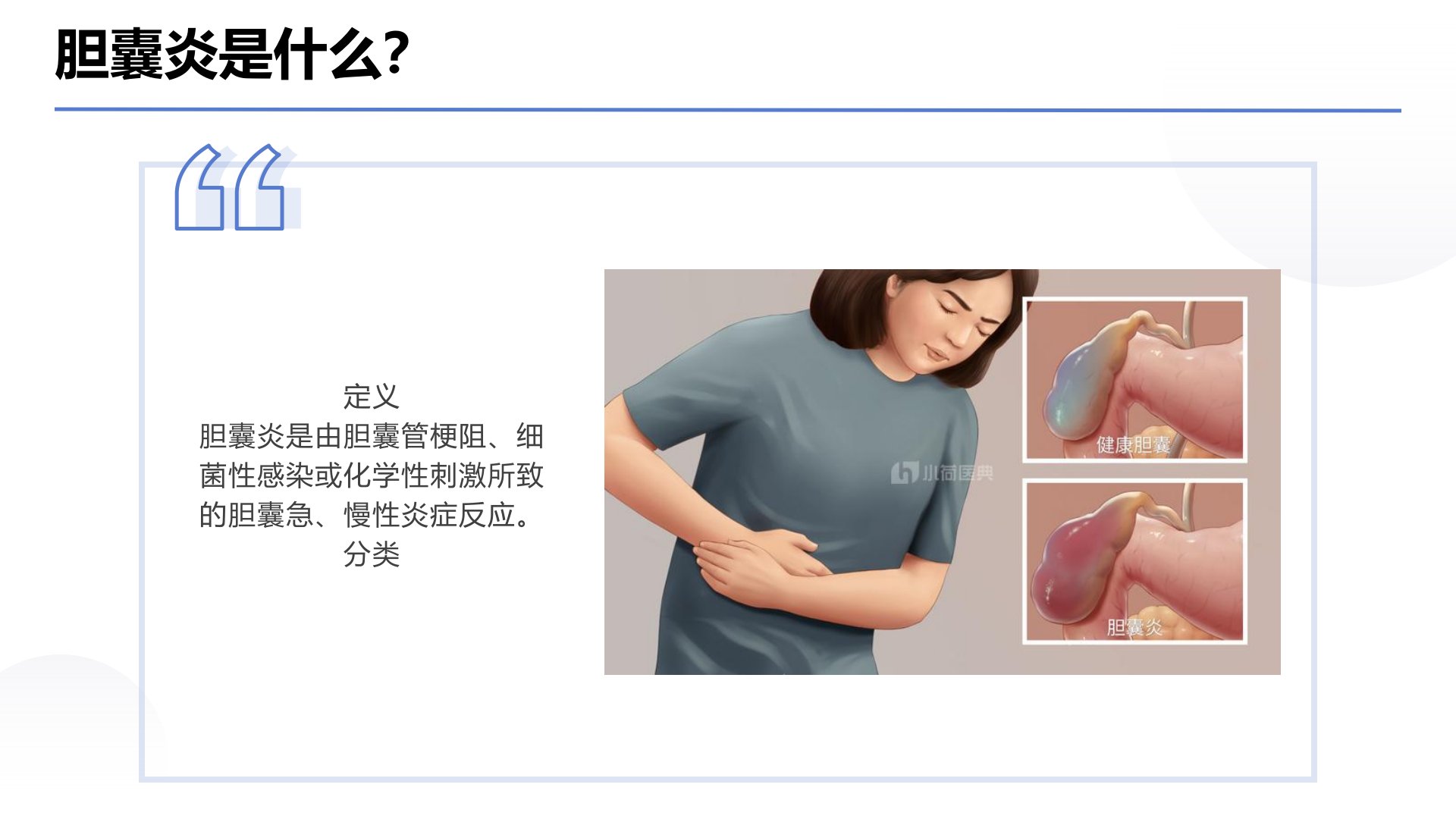 胆囊炎PPT课件演讲人胆囊炎PPT课件01概述02多种因素引起的胆囊急性、慢性炎性疾病03大部分由胆囊结石的梗阻、细菌感染所致04急性发作时有右上腹疼痛、发热、恶心呕吐05视病情而定,常采取药物治疗和手术治疗胆囊炎是什么?定义胆囊炎是由胆囊管梗阻、细菌性感染或化学性刺激所致的胆囊急、慢性炎症反应。分类按病程分类急性胆囊炎:是临床常见急腹症之一。约95%以上的患者有胆囊结石,称结石性胆囊炎;约5%患者无胆囊结石,称非结石性胆囊炎。慢性胆囊炎:一般是由长期存在的胆囊结石所致的胆囊慢性炎症,或者由急性胆囊炎反复发生,迁延而来。按病因分类结石性胆囊炎:胆囊结石嵌顿导致胆汁排出不畅,或细菌感染造成胆囊黏...