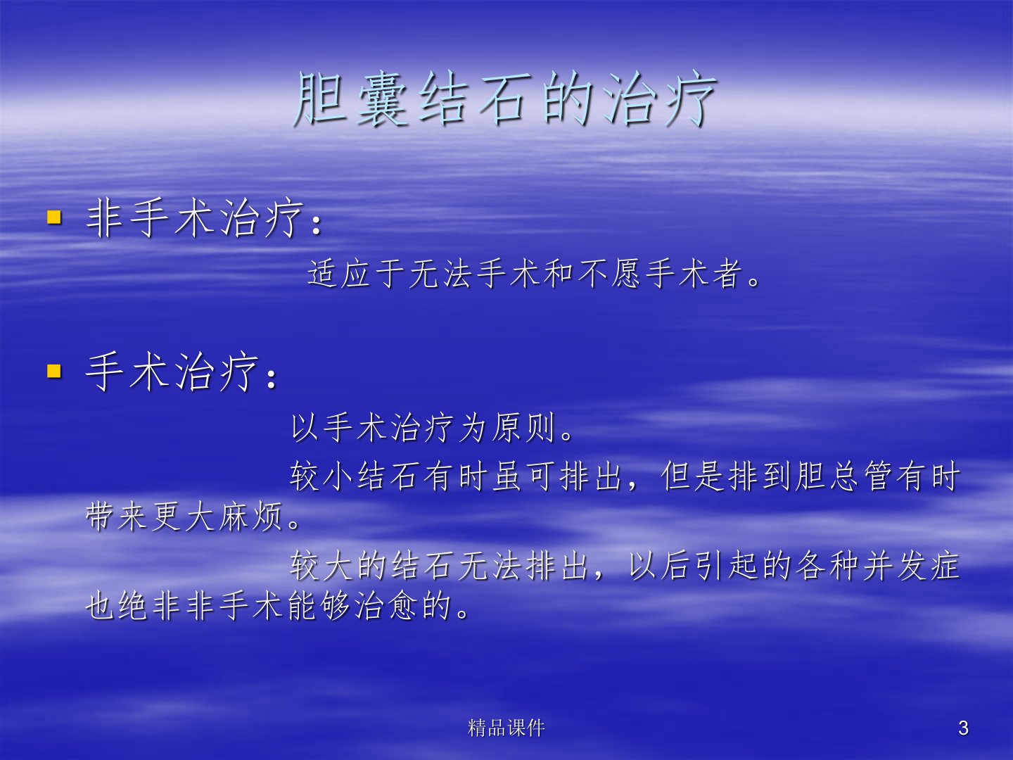 精品课件《胆囊结石治疗进展——保胆取石》摘要该课件围绕胆囊结石治疗展开介绍多种治疗方法。非手术治疗适用于无法或不愿手术者急性发作期需禁食、胃肠减压等非急性发作期药物溶石效果差中药可辨证施治体外碎石因易造成胆管堵塞危害大于治疗。手术治疗以切除胆囊为原则但存在诸多弊端忽视了胆囊的生理功能。手术治疗历经开腹胆囊切开取石术、开腹胆囊切除术等但存在创伤大、并发症多、复发率高等问题。内镜外科技术带来巨大进步腹腔镜胆囊切除术成为主流但胆囊切除也有造成胆道损伤、消化不良等弊端。新式内镜微创保胆取石术是创新降低了复发率。满足胆囊功能良好等条件可保胆取石同时介绍了保胆取石的禁忌症。目前“内镜微创保胆技术”已写入教科书得到众多医学大家重视。