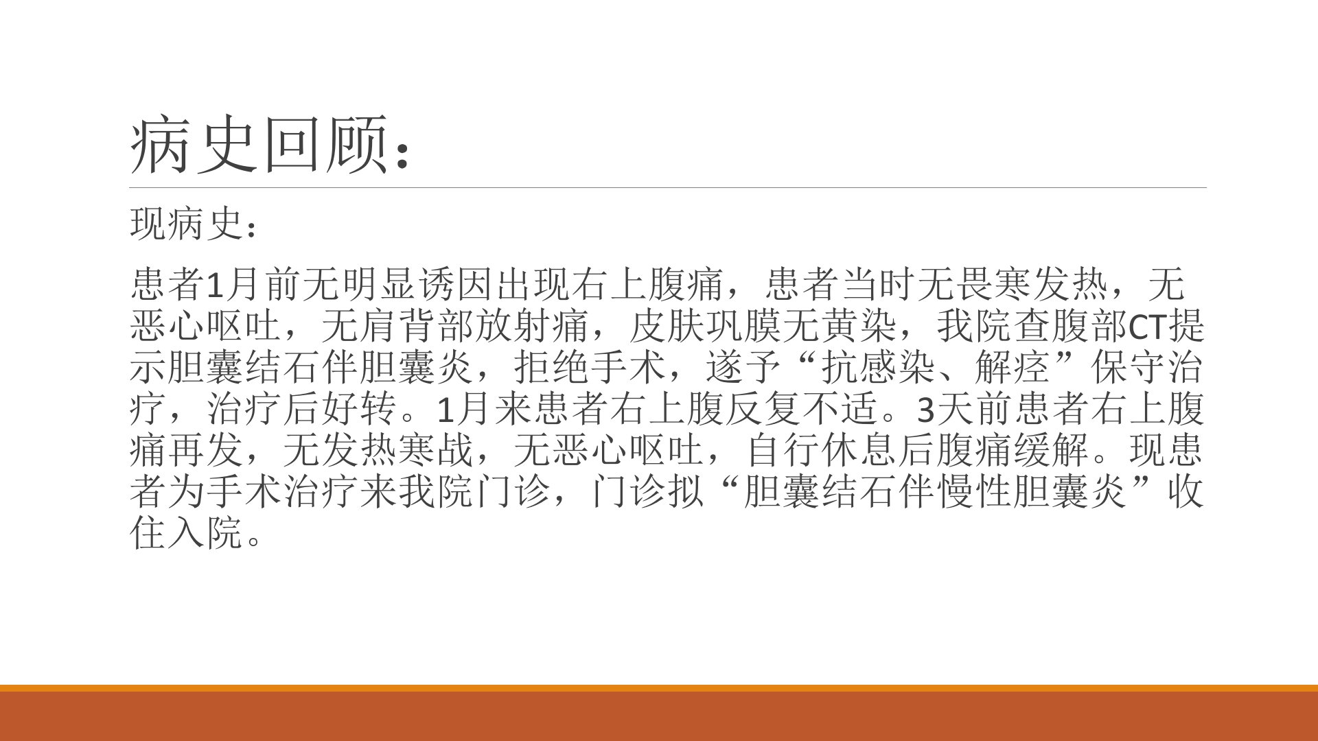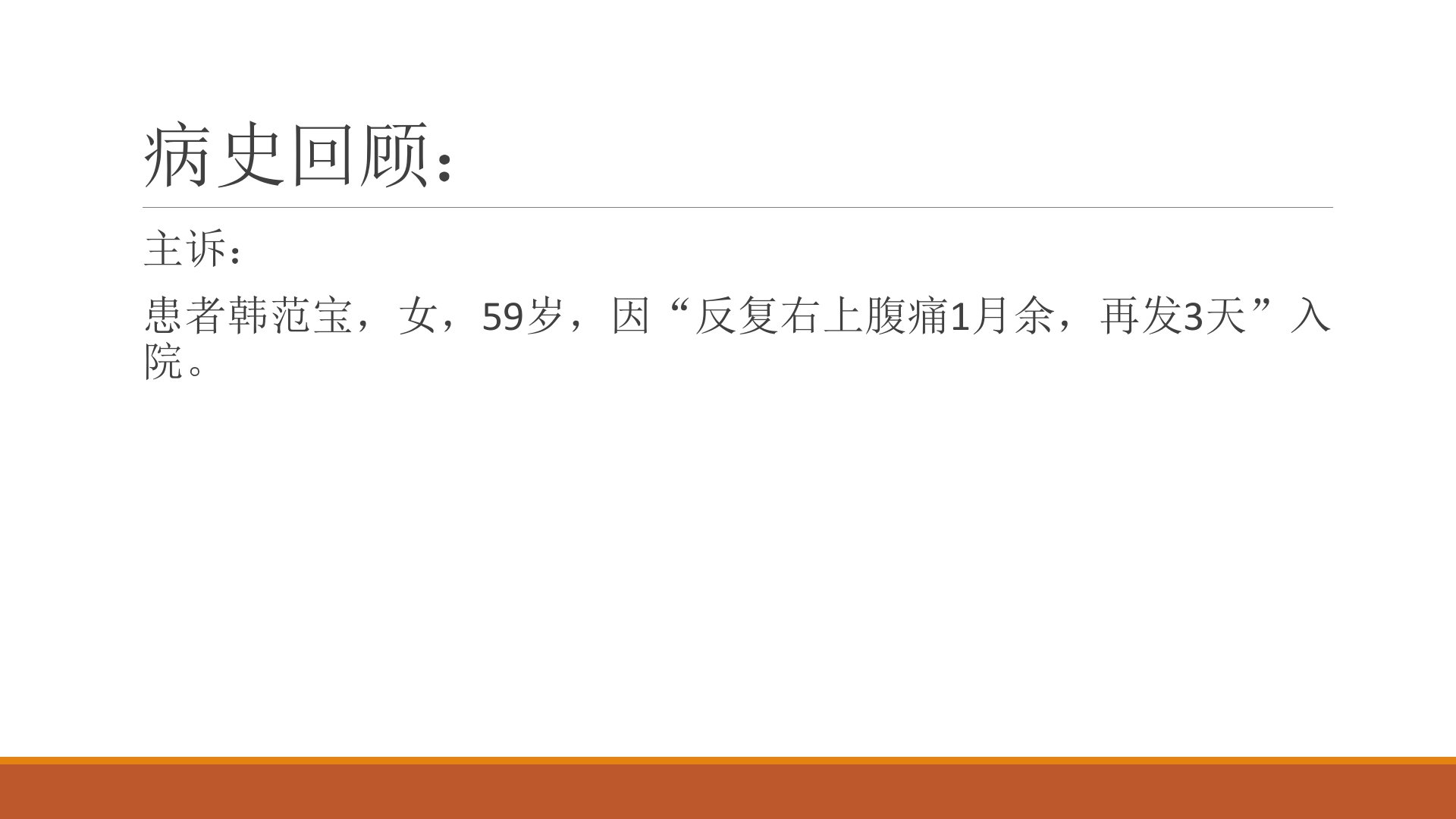 患者韩范宝女59岁因“反复右上腹痛1月余再发3天”入院。现病史:1月前出现右上腹痛查腹部CT提示胆囊结石伴胆囊炎保守治疗好转但1月来反复不适3天前再发现拟手术治疗入院。既往有胸闷不适4年余诊断为房颤、冠心病、高血压病且18年前因子宫肌瘤行剖腹子宫手术。查体见心律不齐剑突下压痛下腹部可见刀疤余无异常。院前辅助检查提示脂肪肝、胆囊泥沙样结石、冠脉血流缓慢。入院后血常规、血生化等未见明显异常凝血异常心电图示心房颤动心超提示左房增大心律失常肝胆胰脾超声及MRCP示胆囊多发结石、慢性胆囊炎。诊断为胆囊结石伴慢性胆囊炎依据病史、实验室检查及影像学检查。临床病理过程分三阶段从无症状到出现并发症再到胆囊外并发症。鉴别诊断包括胆囊息肉、胆囊腺肌症等及胃炎、肠梗阻等消化系统疾病。治疗计划包括完善检查、心内科会诊评估心脏情况考虑手术治疗首选腹腔镜胆囊切除术必要时开腹手术。