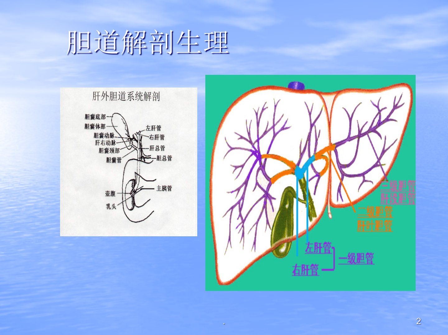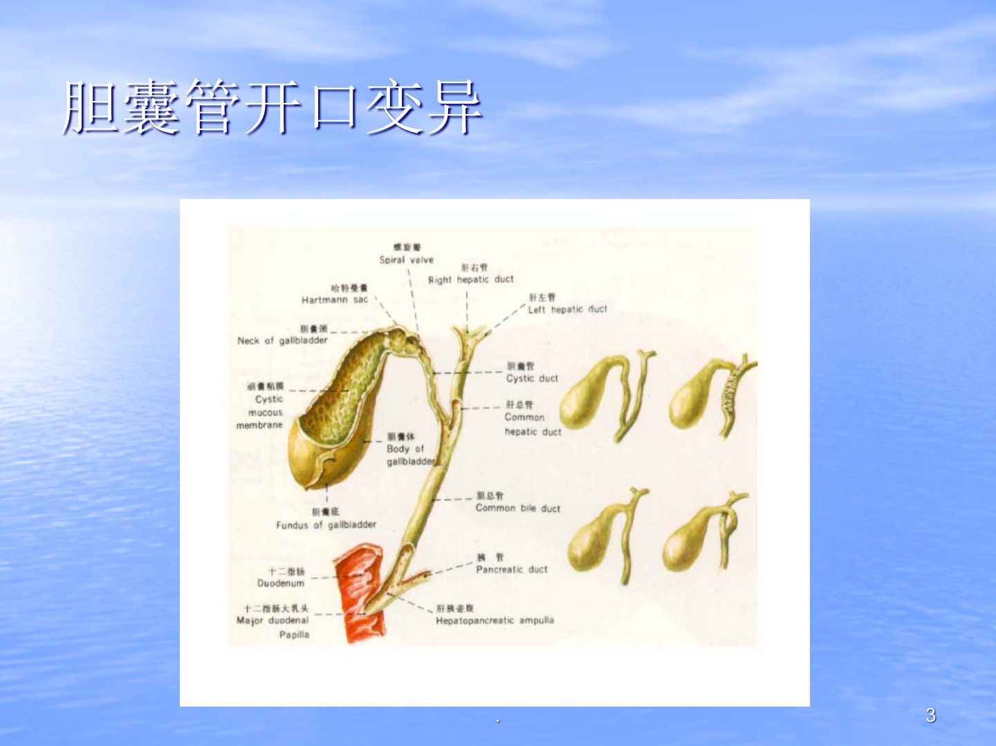 胆囊结石的诊治.胆道解剖生理.胆囊管开口变异.胆囊的生理储存胆汁浓缩功能:浓缩胆汁5~10倍。排出胆汁:胆囊收缩素(CCK)、迷走神经→收缩分泌粘液:20ml/h,保护润滑胆囊粘膜。化学和免疫功能.胆囊位于腹部的右侧,肝脏的下面。胆囊储存和浓缩肝脏产生的胆汁,并把胆汁输送到十二指肠,帮助脂肪消化。胆汁从胆囊经胆囊管及胆总管排入十二指肠内.胆道疾病特殊检查:B超B超型超声波检查:首选适用于胆道结石、肿瘤、黄疸的鉴别诊断。检查前需空腹8小时以上,检查前晚清淡饮食检查前可服缓泻剂或灌肠排便以减少肠道气体光团和声影,测量胆囊的大小,且可通过胆管的“靶环征”测定胆管横断面直径,判断胆管扩张及其梗阻部位。...