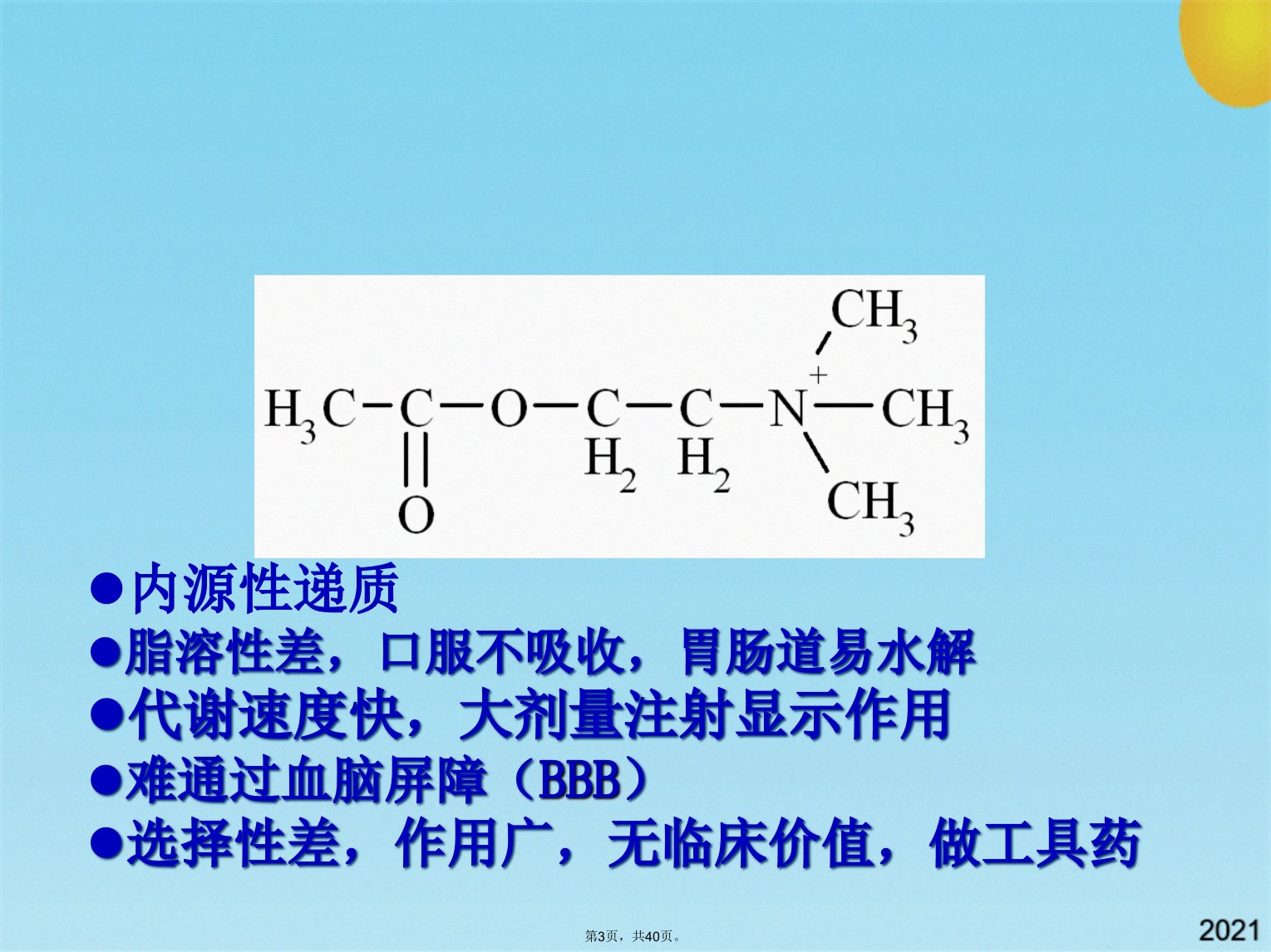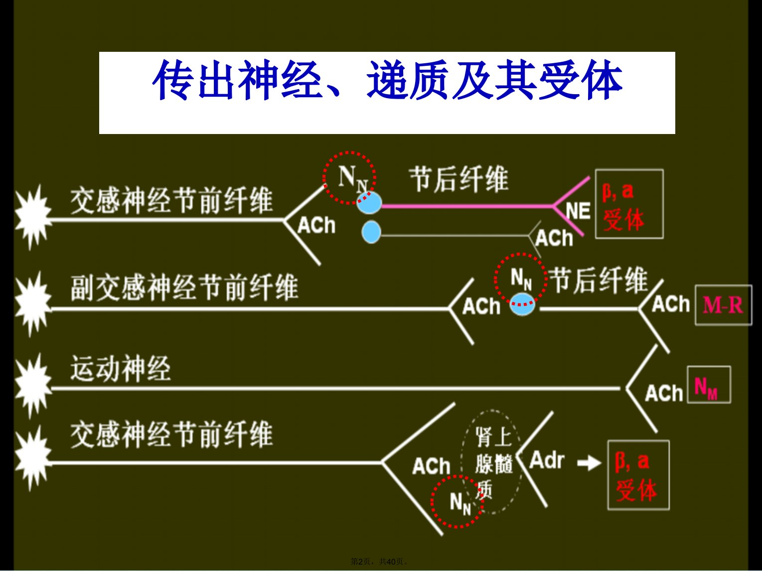 胆碱受体激动药与抗胆碱酯酶药第1页,共40页。传出神经、递质及其受体第2页,共40页。第一节M,N胆碱受体激动药乙酰胆碱(Ach):内源性递质脂溶性差,口服不吸收,胃肠道易水解代谢速度快,大剂量注射显示作用难通过血脑屏障(BBB)选择性差,作用广,无临床价值,做工具药第3页,共40页。M样作用小剂量Ach能激动M受体副交感神经节后纤维Ach剂量稍大时,激动M受体,也激动N受体副交感神经、交感、运动终板、肾上腺N样作用兴奋M、N受体时,优势支配???第4页,共40页。M样作用的临床表现心血管功能抑制舒张血管:EDRF负性肌力作用负性频率作用负性传导作用平滑肌收缩:支气管、胃肠道及膀胱等平滑肌收缩...