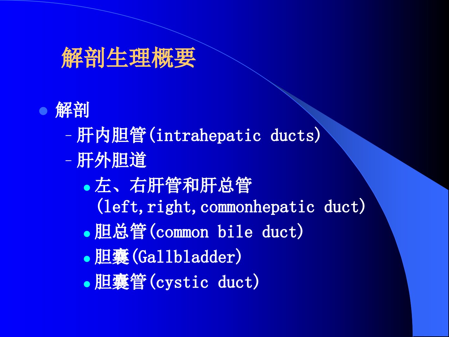 胆道疾病Biliarytract解剖生理概要解剖肝内胆管(intrahepaticducts)肝外胆道左、右肝管和肝总管(left,right,commonhepaticduct)胆总管(commonbileduct)胆囊(Gallbladder)胆囊管(cysticduct)血液供应:胆囊A来自于肝右A,少数起自肝固有A或肝左A。胆囊静脉汇入门静脉。神经支配:来自腹腔N丛分出的迷走N和交感N,手术中过度牵拉可诱发胆心反射。胆管壁的组织构成:粘膜层、平滑肌和弹力纤维层、浆膜层。胆囊壁的组织构成:粘膜层、肌层、外膜层。胆道的生理功能:胆道有分泌、贮存、浓缩、输送胆汁功能,对排入十二指肠起重要调节...