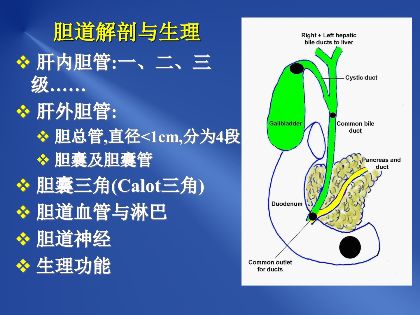 胆道疾病涉及肝内外胆管的多种病变。胆道解剖与生理是理解疾病的基础辅助检查方法包括BusXray平片、上腹静脉造影、PTC、PTCD、ERCP、CT、MRI等。胆道疾病中胆囊结石常见分胆固醇性、胆色素性及混合性女性多于男性临床表现多样无症状者治疗存在争议。肝外胆管结石分原发与继发病理导致梗阻、感染表现为腹痛、发热、黄疸需手术取石、解除狭窄、通畅引流。肝内胆管结石病因复杂与肝外胆管结石表现相似治疗原则相同。胆道感染包括急性结石性胆囊炎由细菌感染等因素导致需保守或手术治疗;急性非结石性胆囊炎病因不明但坏死穿孔率高多需切除造瘘。急性梗阻性化脓性胆管炎病情严重需紧急解除梗阻、引流胆道。胆道肿瘤中胆囊息肉分肿瘤性与非肿瘤性恶性可能大者需手术;胆囊癌病因不明诱因多样治疗包括单纯胆囊切除、根治术及姑息手术五年生存率低;胆管癌典型症状为无痛性黄疸治疗依部位而定疗效不一。