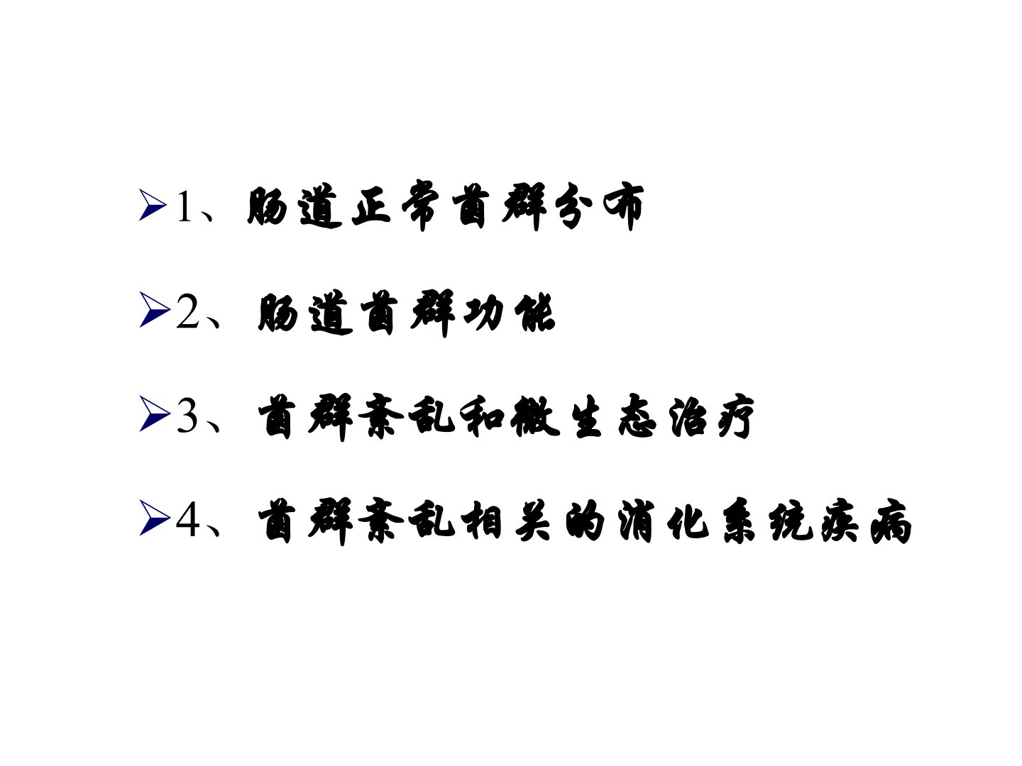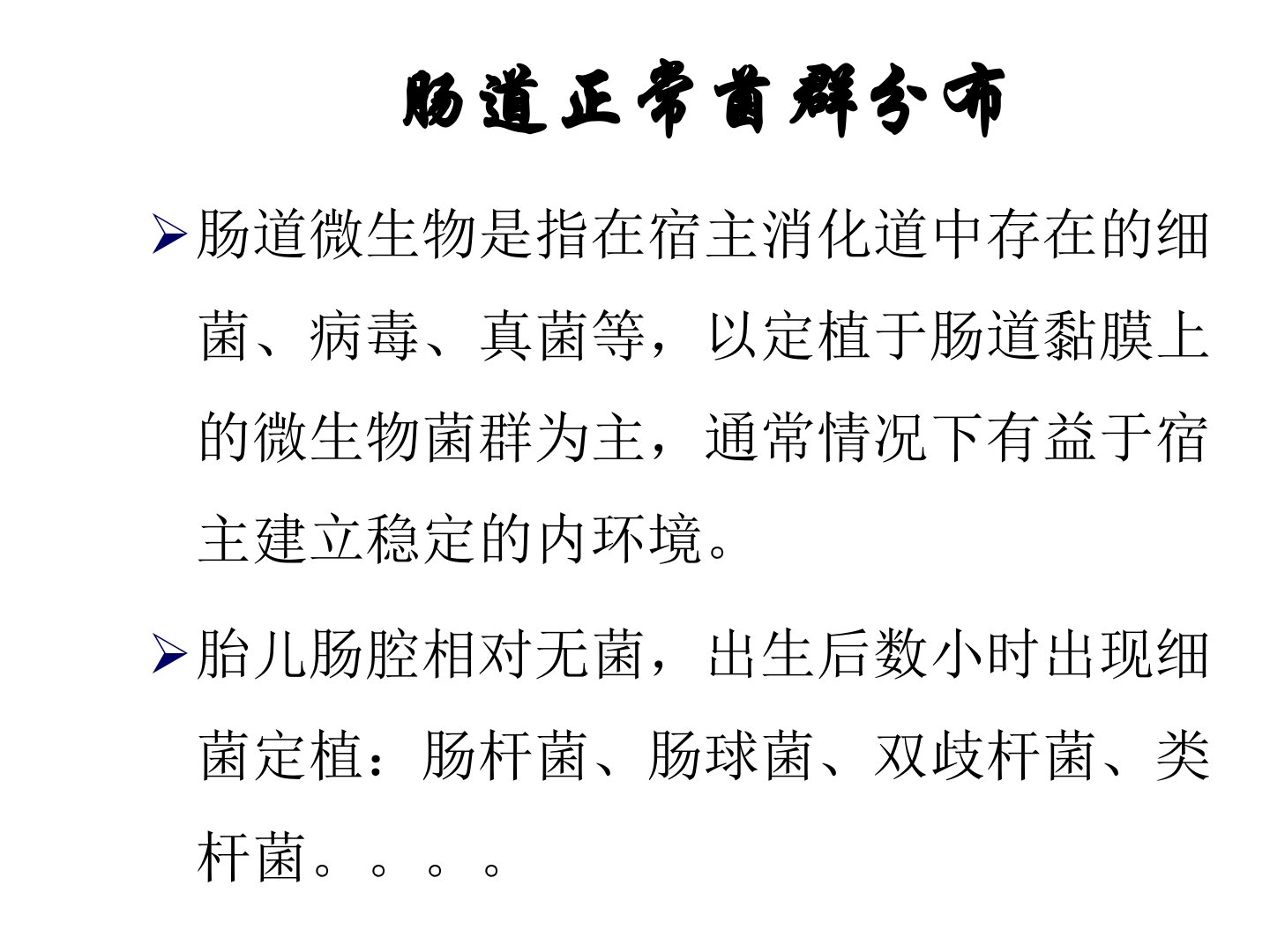 肠道微生物和消化系统疾病摘要健康人全身寄生微生物达1271g其中肠道微生物最多达1000g总数为100亿个相当于人体细胞数的10倍。肠道菌群包括需氧菌、兼性厌氧菌和厌氧菌厌氧菌是需氧菌的1000倍。肠道菌群作用包括生物屏障、化学屏障、免疫调节和营养代谢。肠道菌群紊乱分轻、中、重度。轻度为潜伏性菌群失调病因去除后即可恢复;中度类似慢性肠炎一般不能自然恢复;重度则原籍菌大部分被抑制少数菌种过度繁殖必须积极治疗。微生态制剂特点包括能粘附于人体胃肠黏膜细胞并定植、在胃酸和胆汁中有良好稳定性等。分类包括益生菌、益生元和合生元。益生菌如双歧杆菌、乳杆菌等;益生元如低聚果糖等;合生元则是益生菌和益生元并存制剂。菌群紊乱可引起腹泻、肠易激综合征、炎症性肠病、肠源性内毒素血症等消化系统疾病。