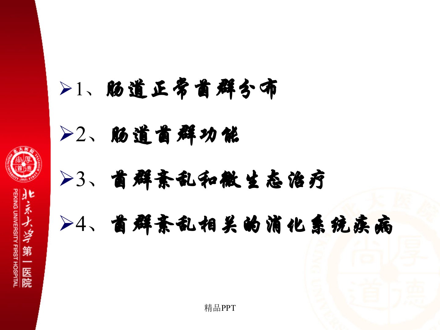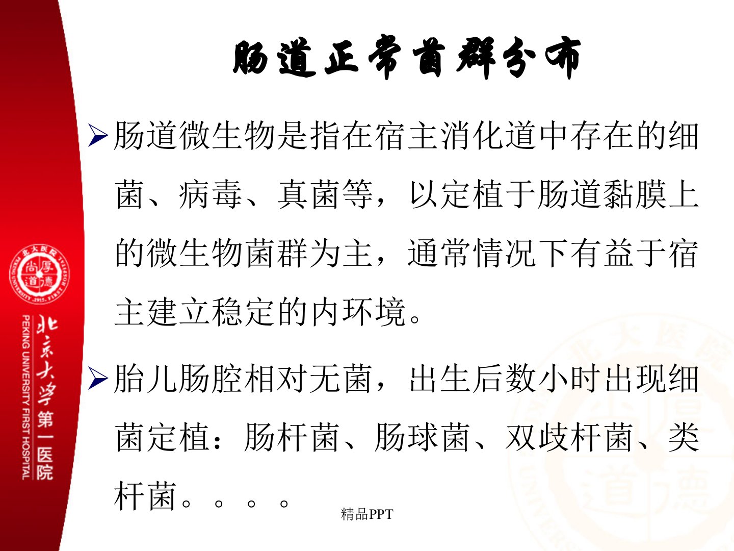 肠道微生物和消化系统疾病摘要北京大学第一医院介绍了肠道微生物与消化系统疾病相关知识。首先阐述了肠道正常菌群分布胎儿肠腔相对无菌出生后数小时细菌开始定植健康人肠道微生物重量达1Kg左右其中厌氧菌是需氧菌的1000倍可分为原籍菌、共生菌和外籍菌。胃、小肠、回肠等不同部位细菌数量和种类有差异。正常情况下肠道菌群不致病但宿主功能或外界理化改变可致肠道微环境紊乱而致病。肠道菌群具有生物屏障、化学屏障、免疫调节、营养代谢等作用。菌群紊乱分轻、中、重度有过路菌增多等表现及相应症状。微生态制剂有口服能定植、稳定性好等特点分益生菌、益生元、合生元三类列举了多种制剂及有效菌种还说明了使用原则。最后指出菌群紊乱与腹泻、肠易激综合征、炎症性肠病等多种消化系统疾病相关介绍了相应疾病的治疗方式。