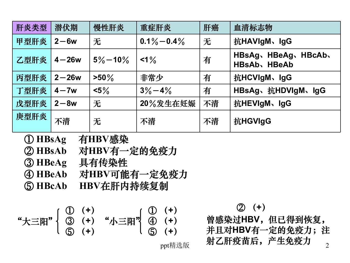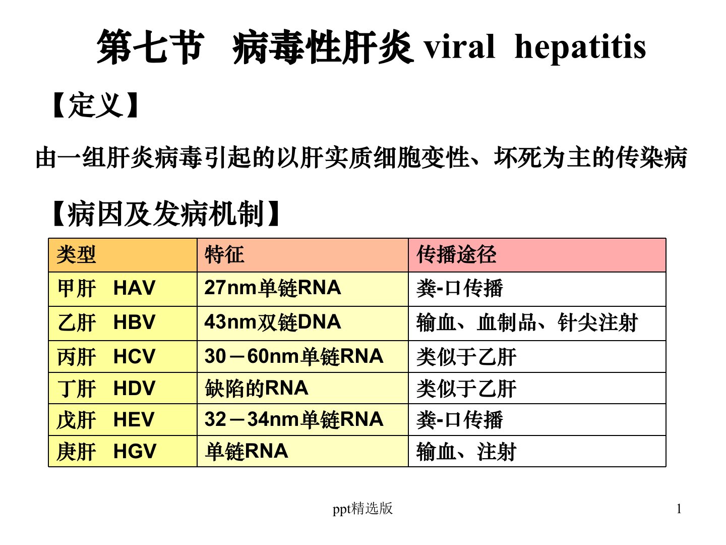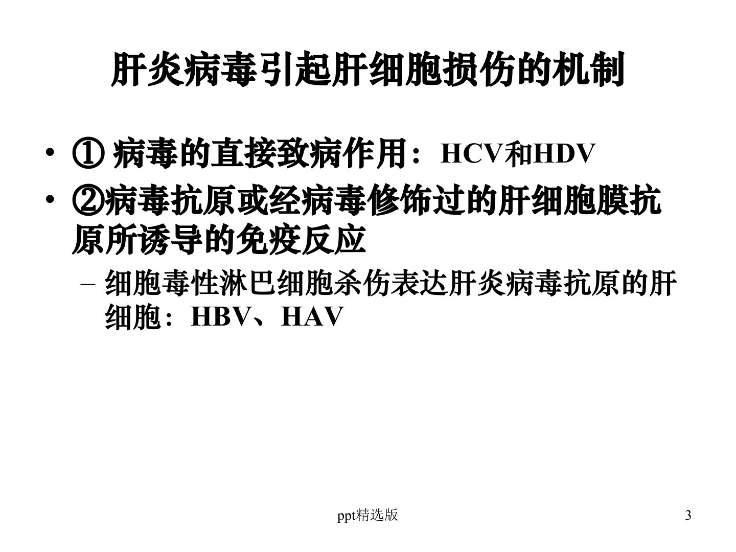 第七节病毒性肝炎viralhepatitis【病因及发病机制】ppt精选版①HBsAg有HBV感染②HBsAb对HBV有一定的免疫力③HBeAg具有传染性④HBeAb对HBV可能有一定免疫力⑤HBcAbHBV在肝内持续复制①(+)③(+)⑤(+)①(+)④(+)⑤(+)②(+)曾感染过HBV,但已得到恢复,并且对HBV有一定的免疫力;注射乙肝疫苗后,产生免疫力ppt精选版肝炎病毒引起肝细胞损伤的机制①病毒的直接致病作用:HCV和HDV②病毒抗原或经病毒修饰过的肝细胞膜抗原所诱导的免疫反应细胞毒性淋巴细胞杀伤表达肝炎病毒抗原的肝细胞:HBV、HAVppt精选版轻微炎症静止的淋巴细胞聚集在门管区周...