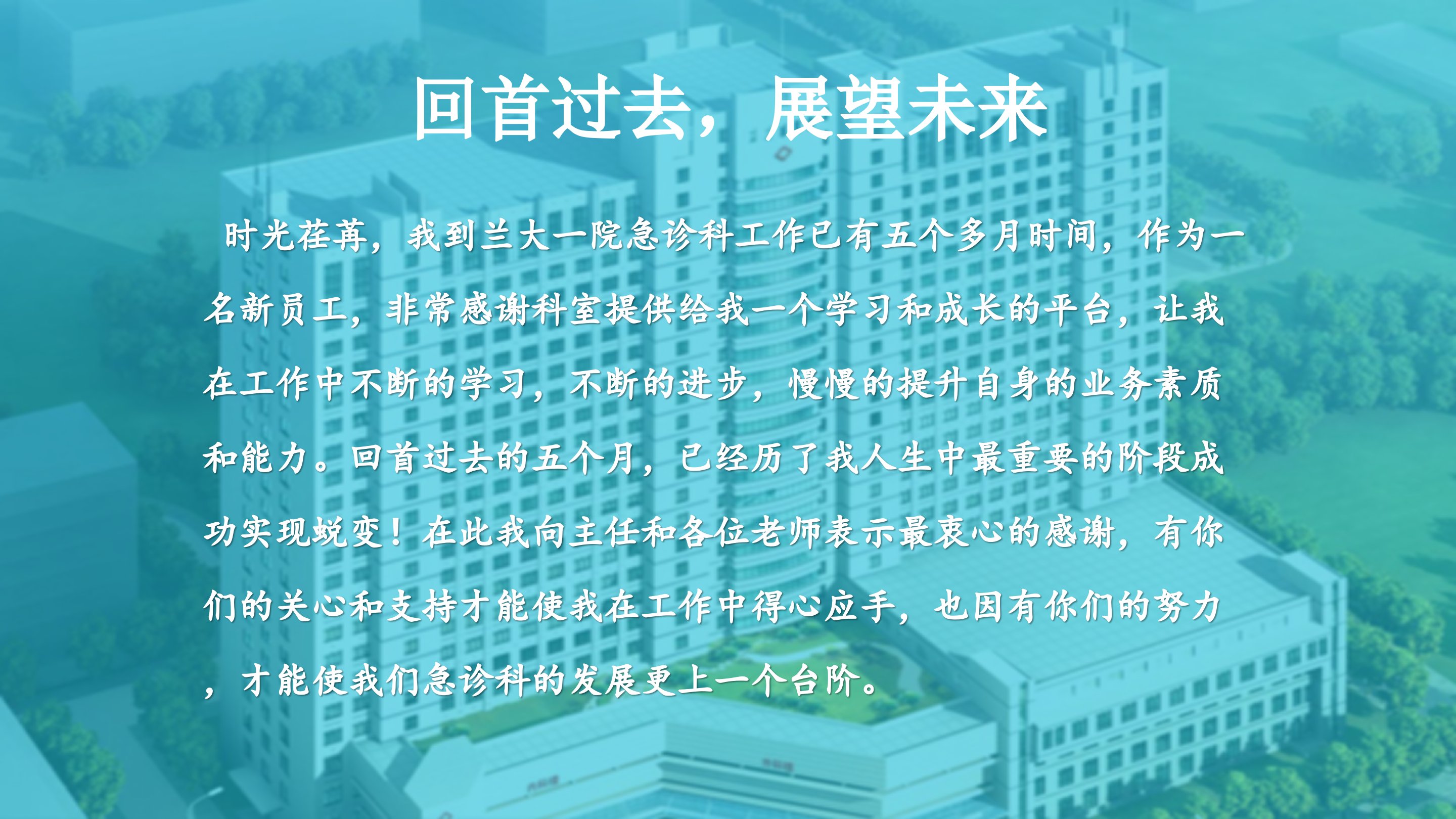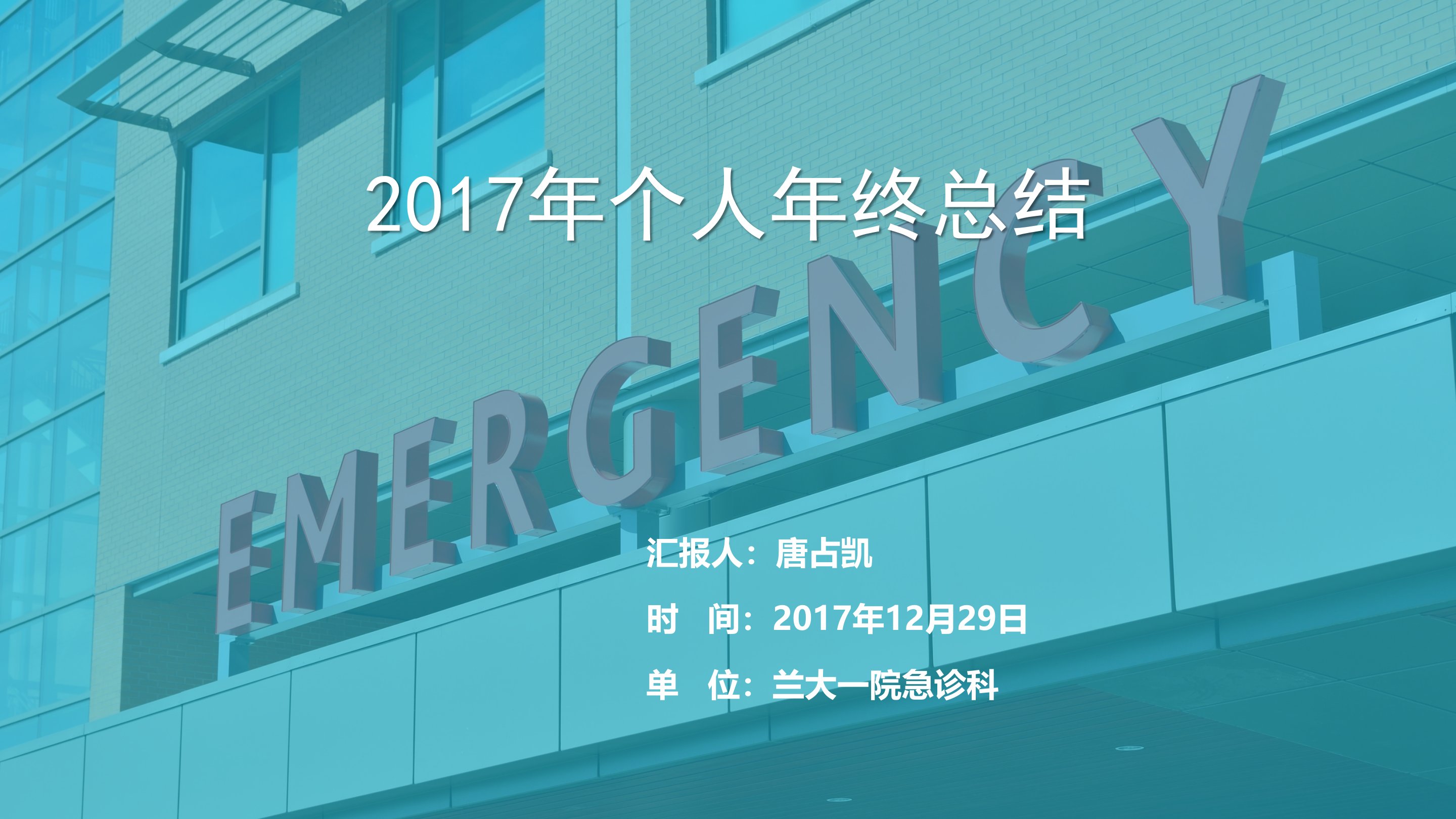 兰大一院急诊科医生唐占凯在2017年个人年终总结中回顾了过去五个月的工作经历与成长。他感谢科室提供的学习与成长平台使他业务素质和能力得以提升。2017年8月唐占凯随主任和老师参加了中国医师协会急诊医师分会年会学习了急诊医学多个方面的专场讲座还参加了甘肃省野外应急急救大赛贡献了力量收获了喜悦。他深刻理解了急诊科工作的特点包括时间依赖性、病情急危重杂、对医生综合素质要求高等。同时他总结了个人工作中的不足如经验欠缺、态度不认真、忽略细节等并提出了改进措施。展望2018年他计划加强急诊医学理论和工作制度的学习提高业务技术和应急抢救能力紧跟医学潮流提升综合素质和沟通交流能力构建和谐医患关系成长为心灵强大的人。他认为急诊是救人最多的职业将坚守医学誓言除人类病痛助健康完美。