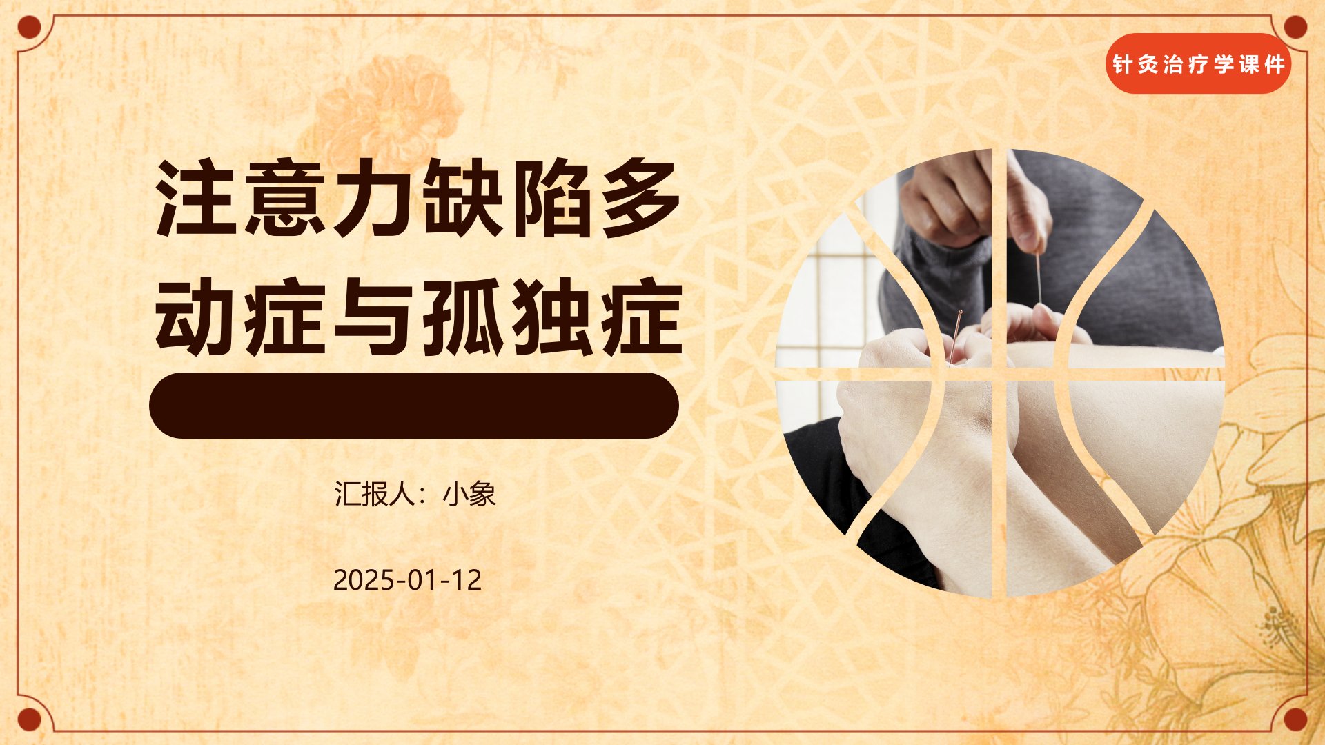 注意力缺陷多动症与孤独症摘要汇报人小象从三方面展开介绍。1注意力缺陷多动症:又称小儿多动症以注意力不集中、自我控制力差等为主要特征智力正常但伴学习困难。其发生与先天禀赋不足、后天护养不当等多种因素有关病位在心、脑与肝、脾、肾关系密切基本病机是心神失养或元神受扰。辨证要点分心脾两虚、肾虚肝亢、痰火内扰三型。治疗以调神定志为主取督脉穴及手少阴、手厥阴经穴为主配合其他疗法。针灸治疗效果显著家长和教育者应配合心理治疗帮助患者养成良好习惯。2孤独症:又称自闭症是广泛性发育障碍性疾病病因多因先天不足基本病机是元神失养、痰火扰心以社会交往障碍等为临床特征。3治疗前景:针灸治疗孤独症仍在探索但已取得一定疗效可配合相关教育和训练后者在治疗中至关重要。